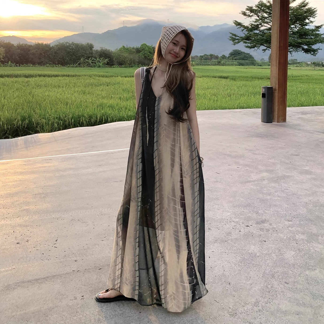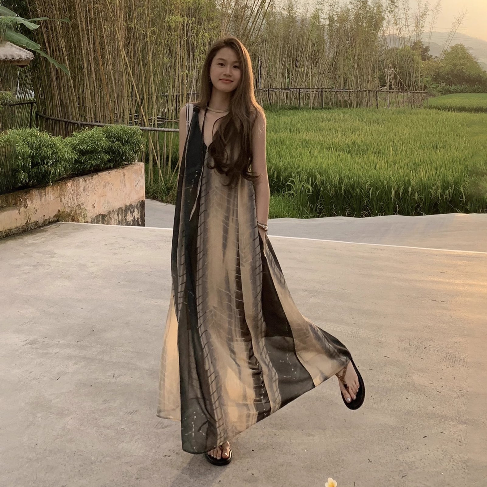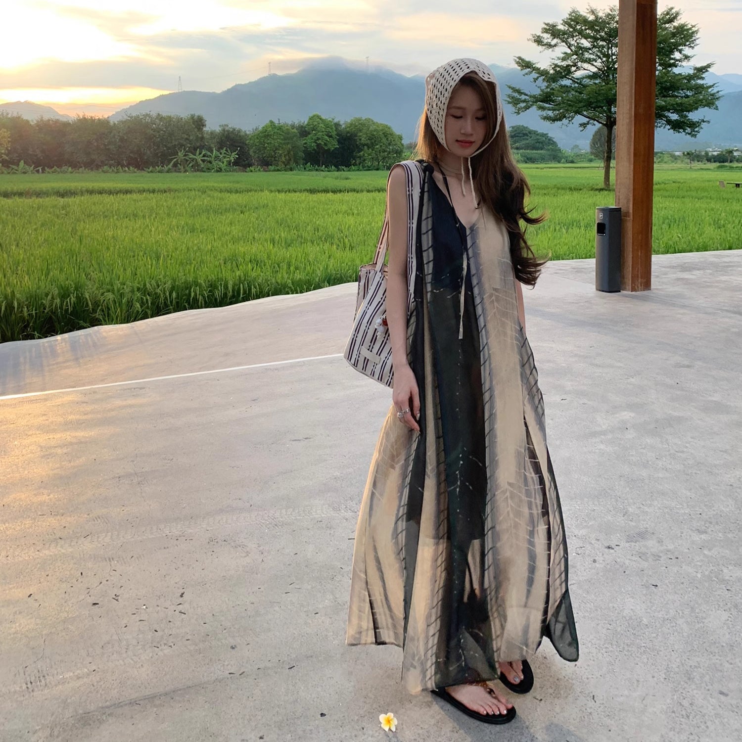 【ワンピース】アートプリント × デザイン感のある 夏用ノースリーブ Vネック タンクトップ風ロングワンピース【SHシリーズ】