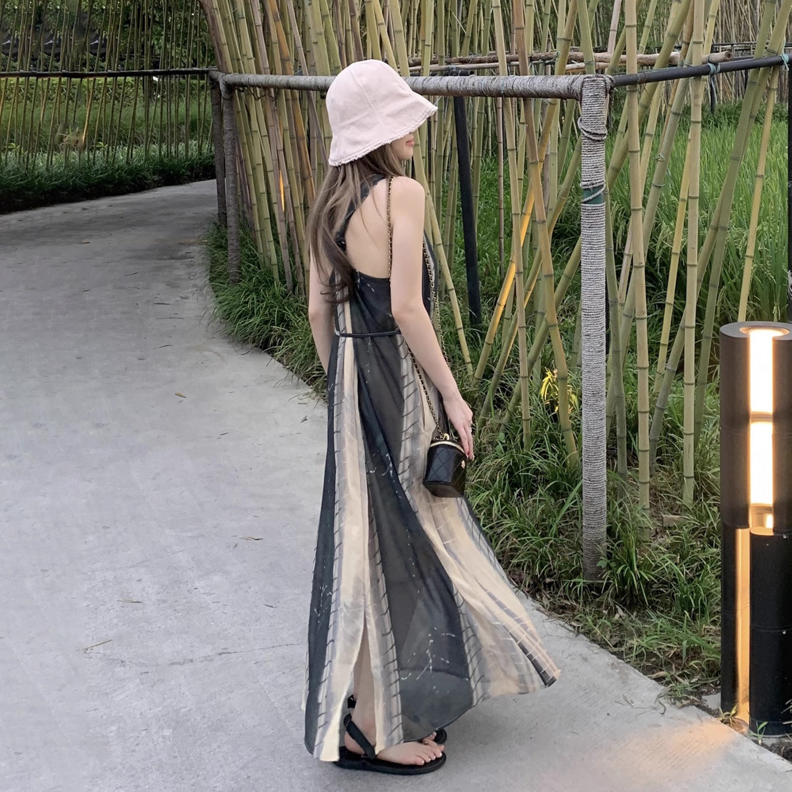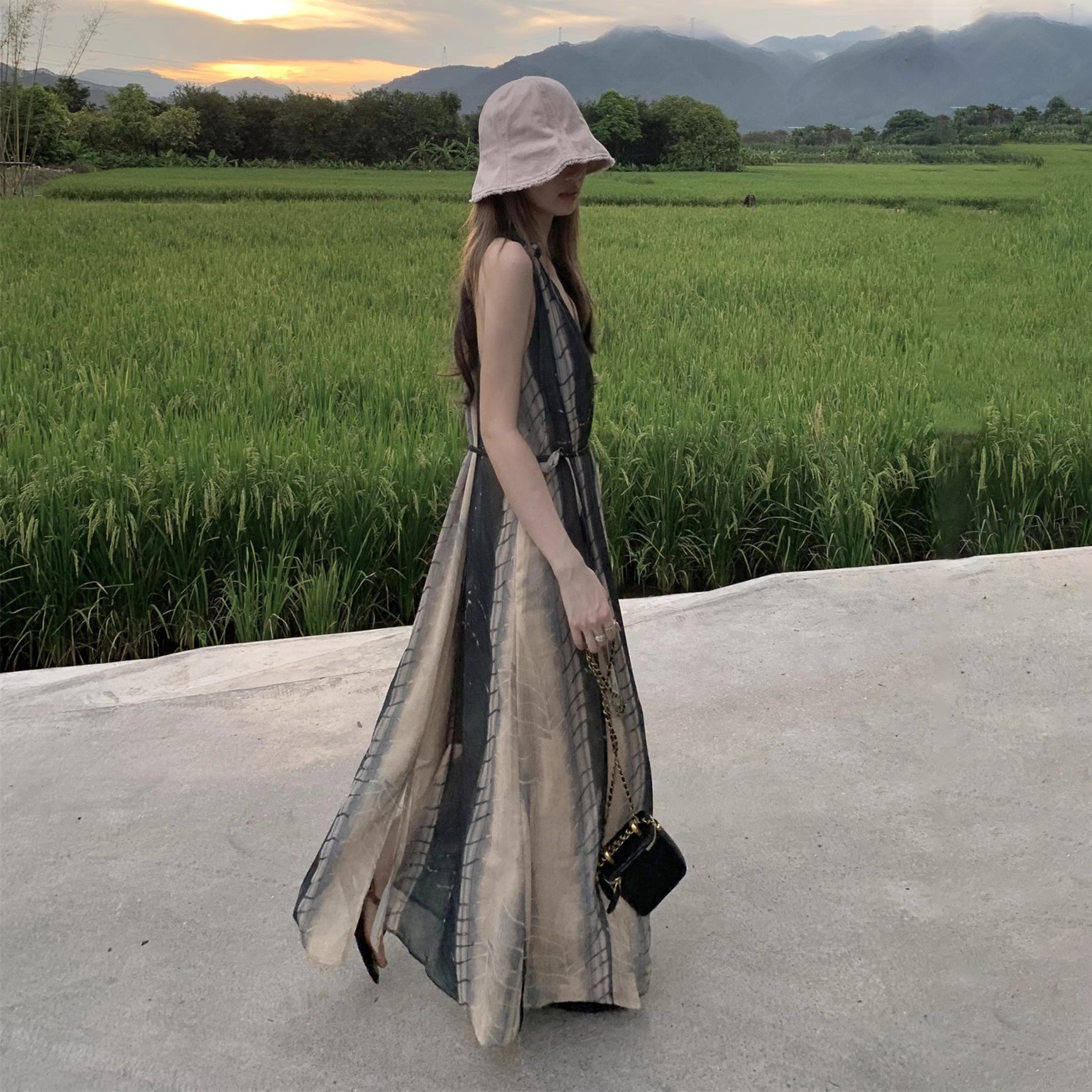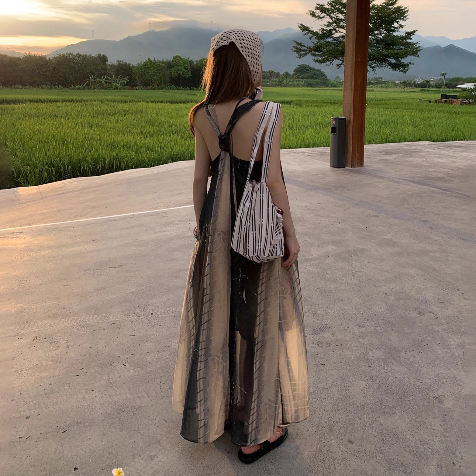 【ワンピース】アートプリント × デザイン感のある 夏用ノースリーブ Vネック タンクトップ風ロングワンピース【SHシリーズ】