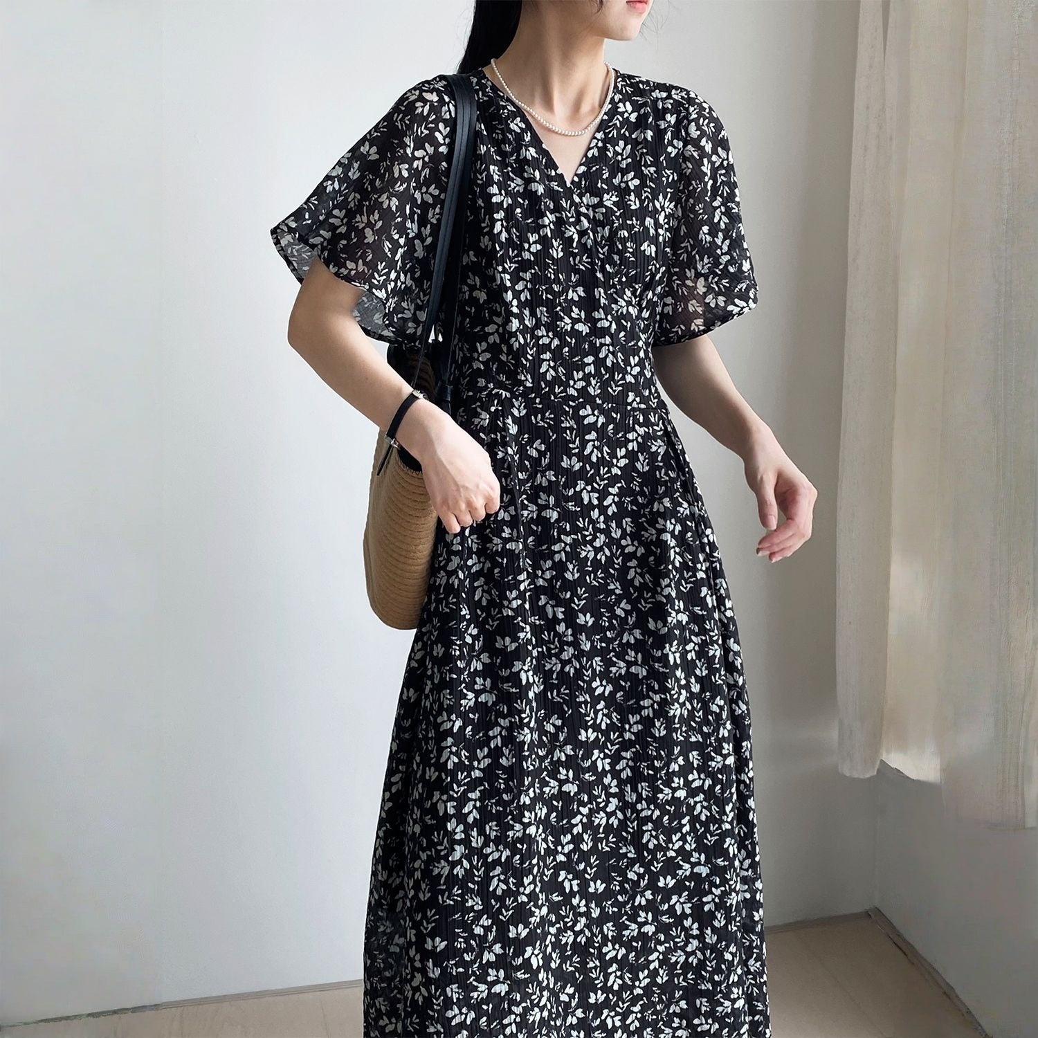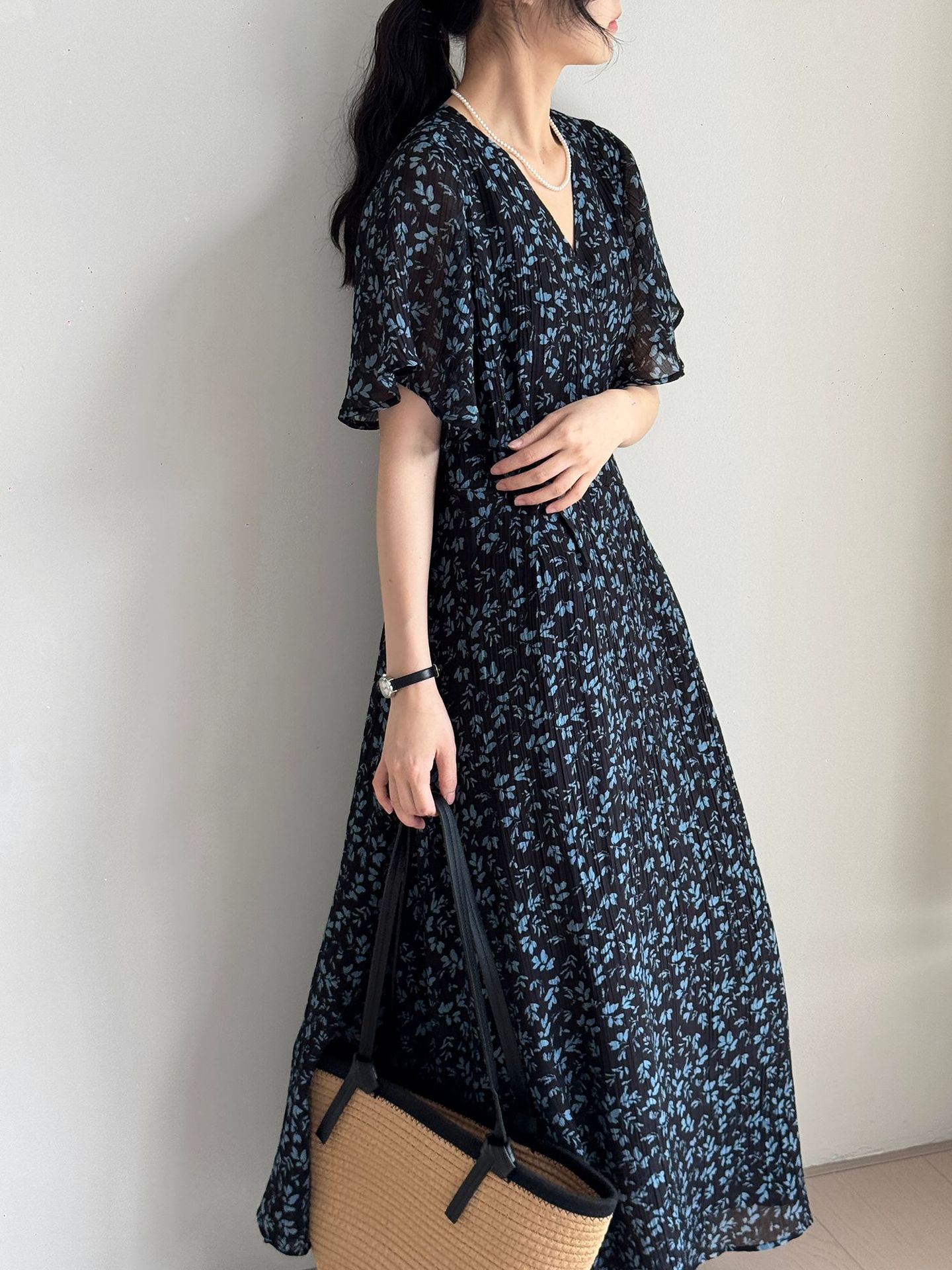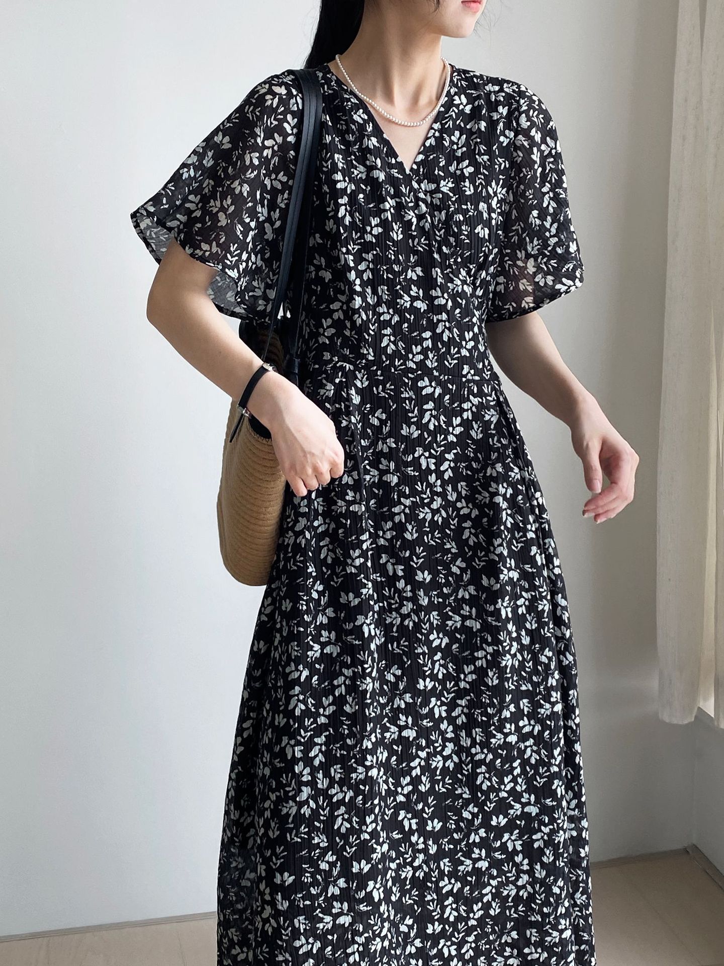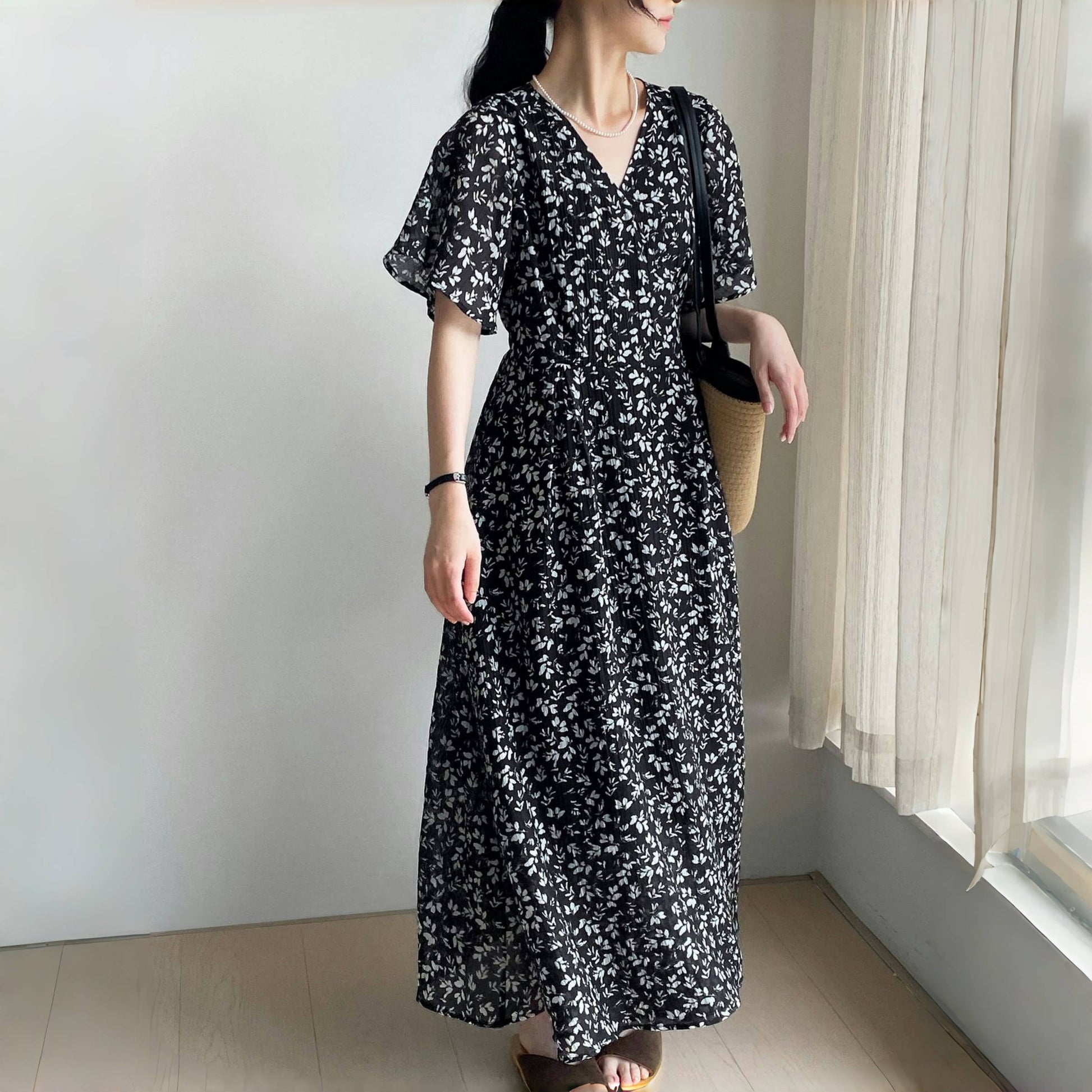【商品名】【ワンピース】夏 Vネック ウエストリボン 花柄 半袖 ワンピース 【SHシリーズ】