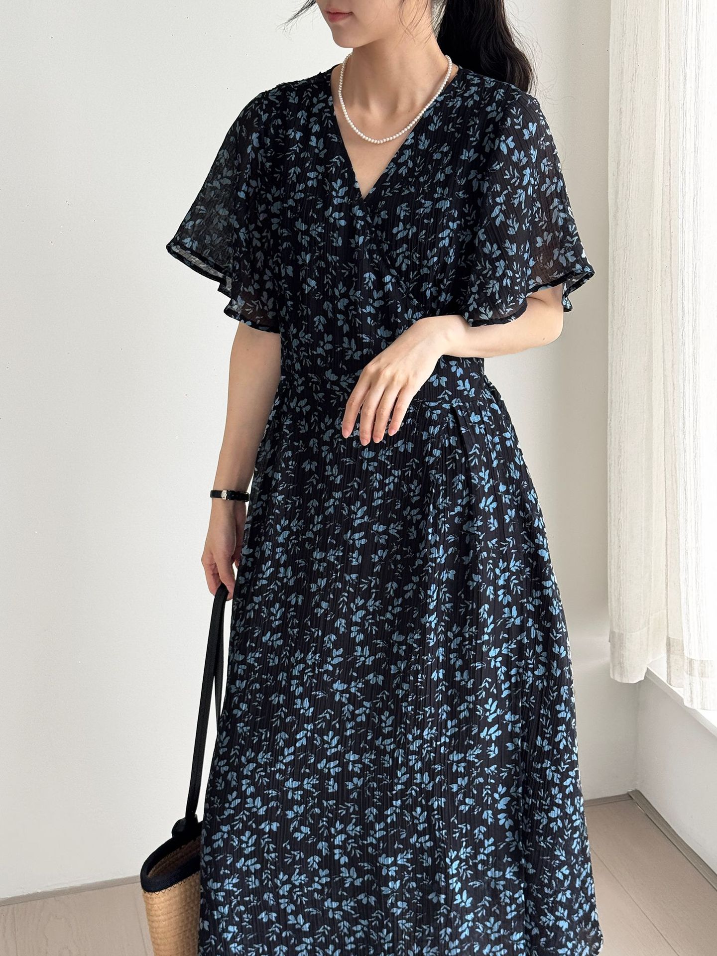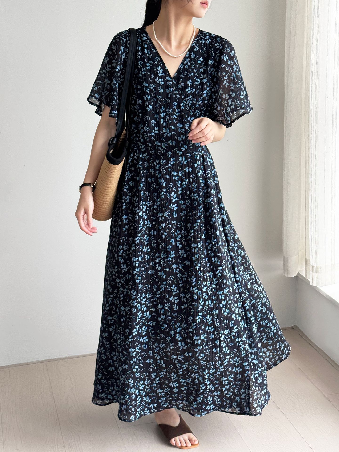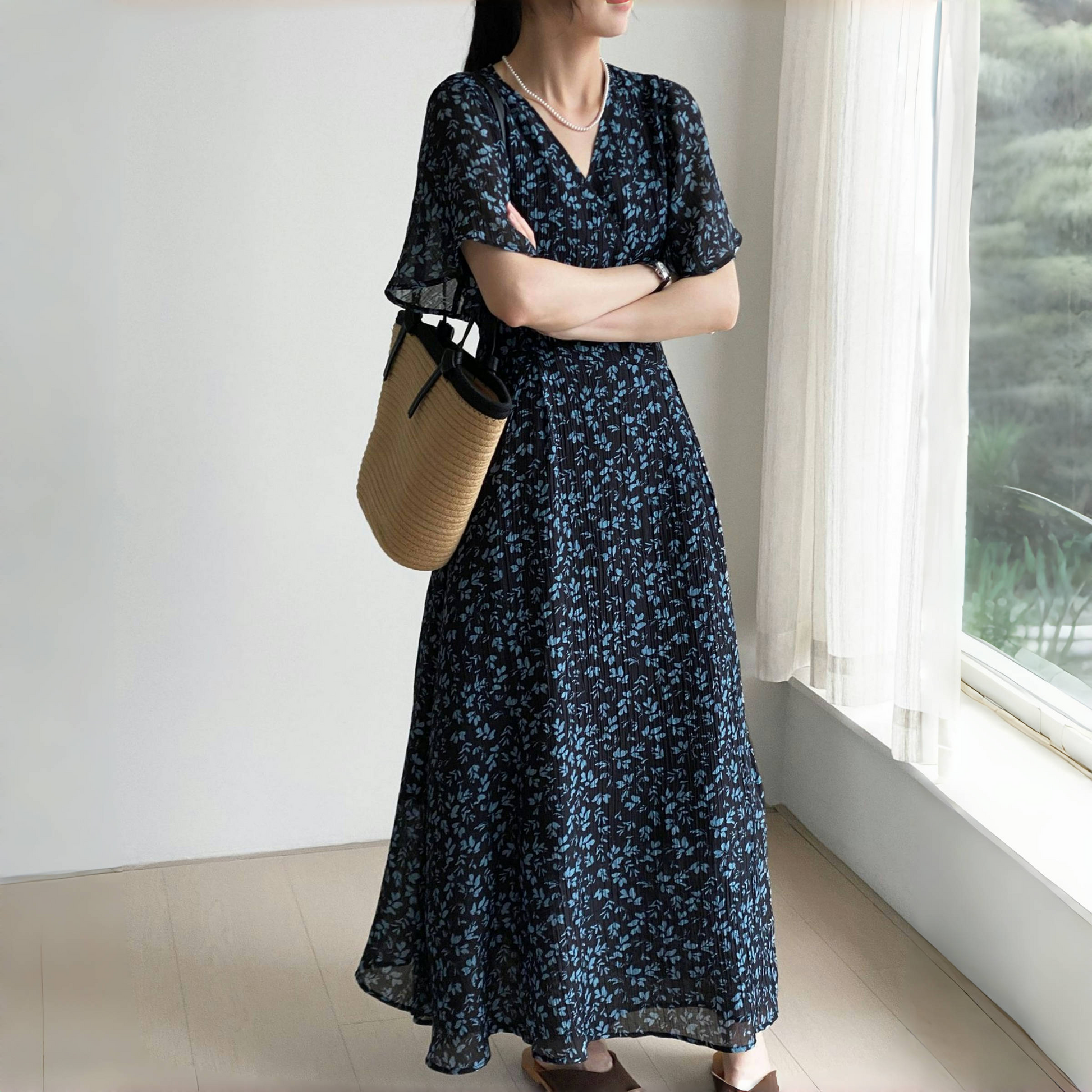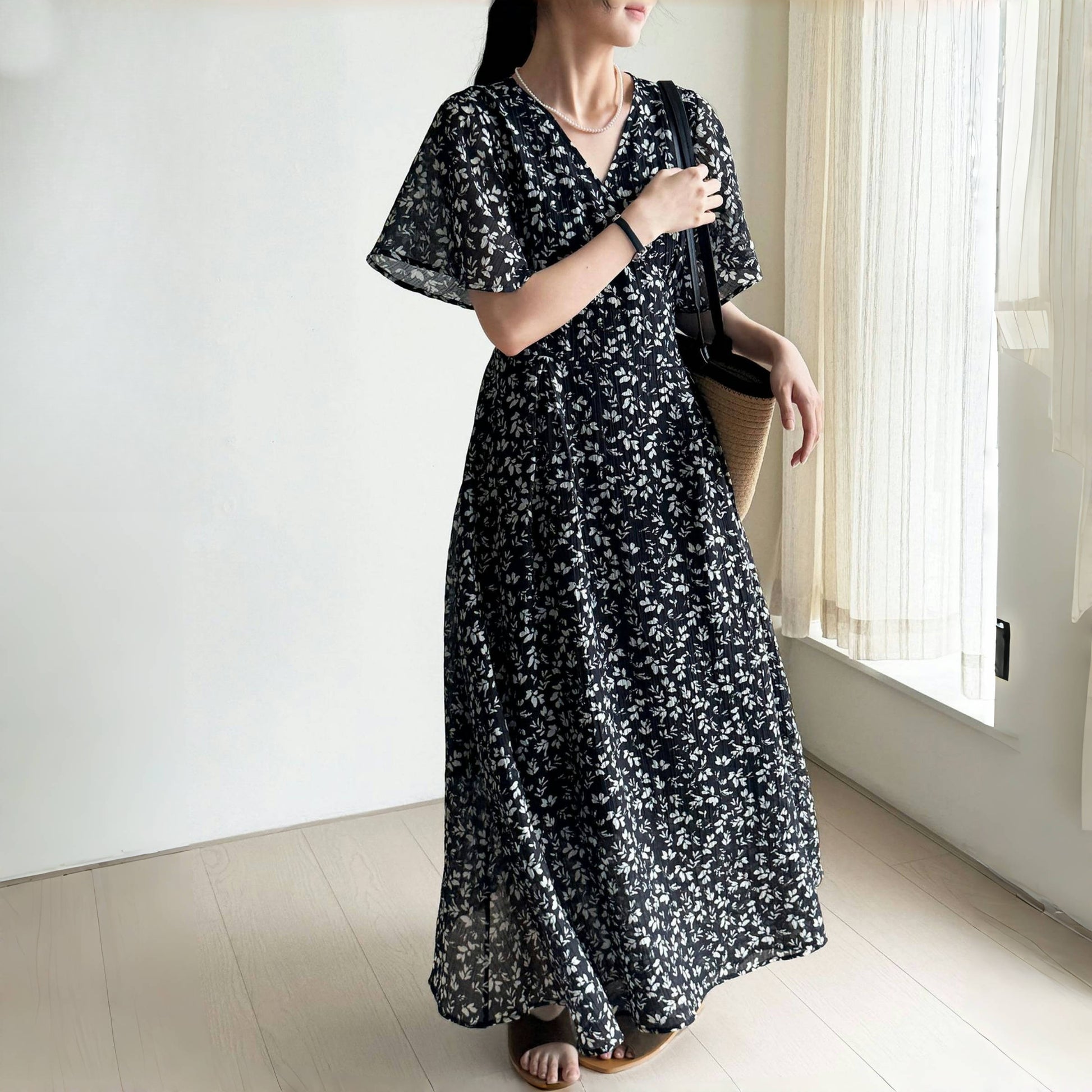 【商品名】【ワンピース】夏 Vネック ウエストリボン 花柄 半袖 ワンピース 【SHシリーズ】