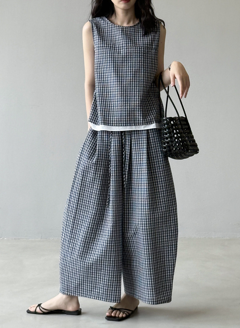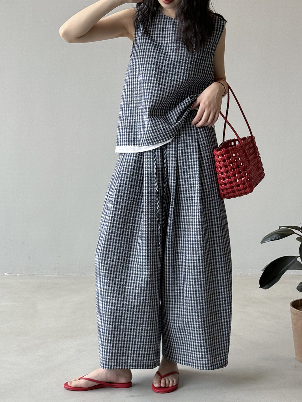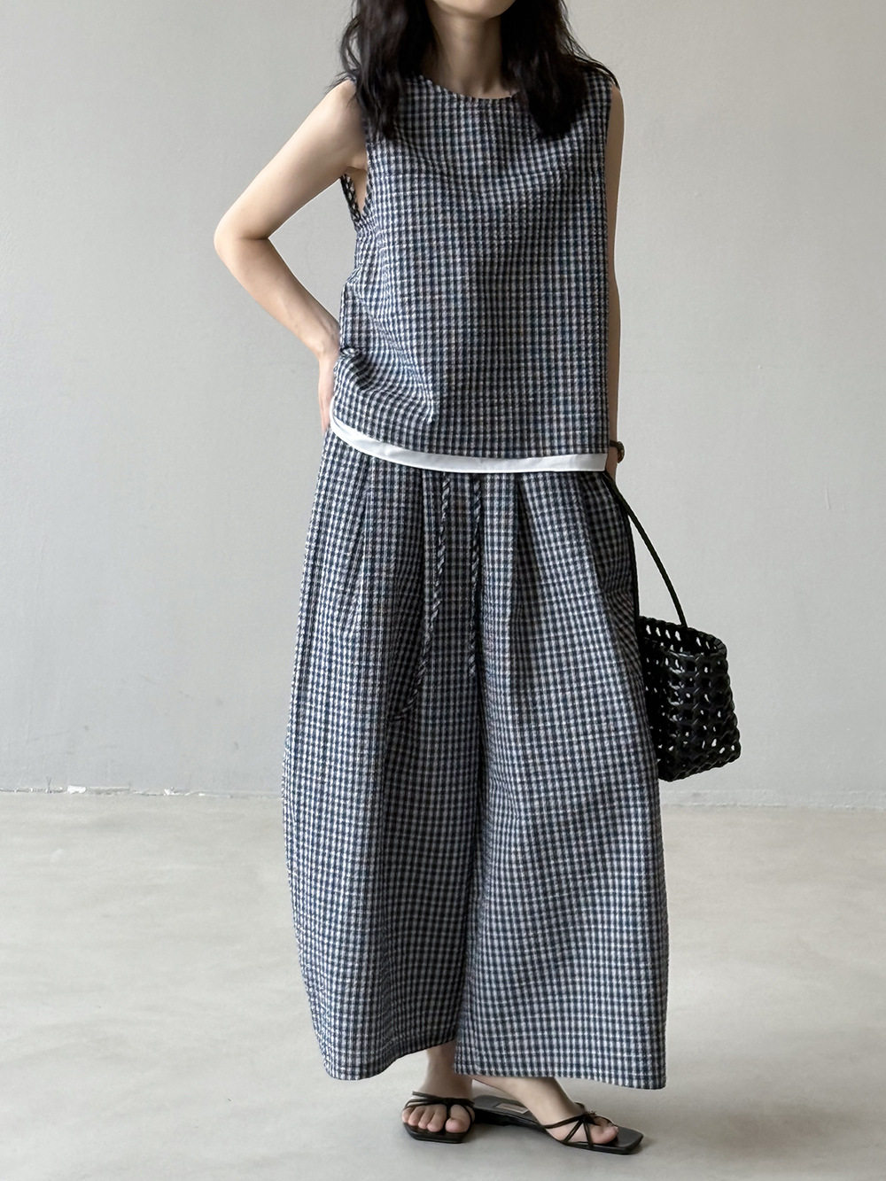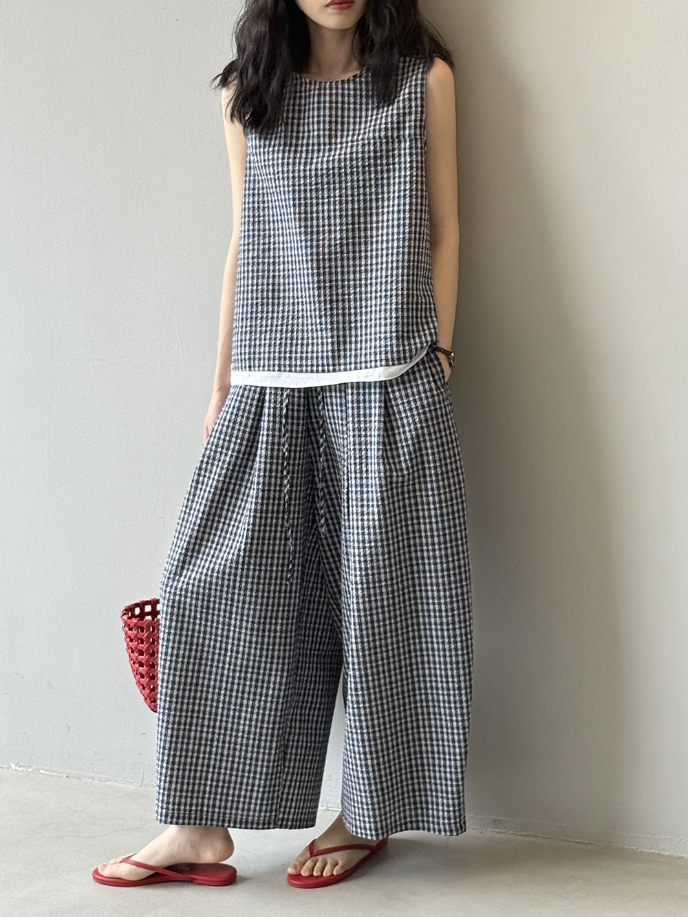 2点セット!【セットアップ】韓国風 チェック柄タンクトップ風セット+ゆったりカジュアルパンツ 上下セット【JZシリーズ】