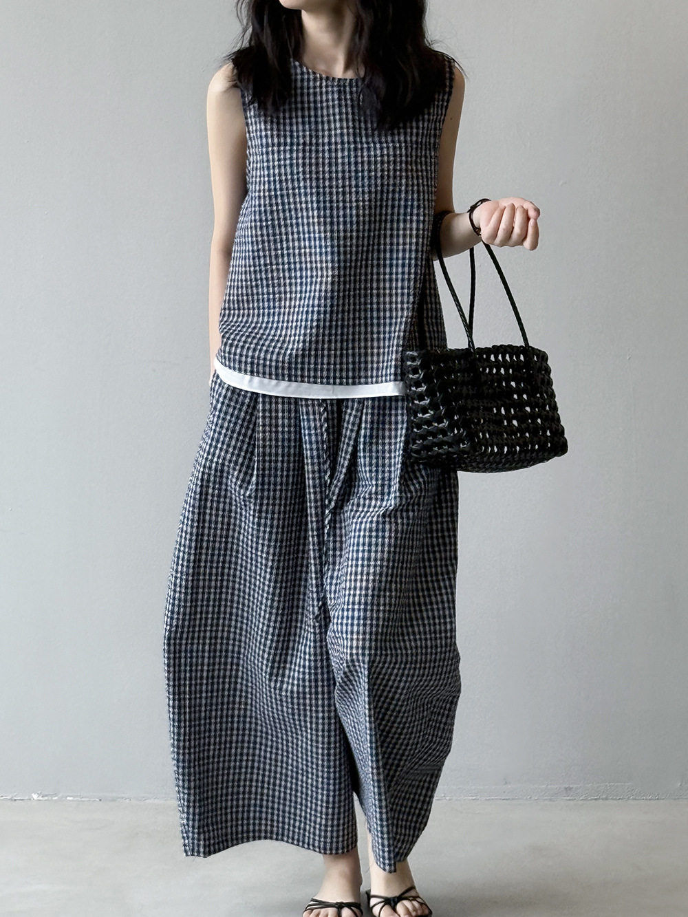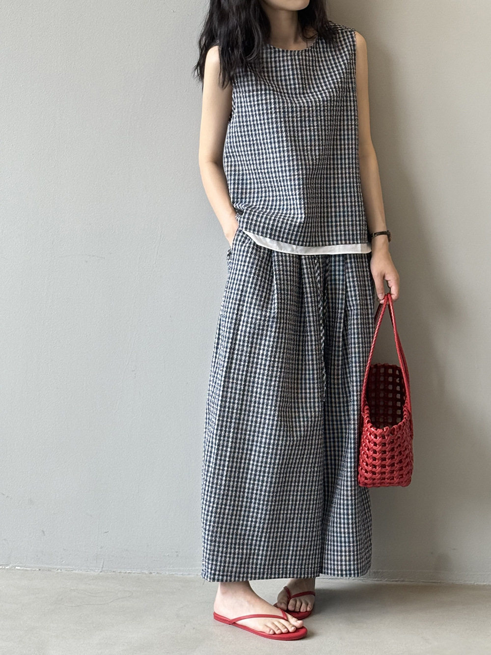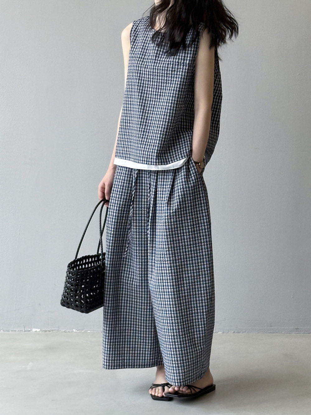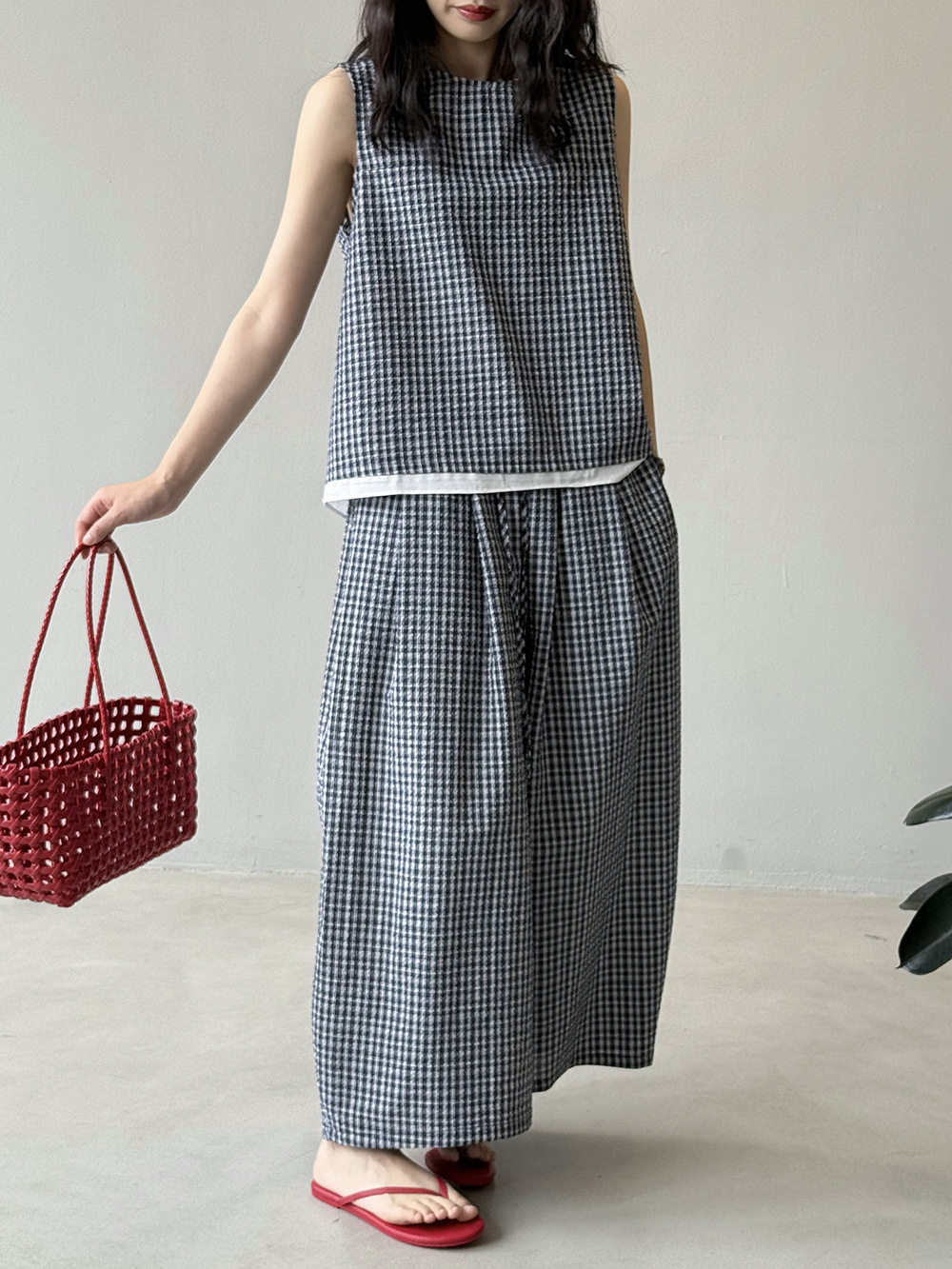 2点セット!【セットアップ】韓国風 チェック柄タンクトップ風セット+ゆったりカジュアルパンツ 上下セット【JZシリーズ】