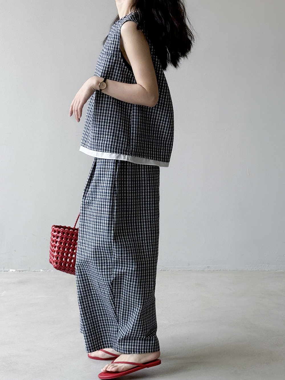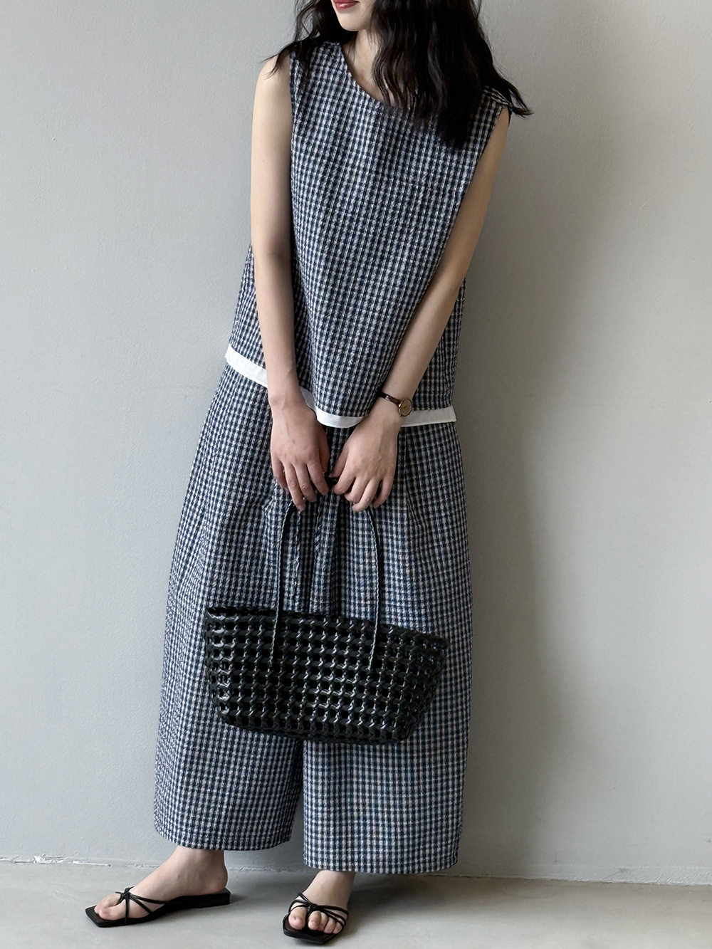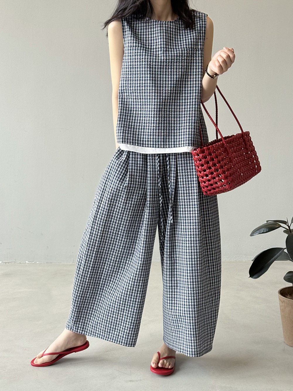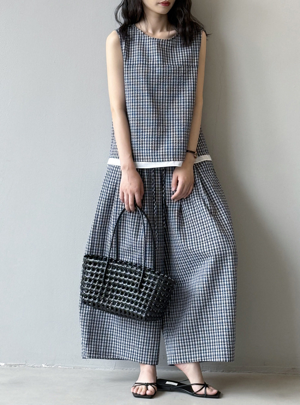 2点セット!【セットアップ】韓国風 チェック柄タンクトップ風セット+ゆったりカジュアルパンツ 上下セット【JZシリーズ】