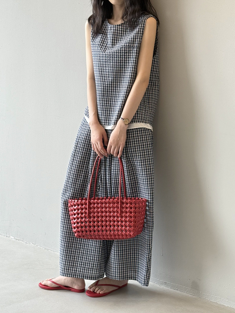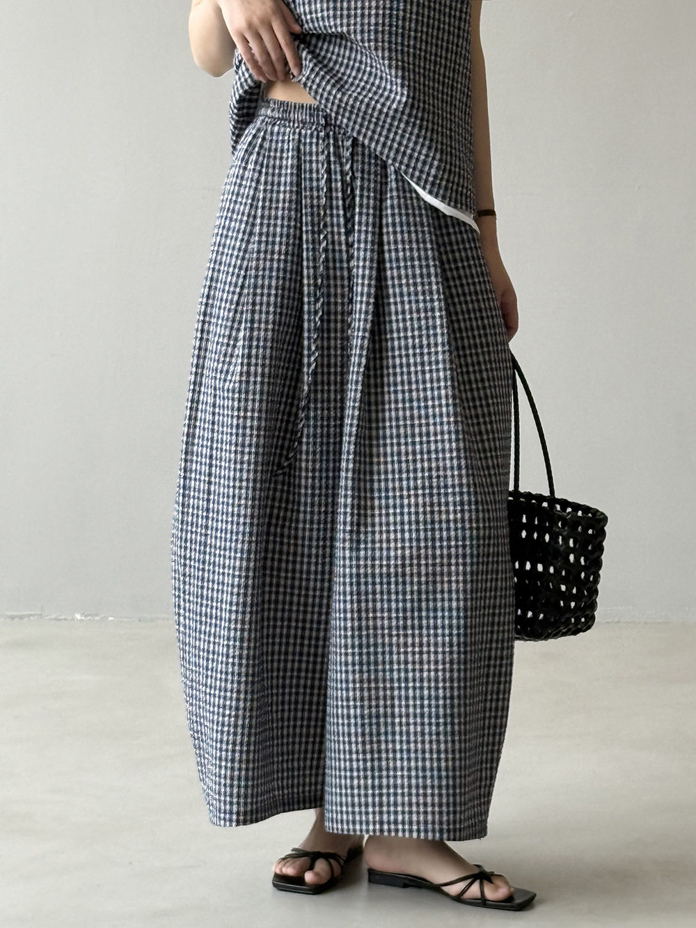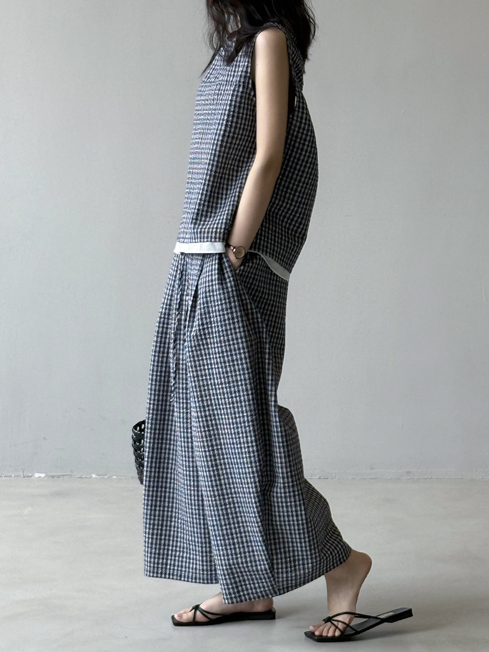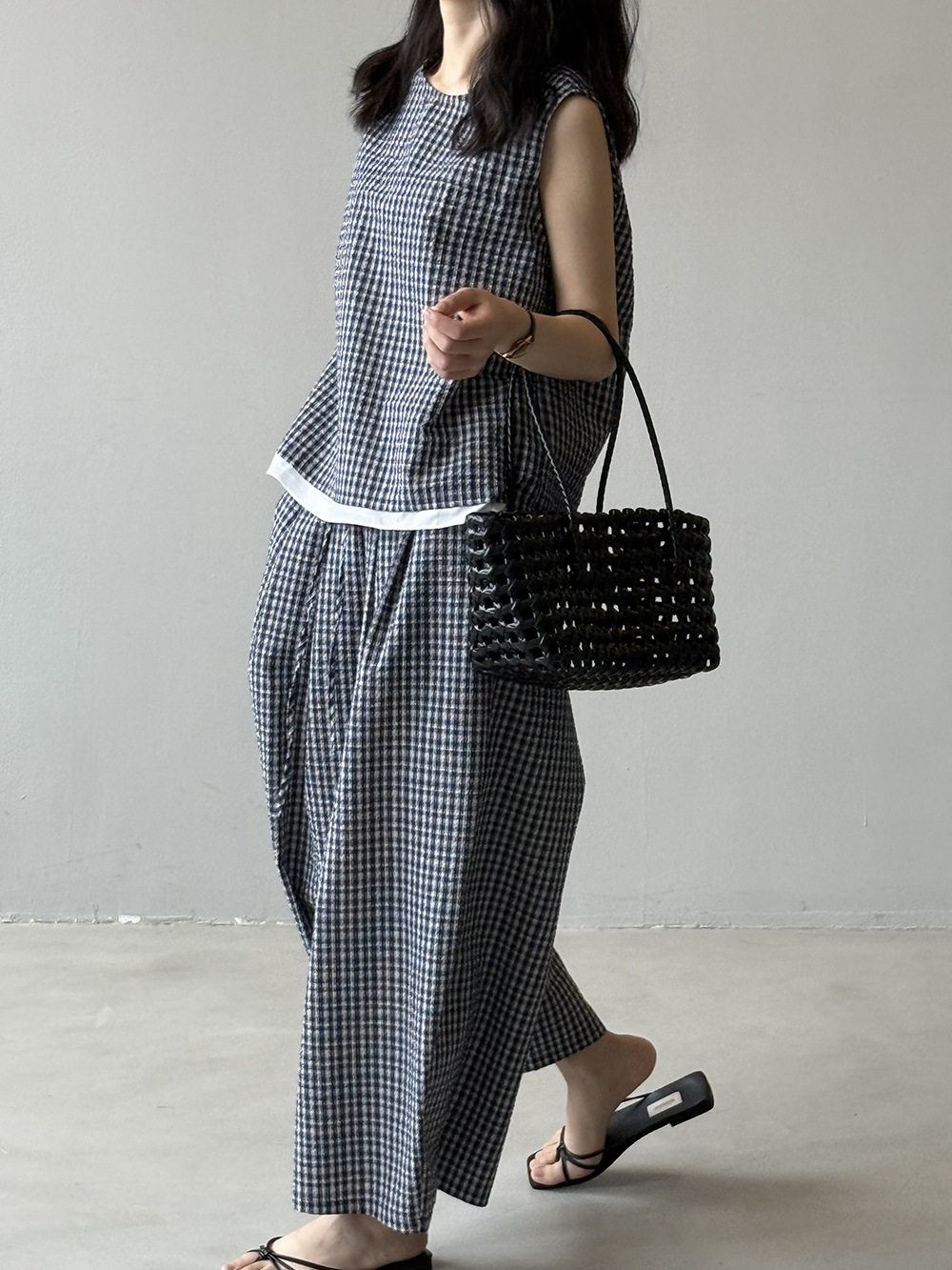 2点セット!【セットアップ】韓国風 チェック柄タンクトップ風セット+ゆったりカジュアルパンツ 上下セット【JZシリーズ】