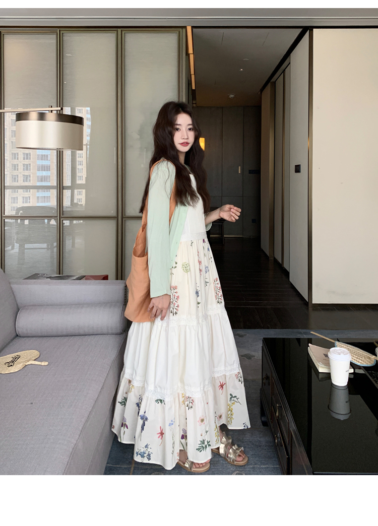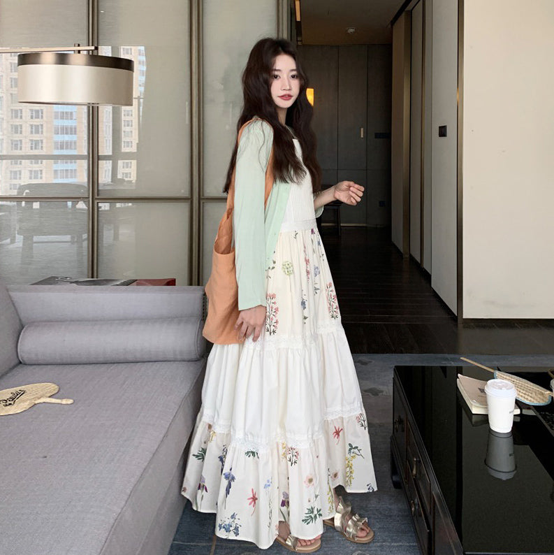 【ワンピース】韓国風 春秋新作 ゆったり大きめサイズ 体型カバー 花柄長袖ミディアムワンピース【SHシリーズ】