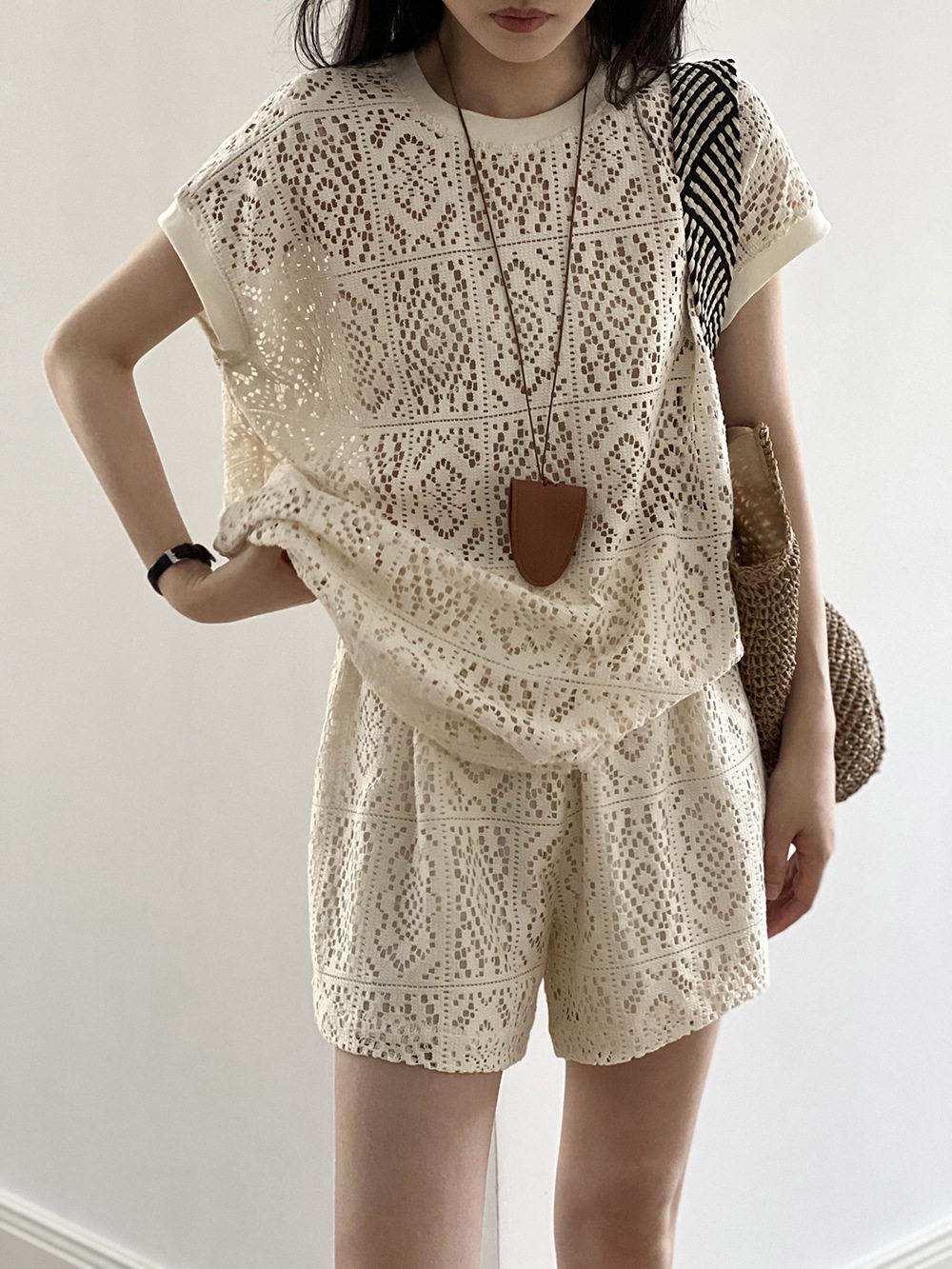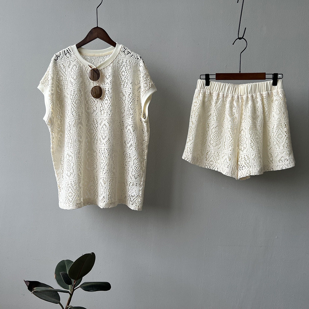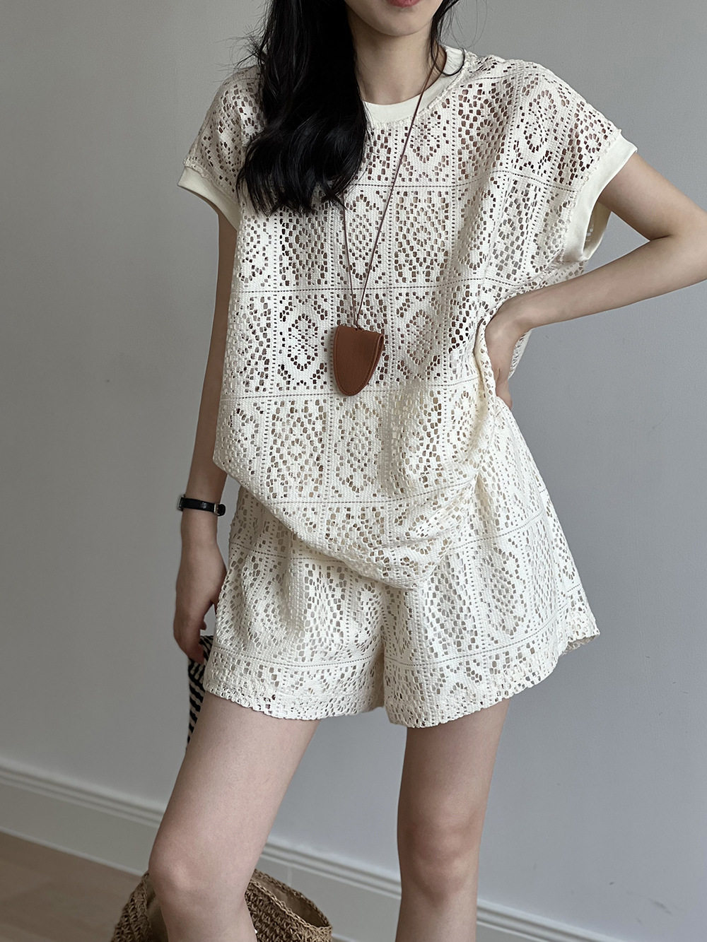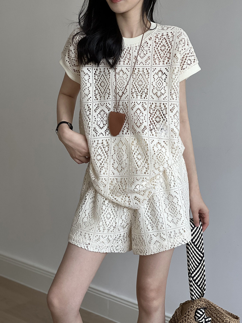 2点セット【セットアップ】カジュアルゆったりアイレット風 上下セットアップ 夏デザイン感あるクルーネックTシャツ+ハイウエストショートパンツ【JZシリーズ】