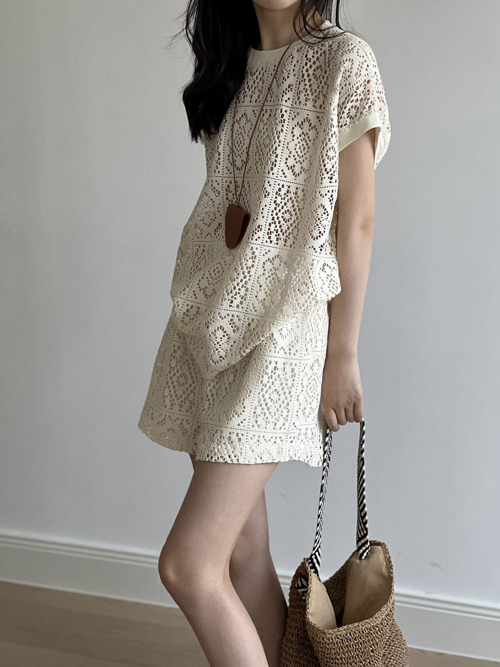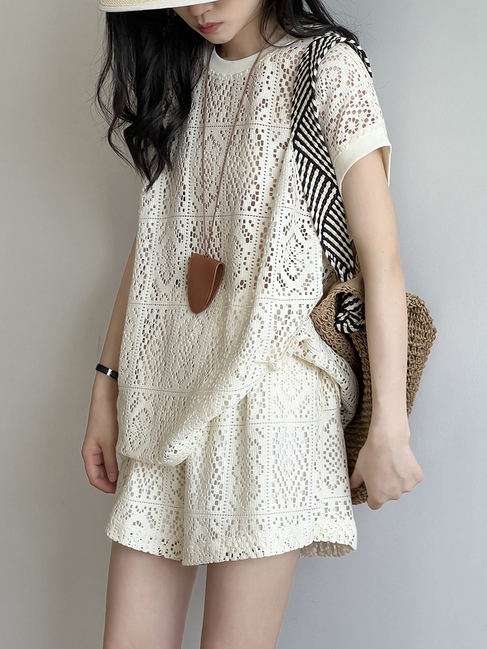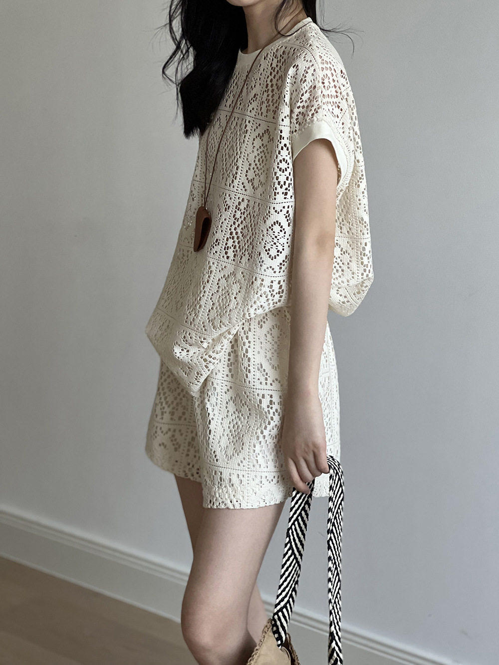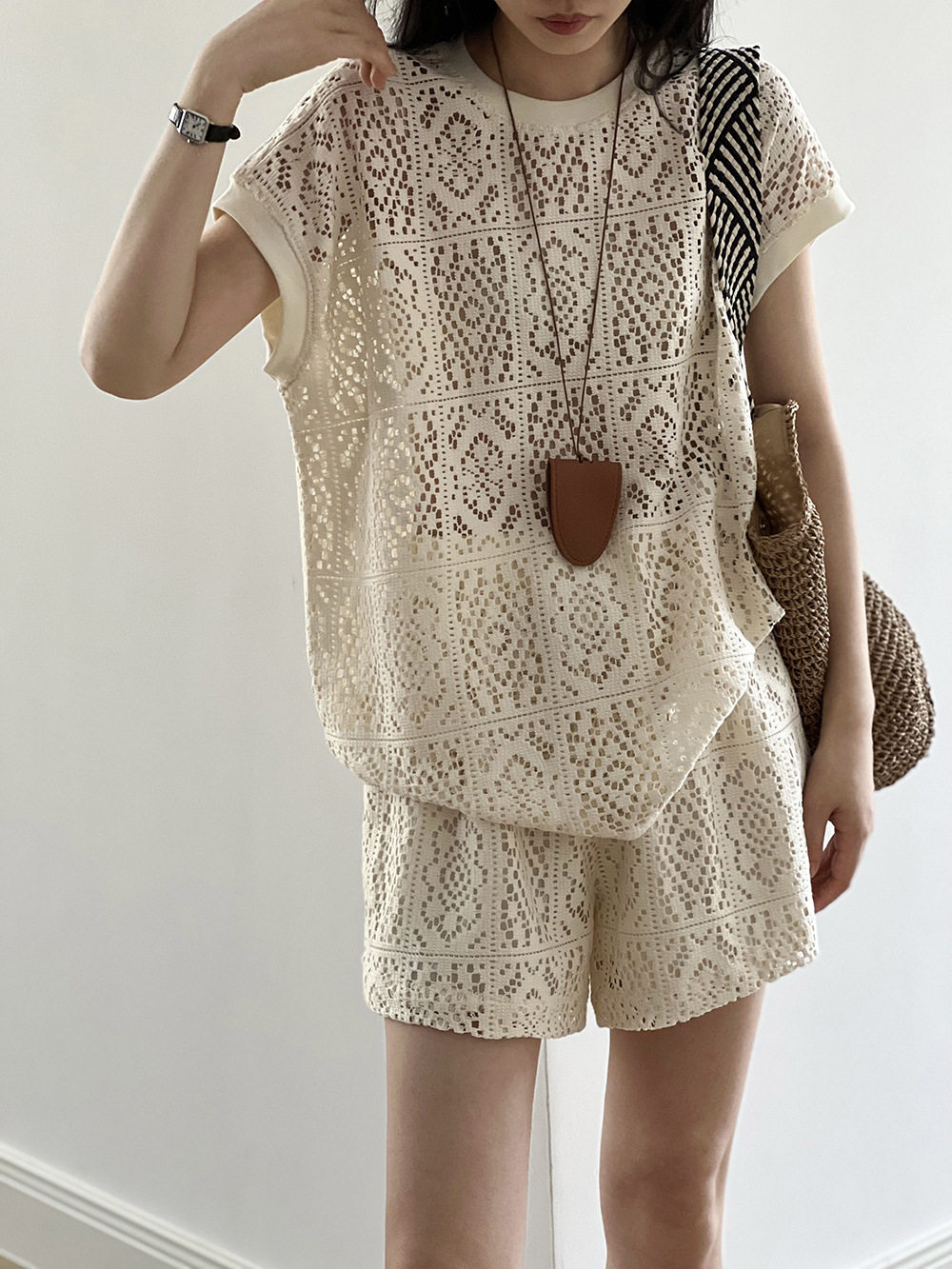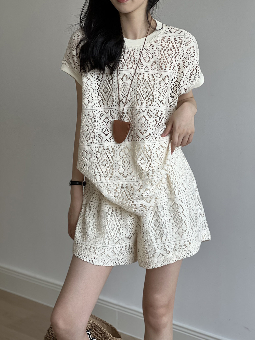 2点セット【セットアップ】カジュアルゆったりアイレット風 上下セットアップ 夏デザイン感あるクルーネックTシャツ+ハイウエストショートパンツ【JZシリーズ】