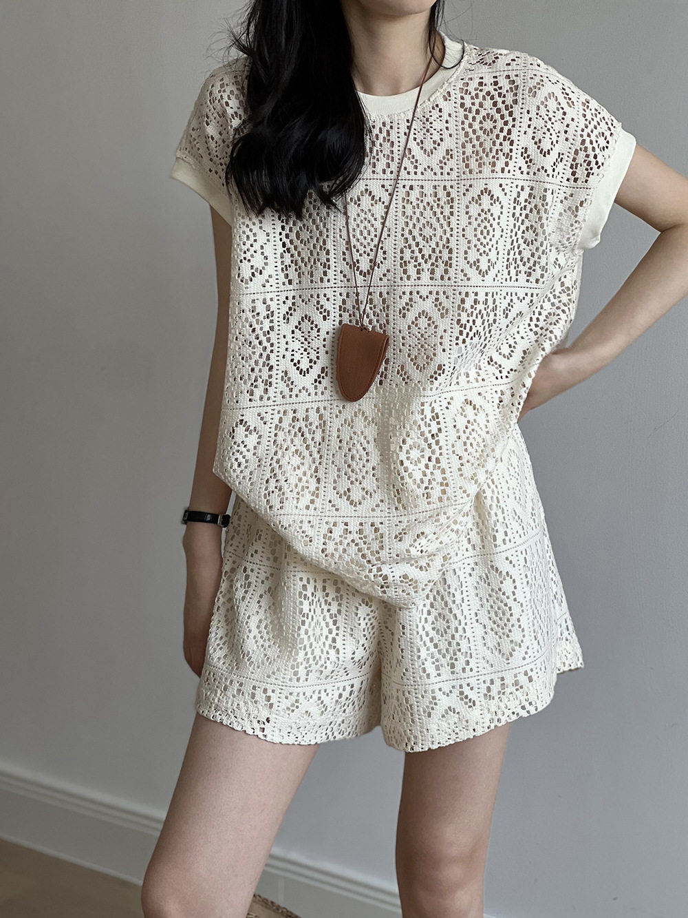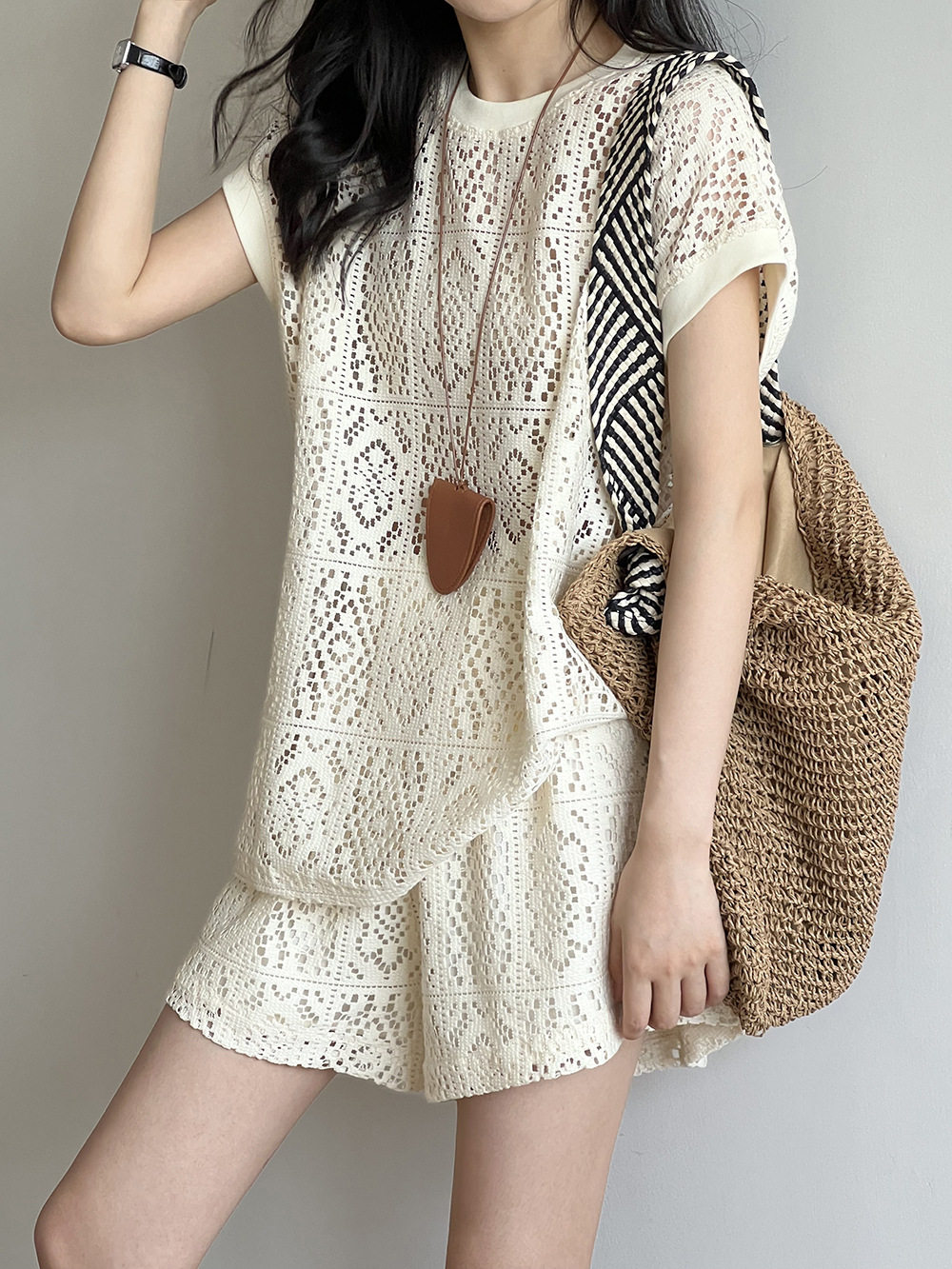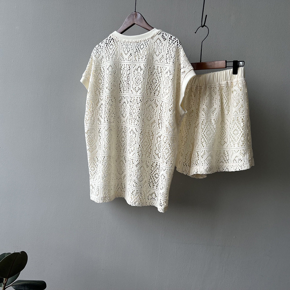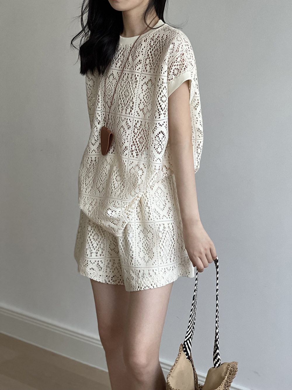 2点セット【セットアップ】カジュアルゆったりアイレット風 上下セットアップ 夏デザイン感あるクルーネックTシャツ+ハイウエストショートパンツ【JZシリーズ】