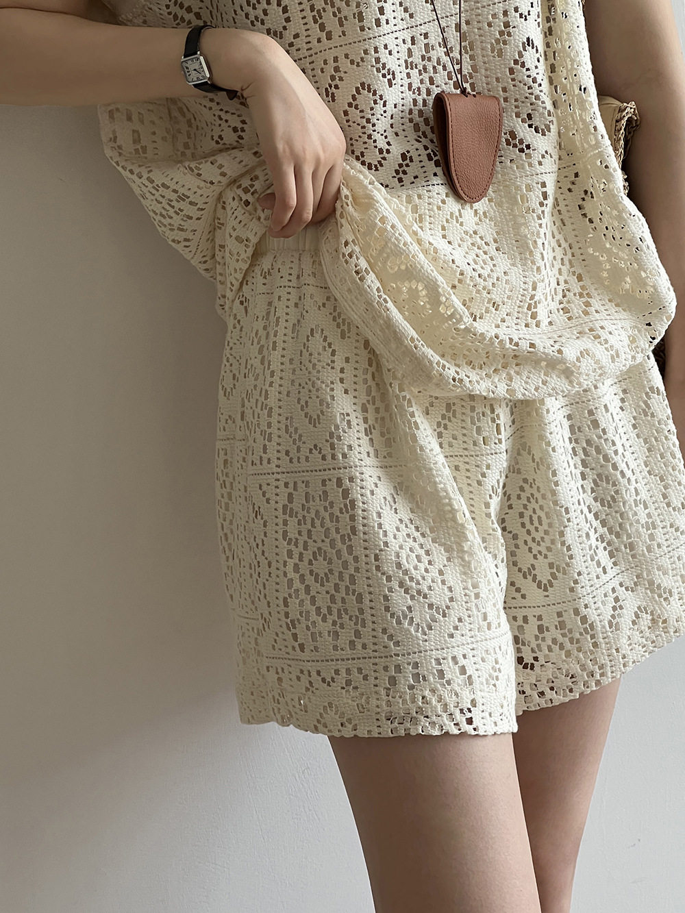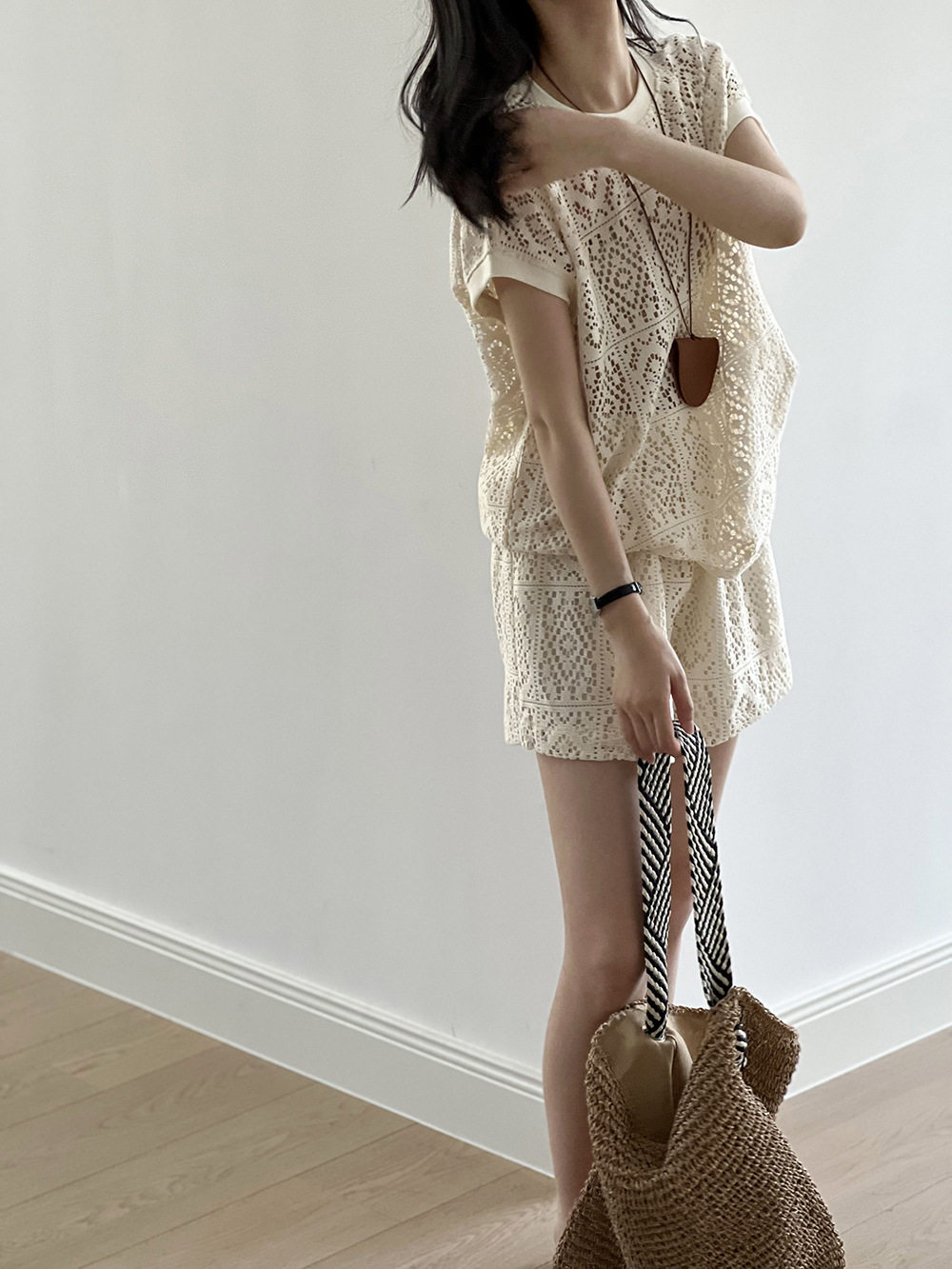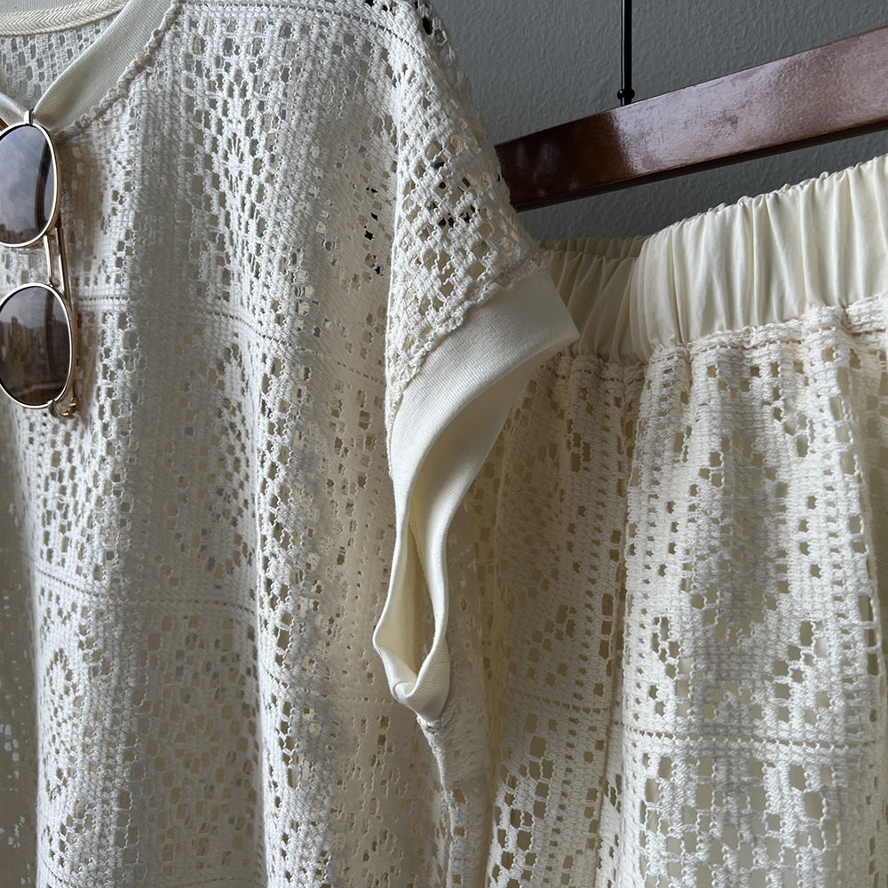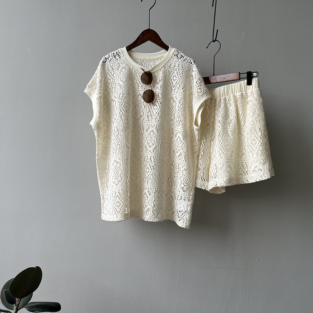 2点セット【セットアップ】カジュアルゆったりアイレット風 上下セットアップ 夏デザイン感あるクルーネックTシャツ+ハイウエストショートパンツ【JZシリーズ】