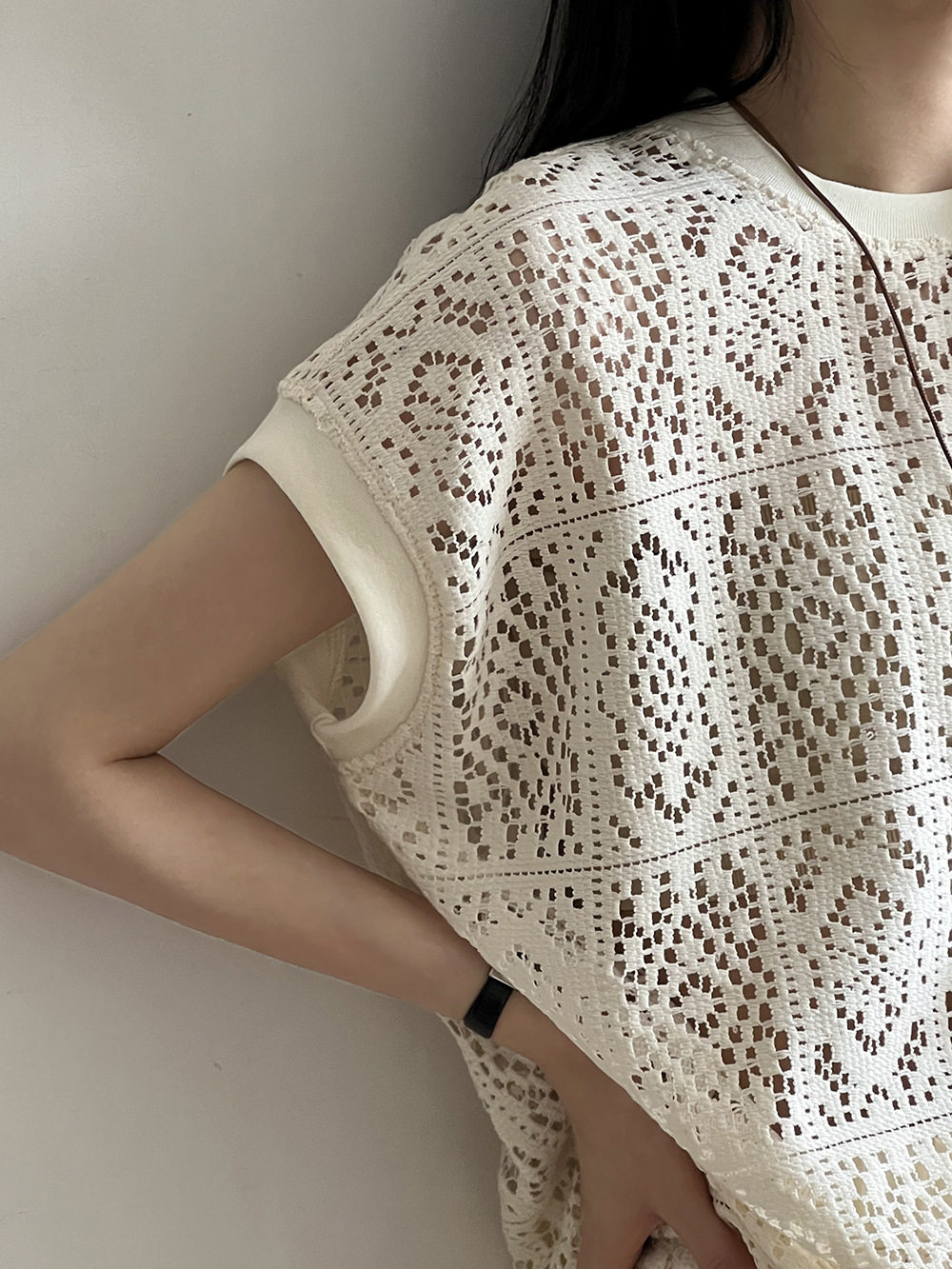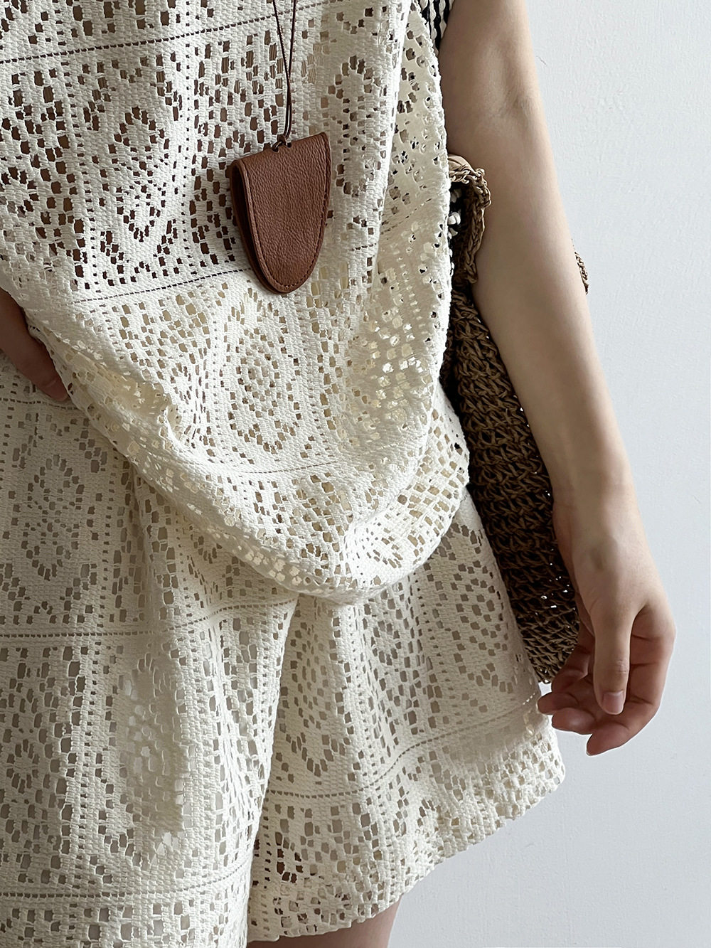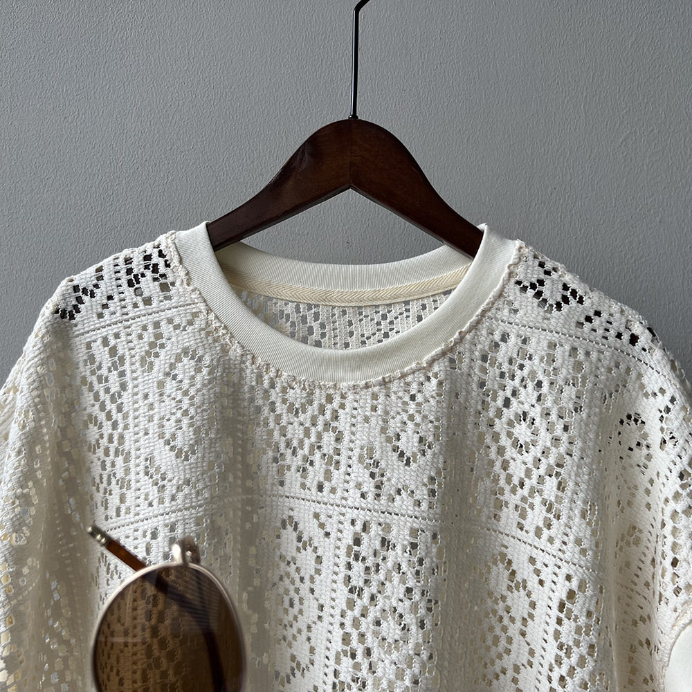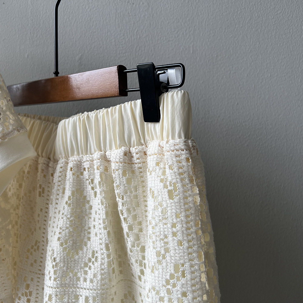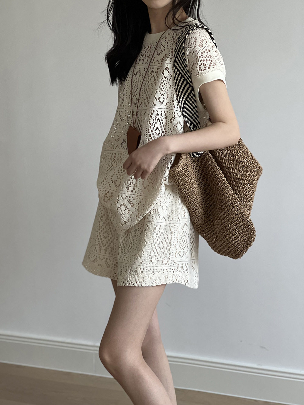 2点セット【セットアップ】カジュアルゆったりアイレット風 上下セットアップ 夏デザイン感あるクルーネックTシャツ+ハイウエストショートパンツ【JZシリーズ】