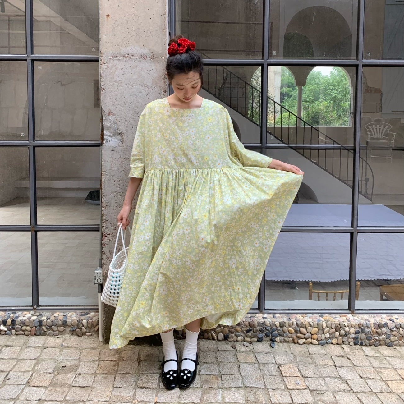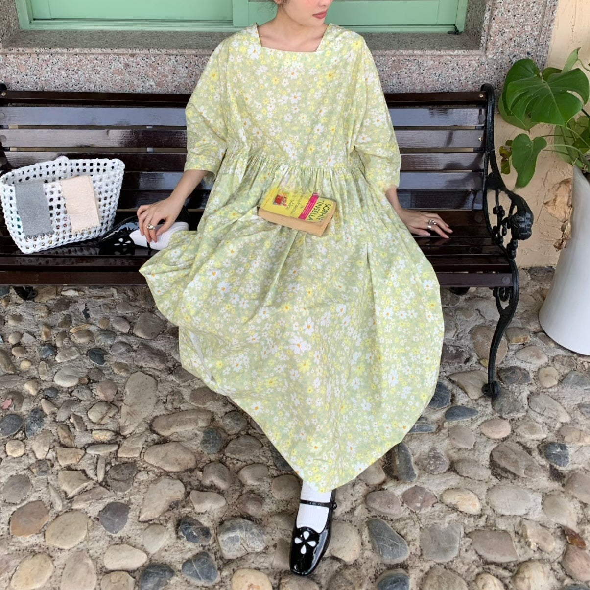 【ワンピース】夏 スクエアネック レトロ 花柄 大振裾 半袖 ワンピース【SHシリーズ】