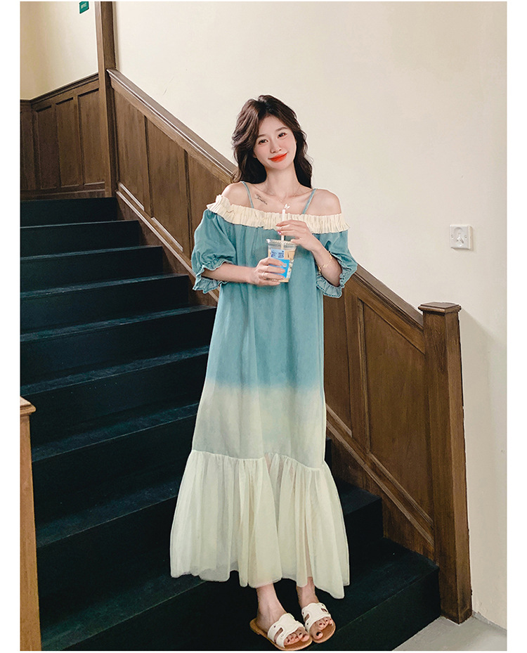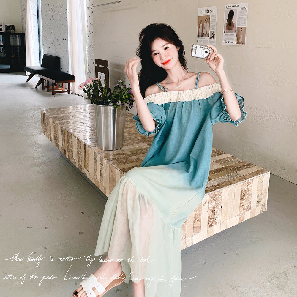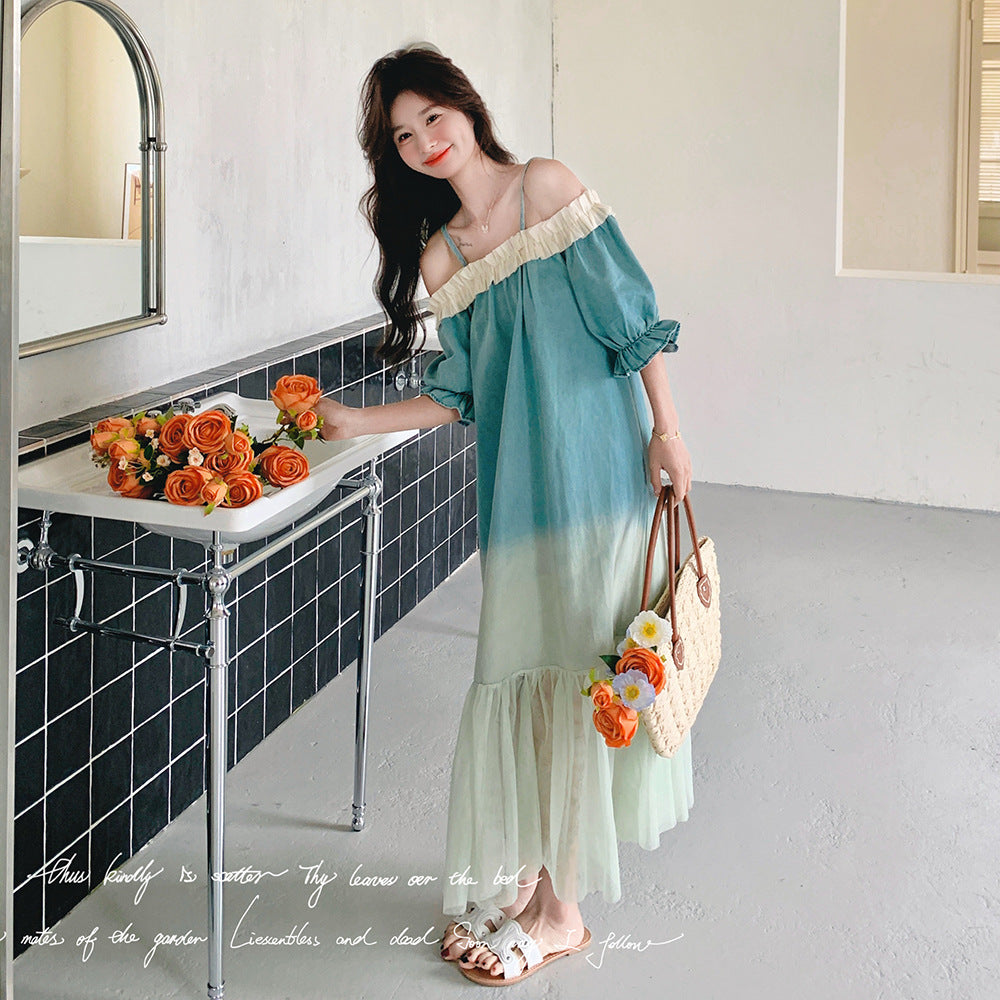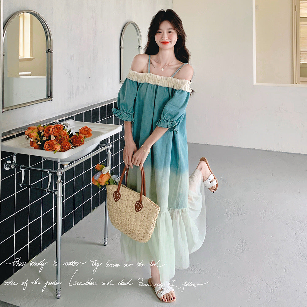【ワンピース】夏 フレンチ温柔風 スウィート オフショルダーグラデーション 半袖ワンピース【SHシリーズ】