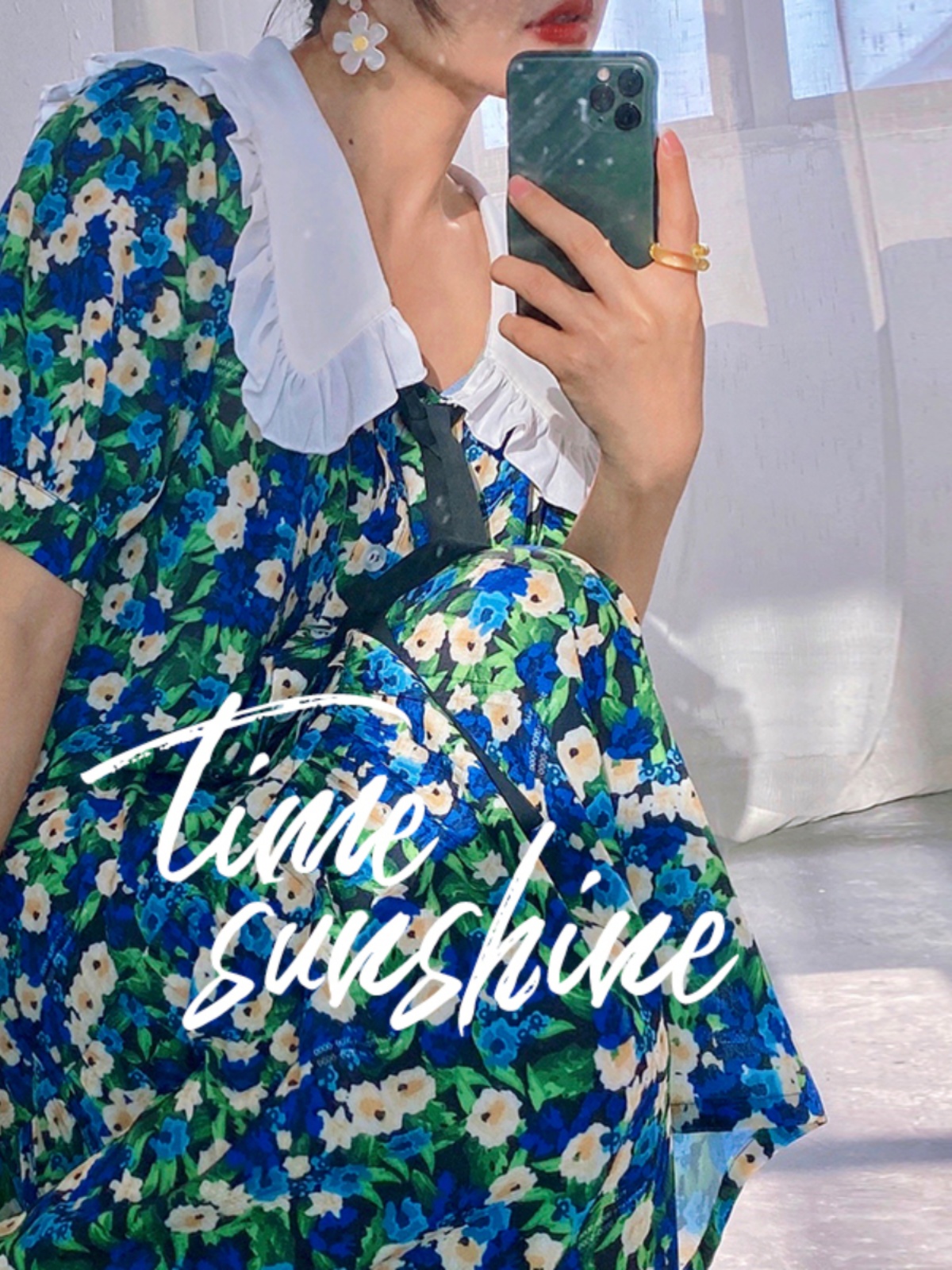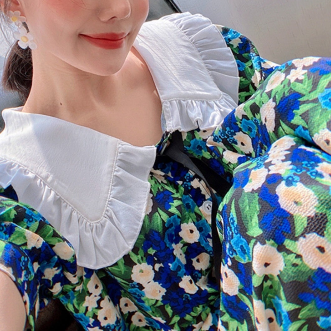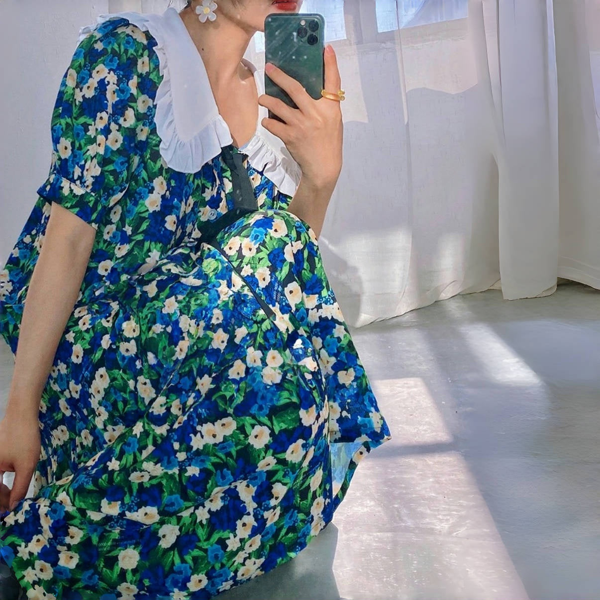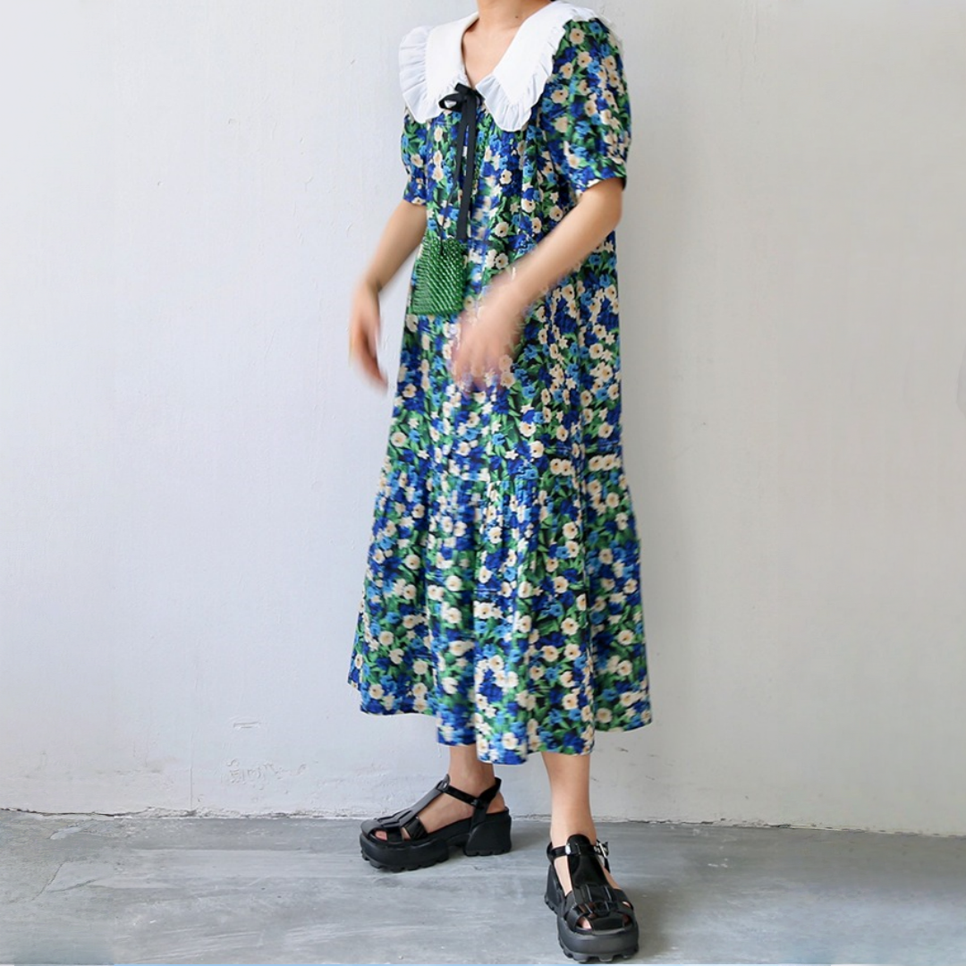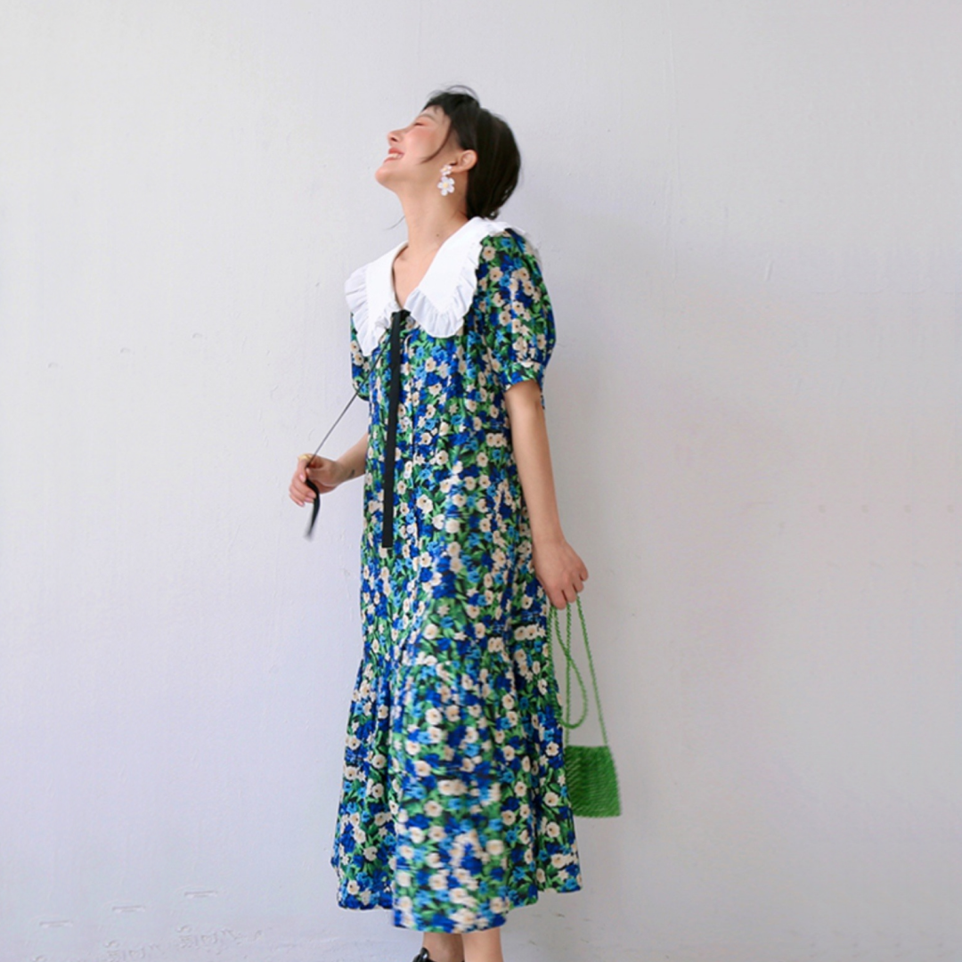 【ワンピース】韓国風 春秋新作 ゆったり大きめサイズ 体型カバー 花柄長袖ミディアムワンピース【SHシリーズ】