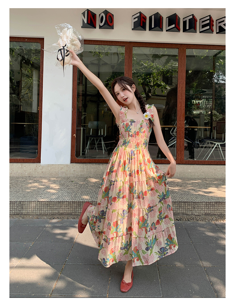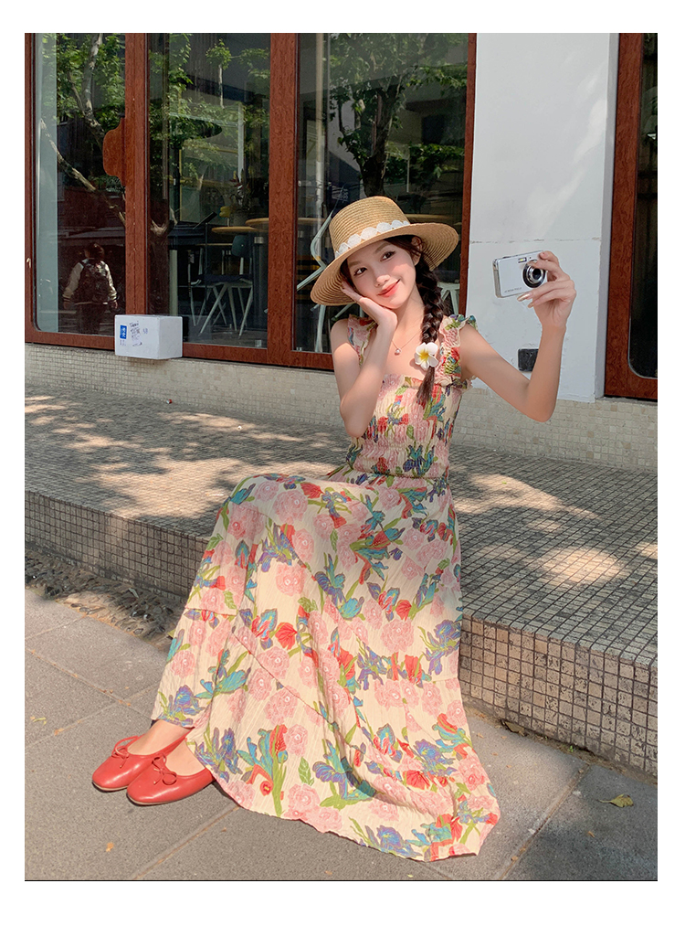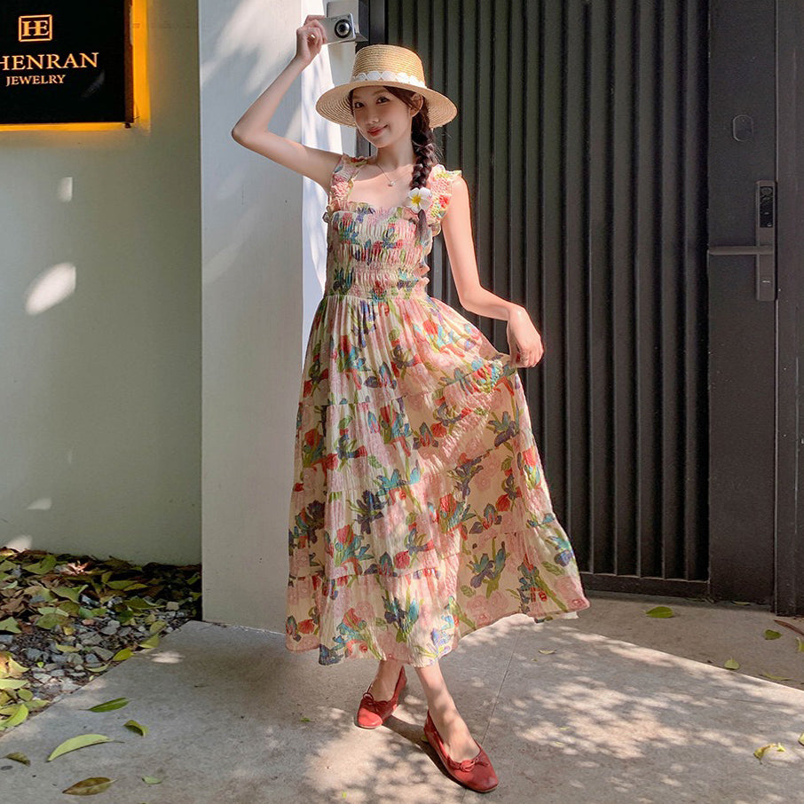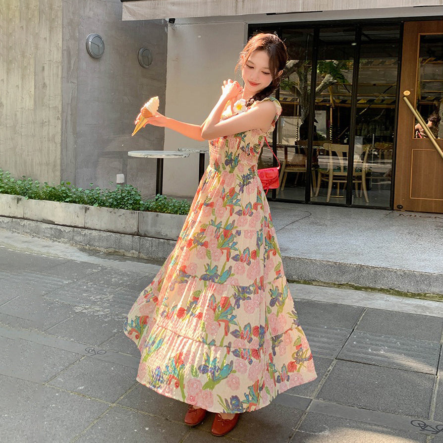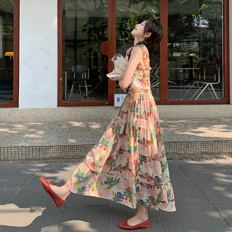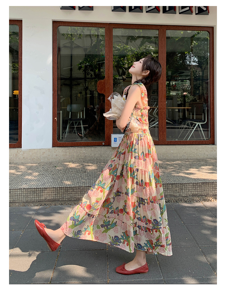 【ワンピース】夏 フレンチ風 スリム効果 ドーパミン 油絵プリント ノースリーブワンピース【SHシリーズ】