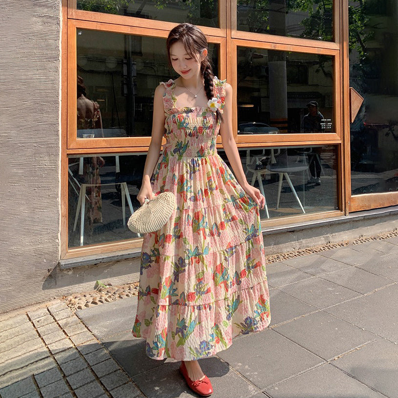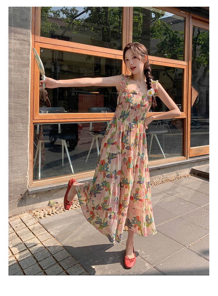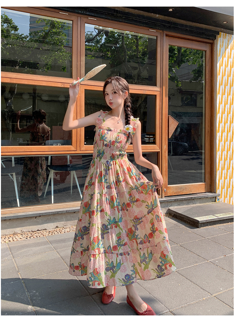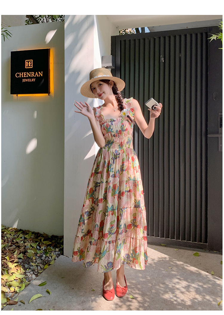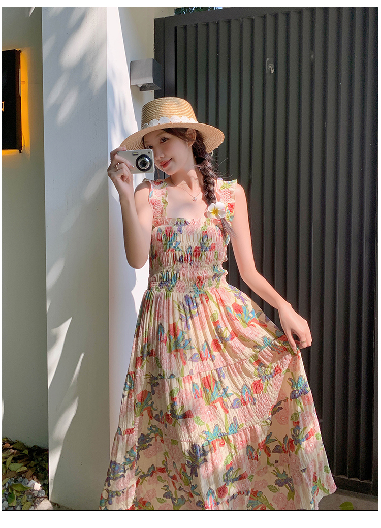 【ワンピース】夏 フレンチ風 スリム効果 ドーパミン 油絵プリント ノースリーブワンピース【SHシリーズ】