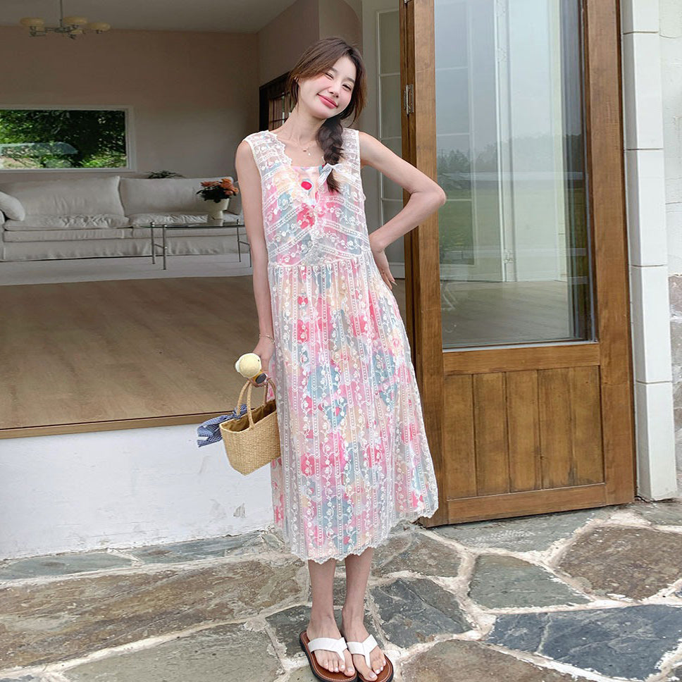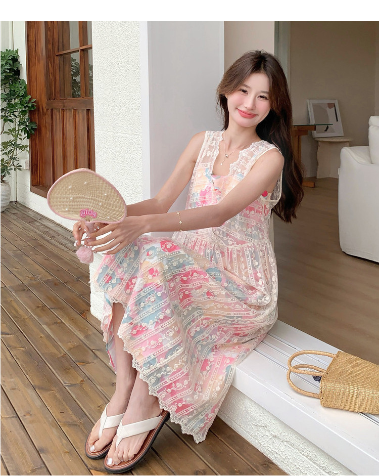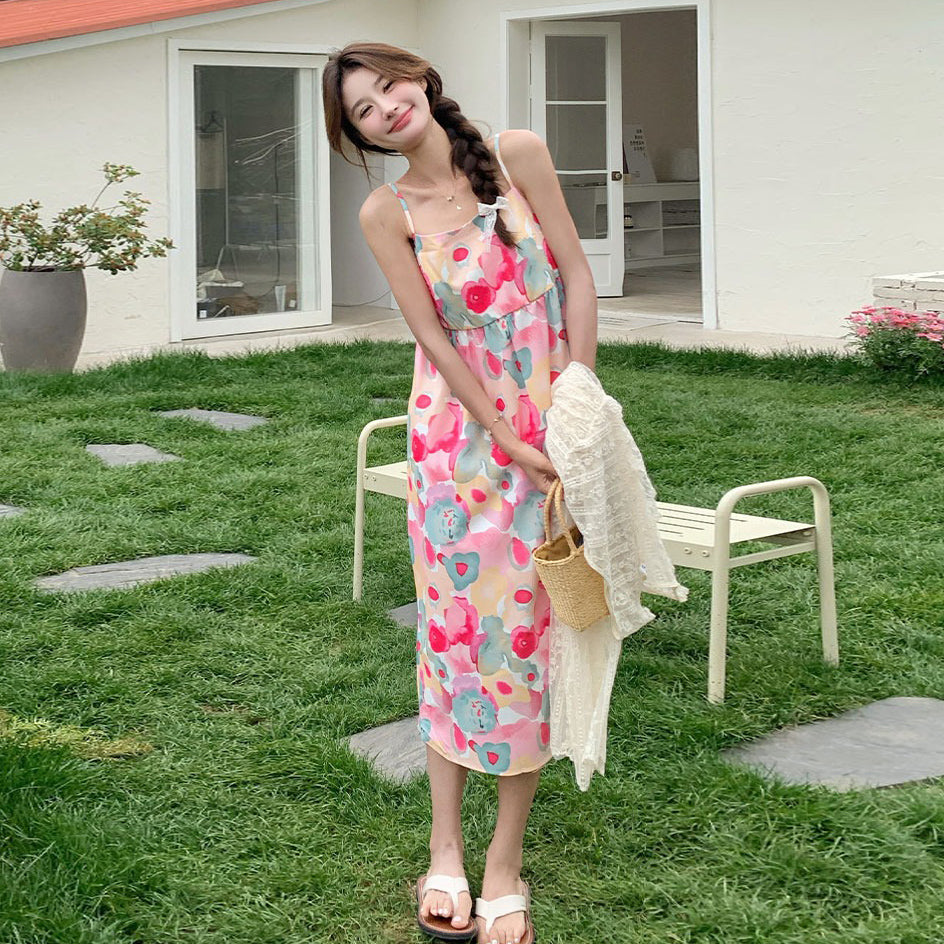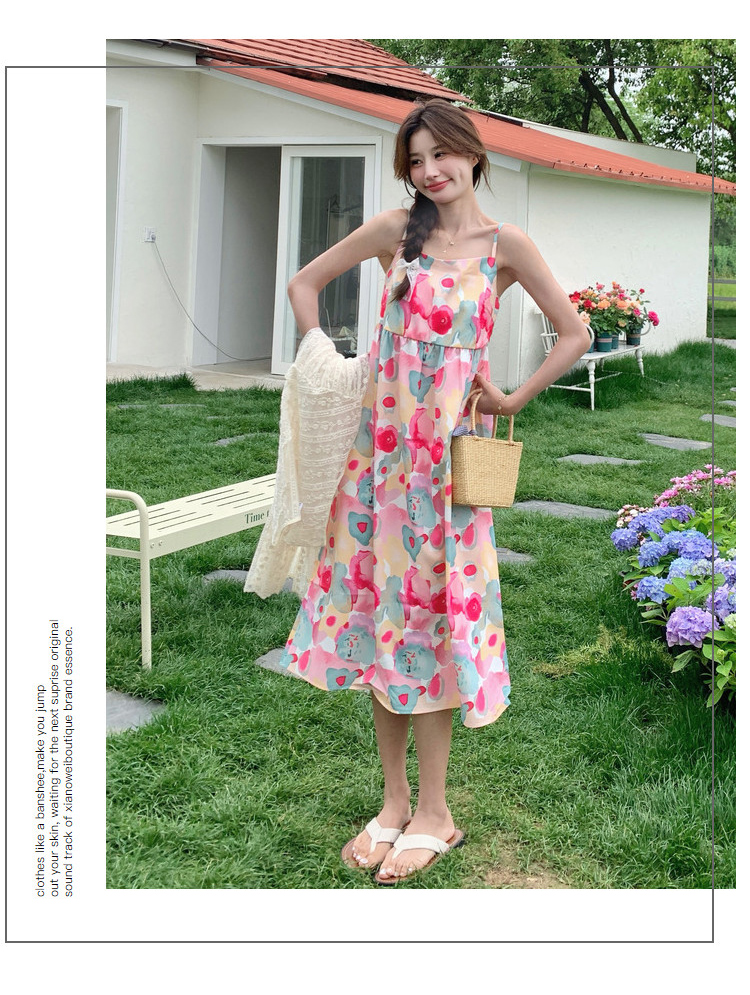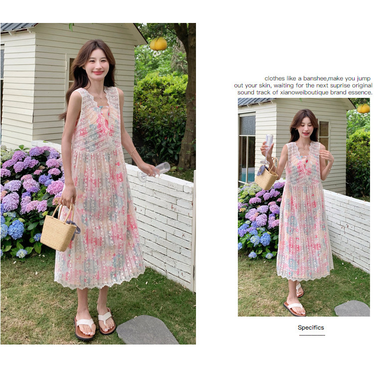 2点セット!【セットアップ】今年のトレンド 油絵プリントワンピース+メッシュワンピース 高級感 レイヤード 2点セット【SHシリーズ】