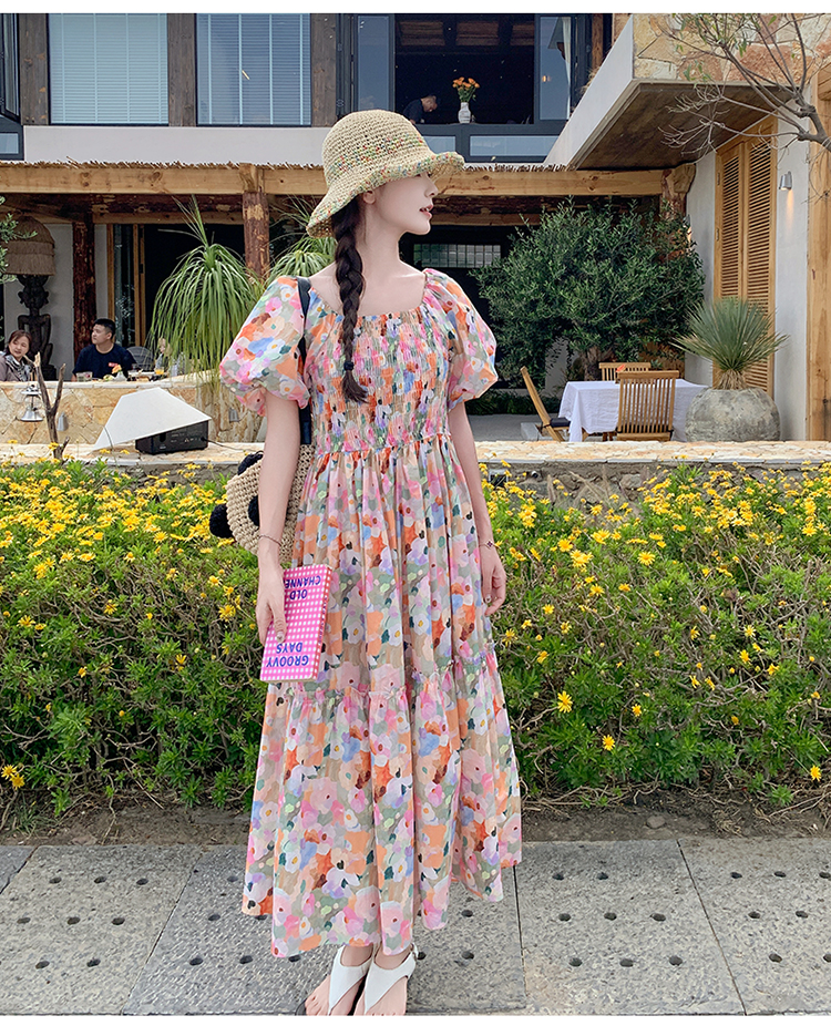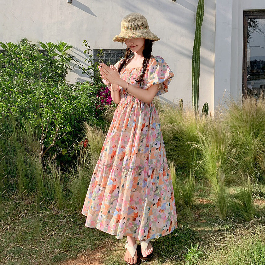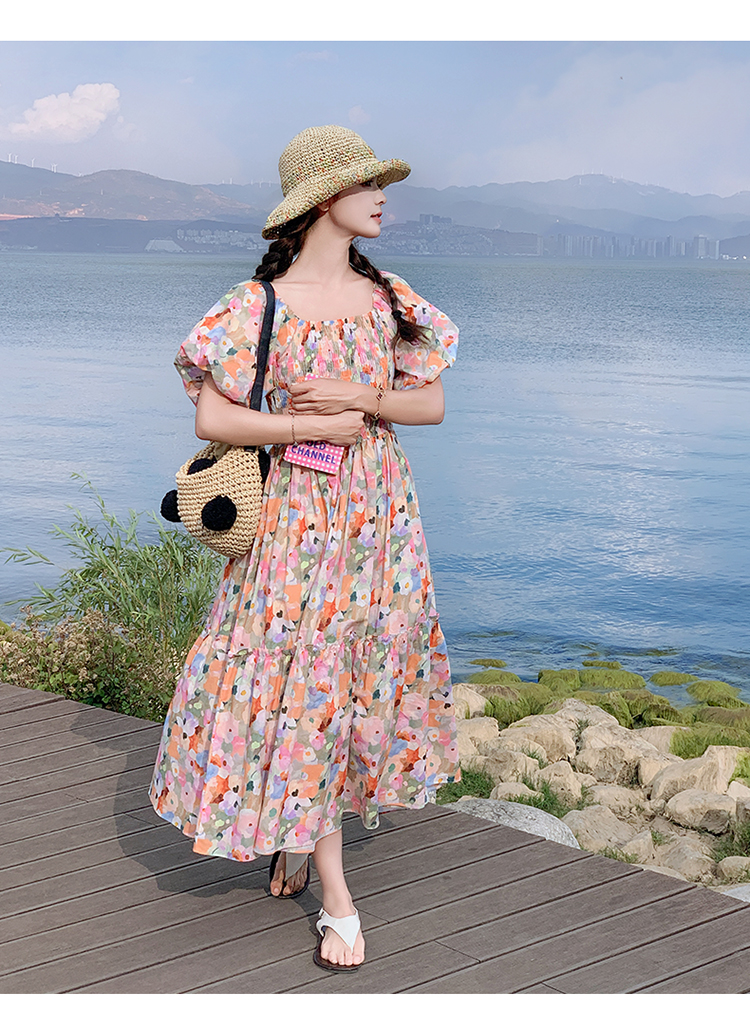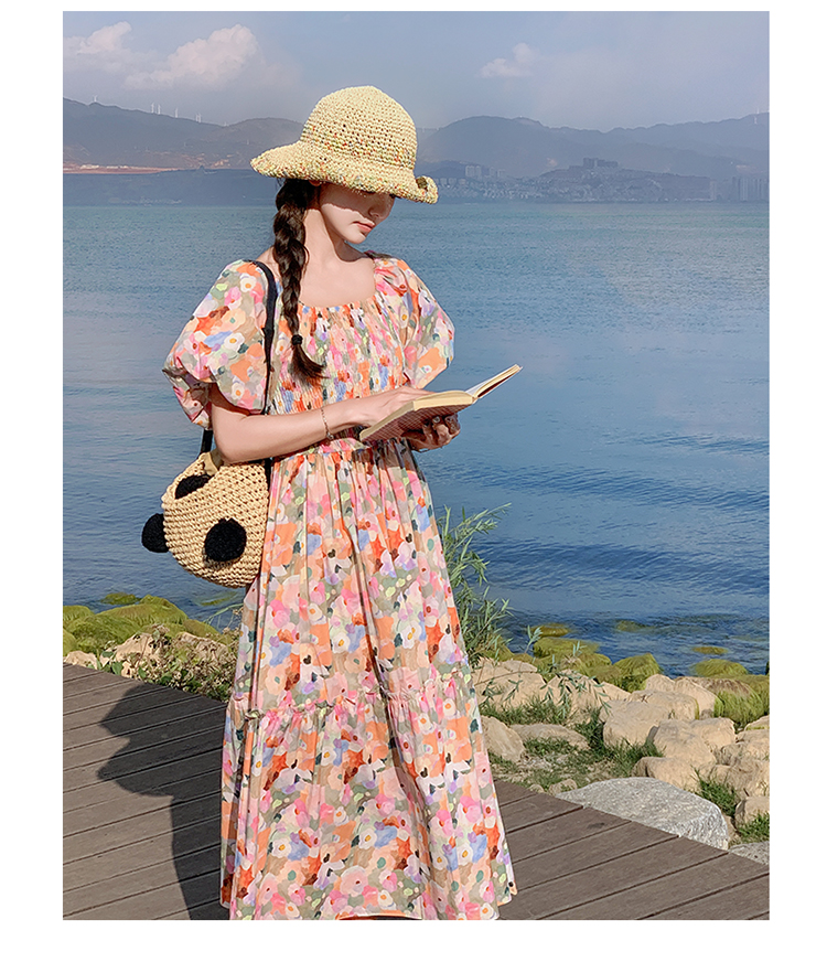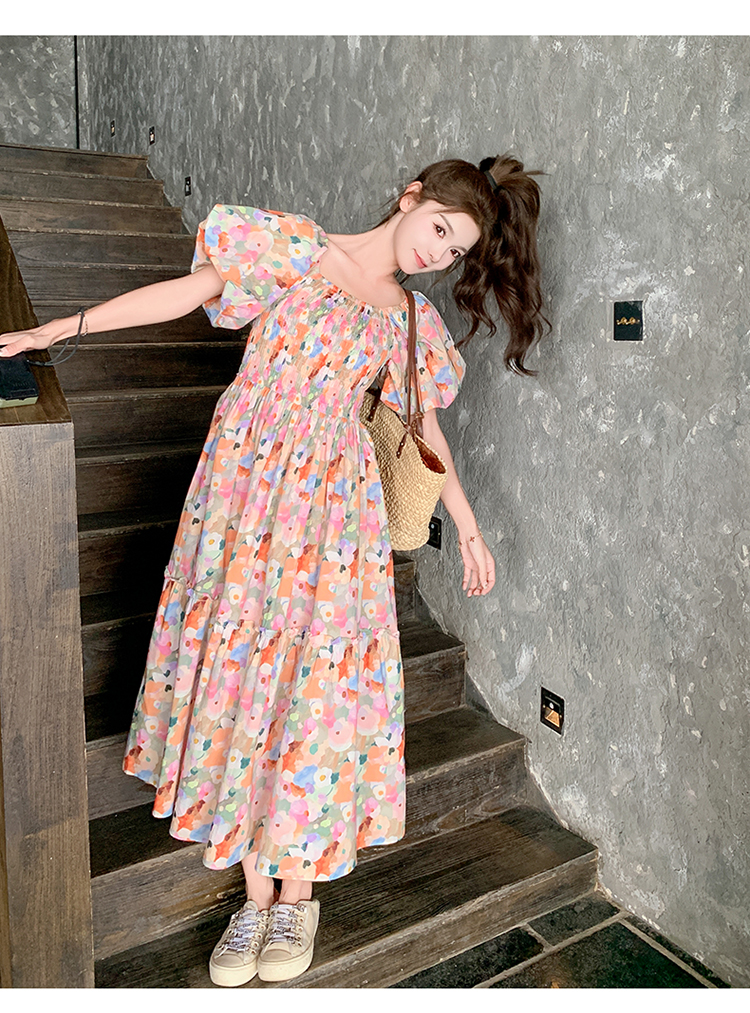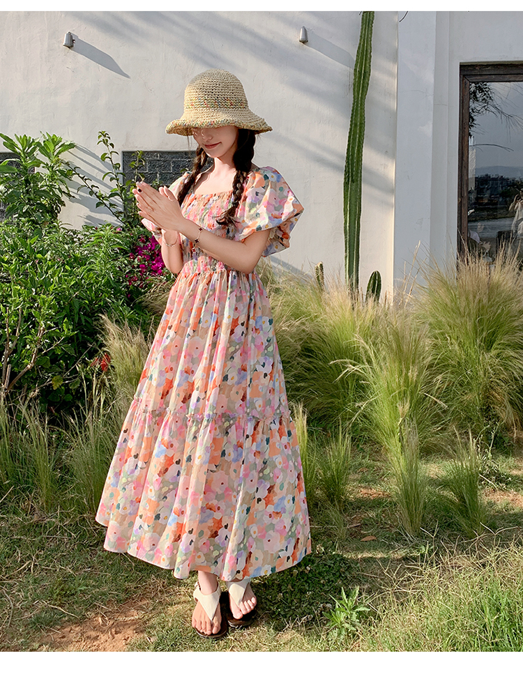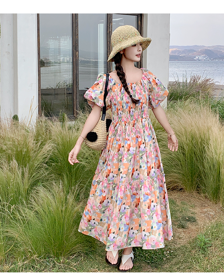 【ワンピース】ピンクプリント パフスリーブ 夏 カントリー風 半袖ワンピース【SHシリーズ】