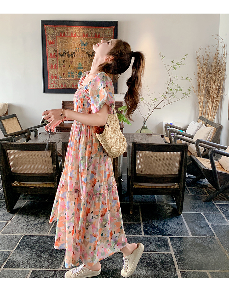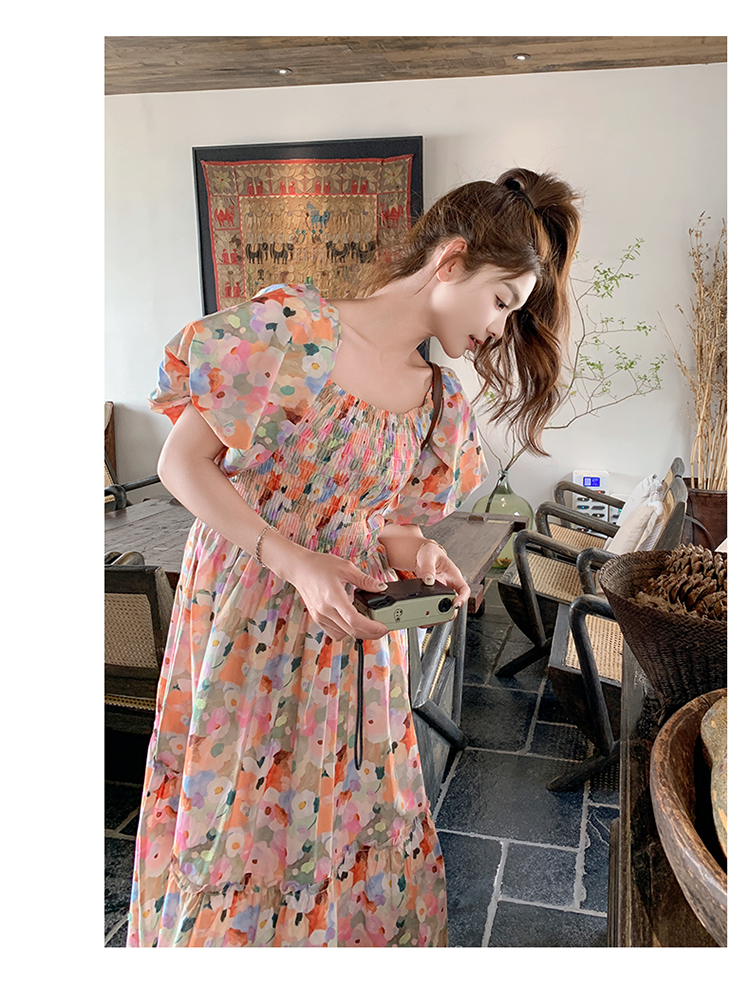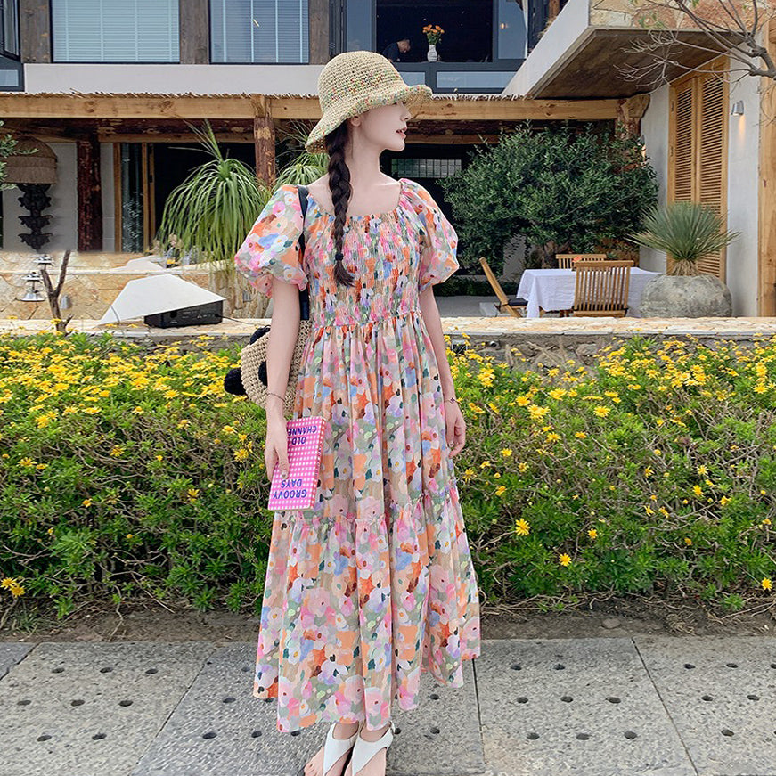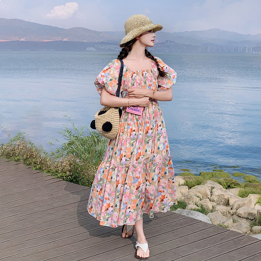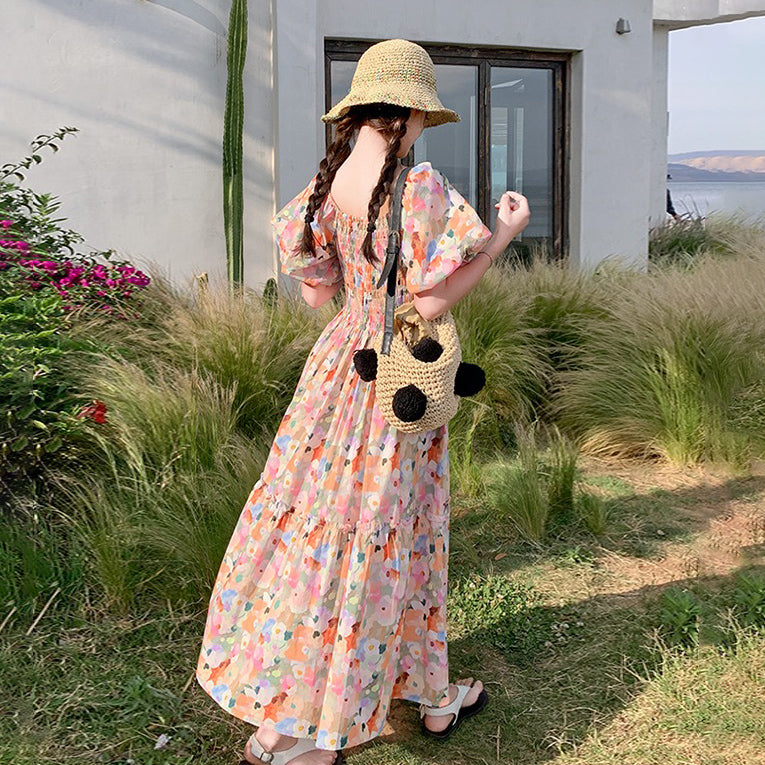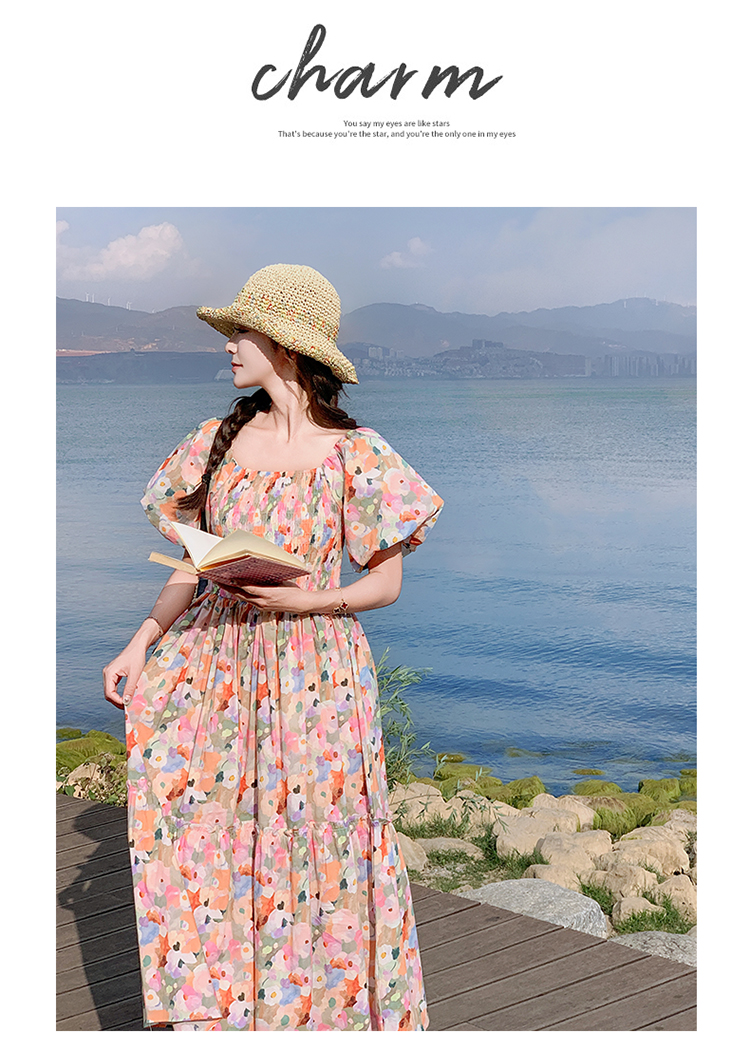 【ワンピース】ピンクプリント パフスリーブ 夏 カントリー風 半袖ワンピース【SHシリーズ】