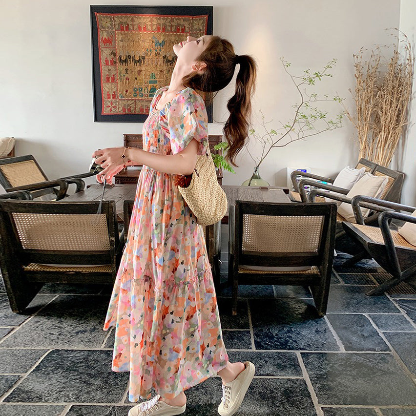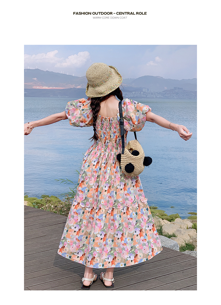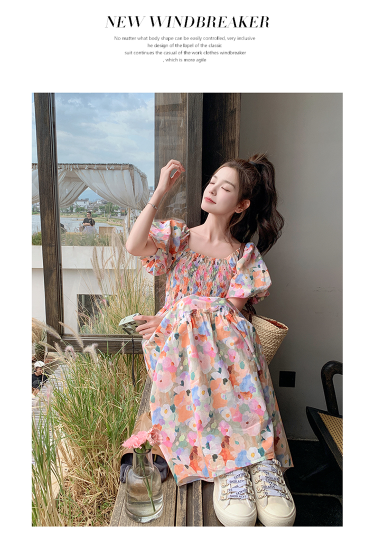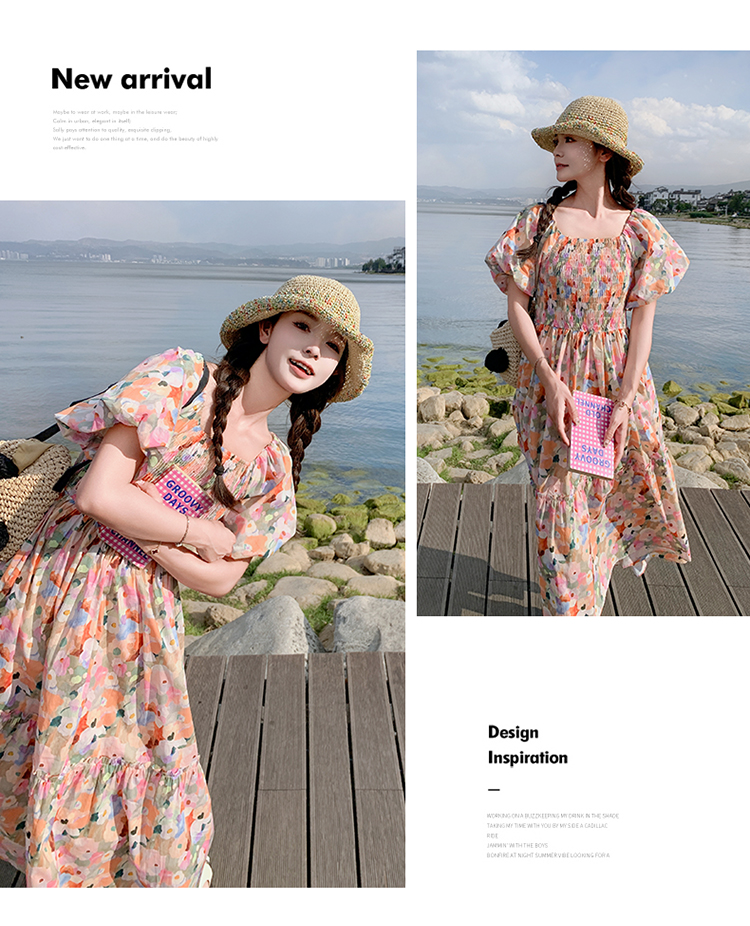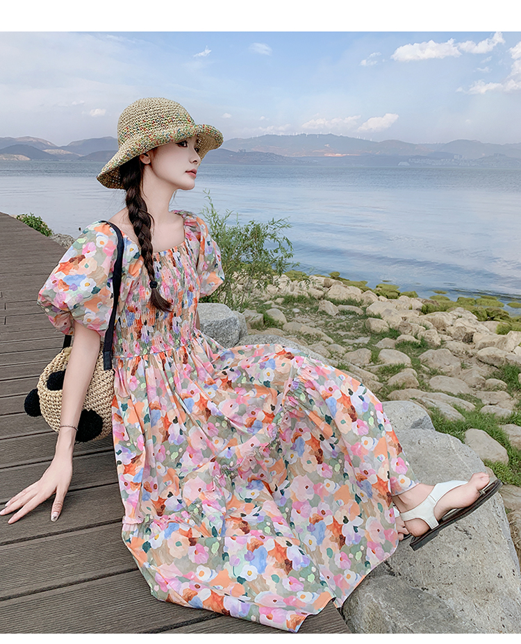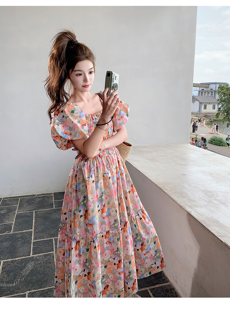 【ワンピース】ピンクプリント パフスリーブ 夏 カントリー風 半袖ワンピース【SHシリーズ】