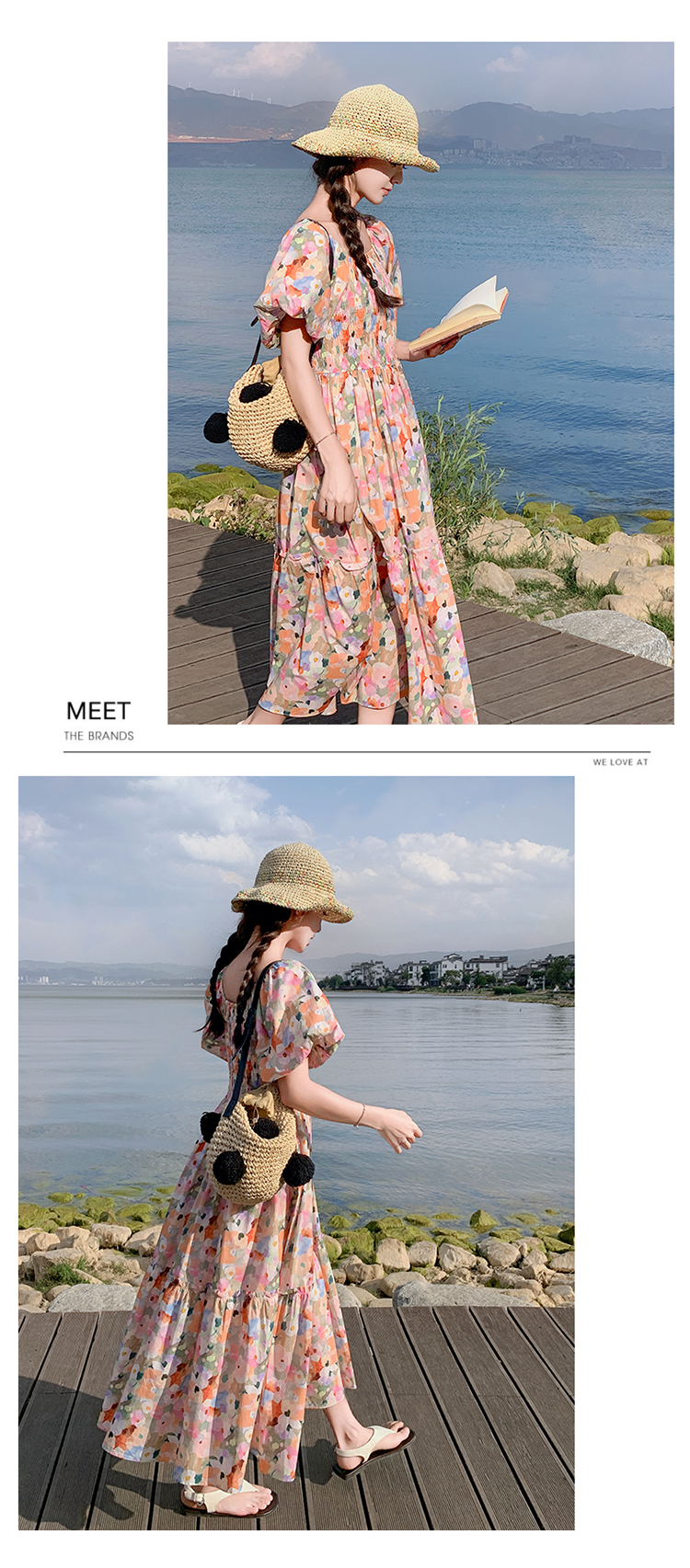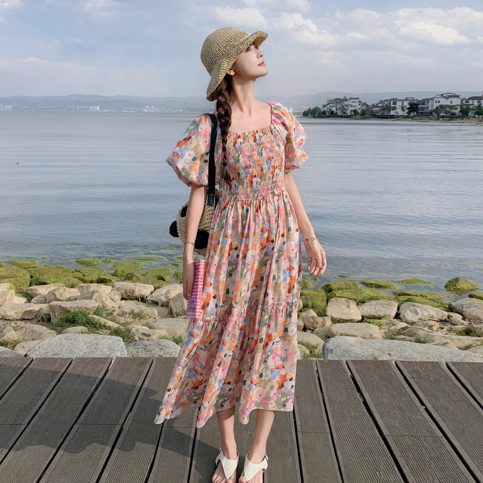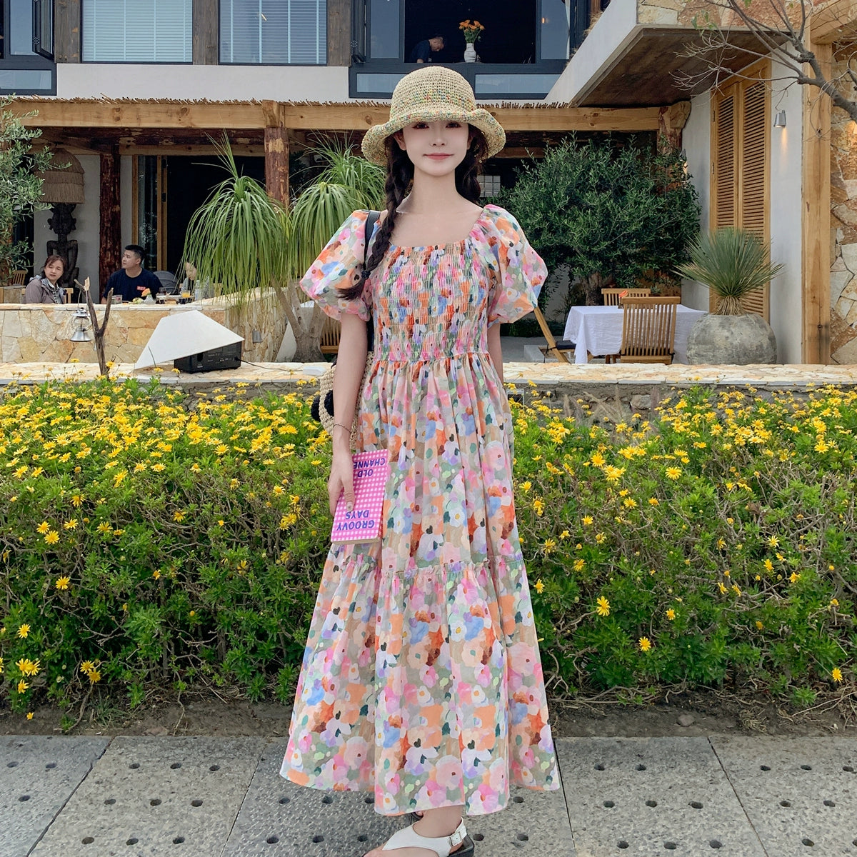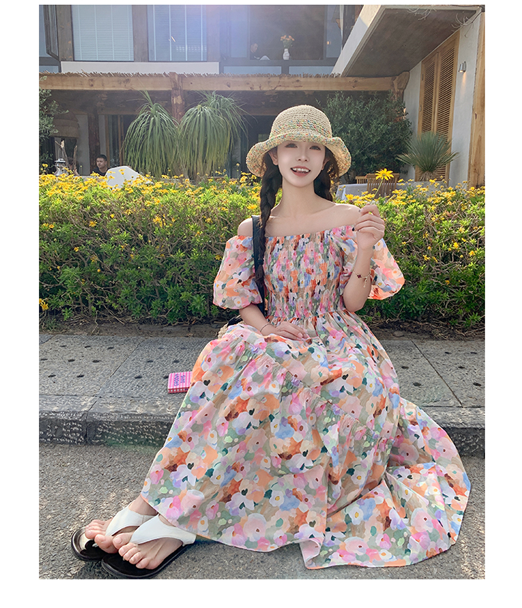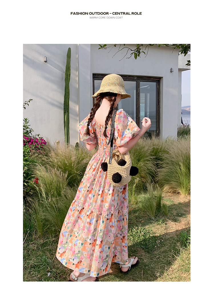 【ワンピース】ピンクプリント パフスリーブ 夏 カントリー風 半袖ワンピース【SHシリーズ】