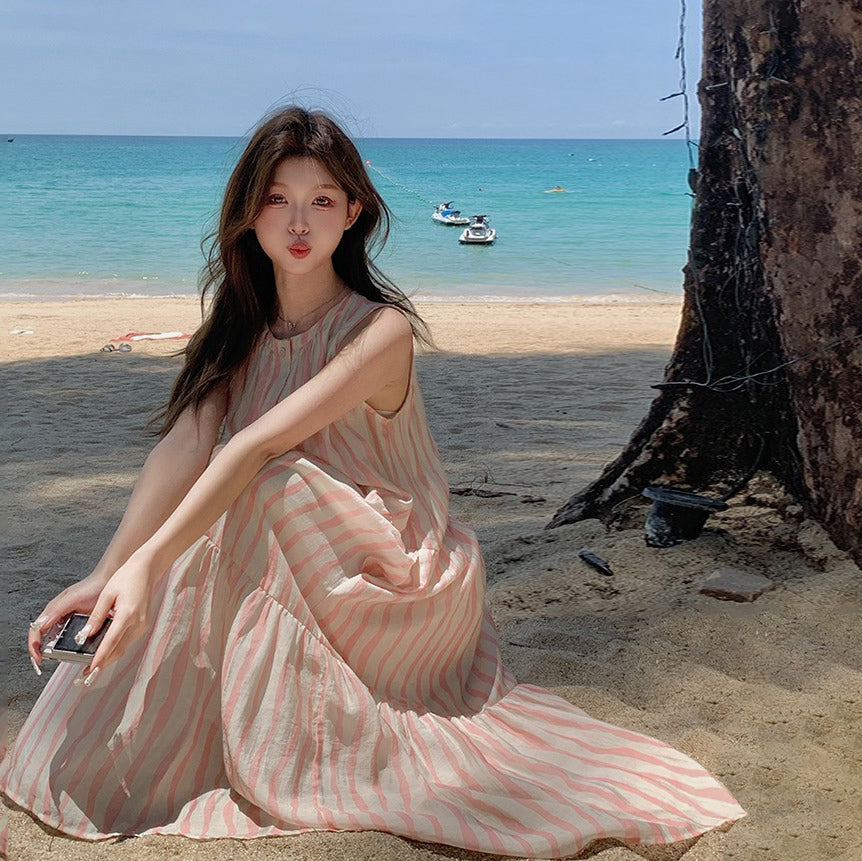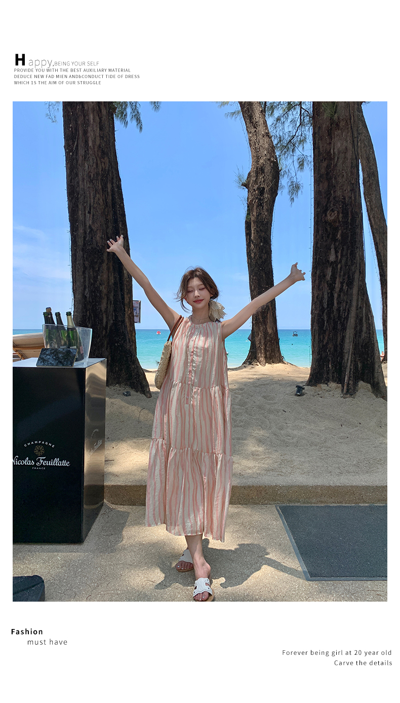 【ワンピース】夏 アート感 都市リゾート風 ピンクストライプ ノースリーブワンピース【SHシリーズ】
