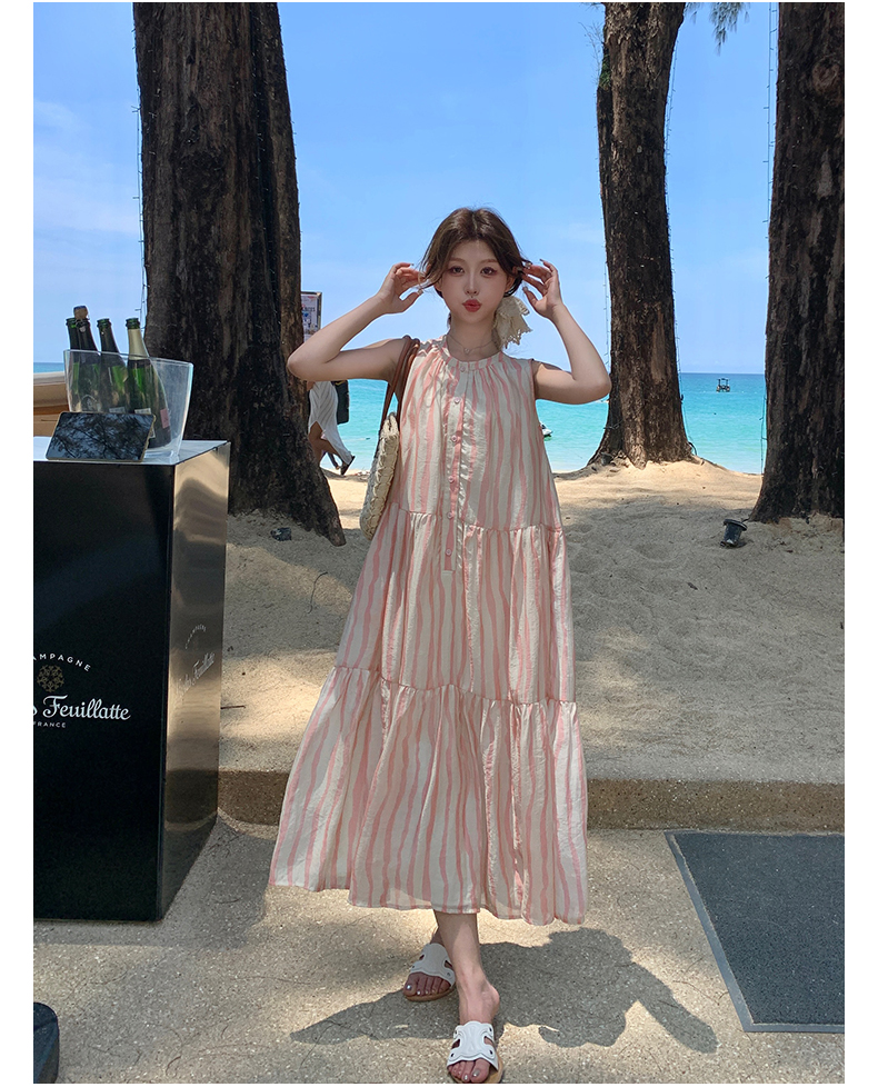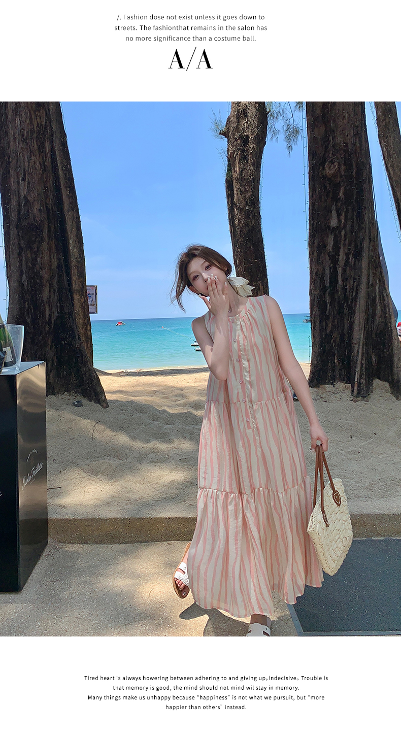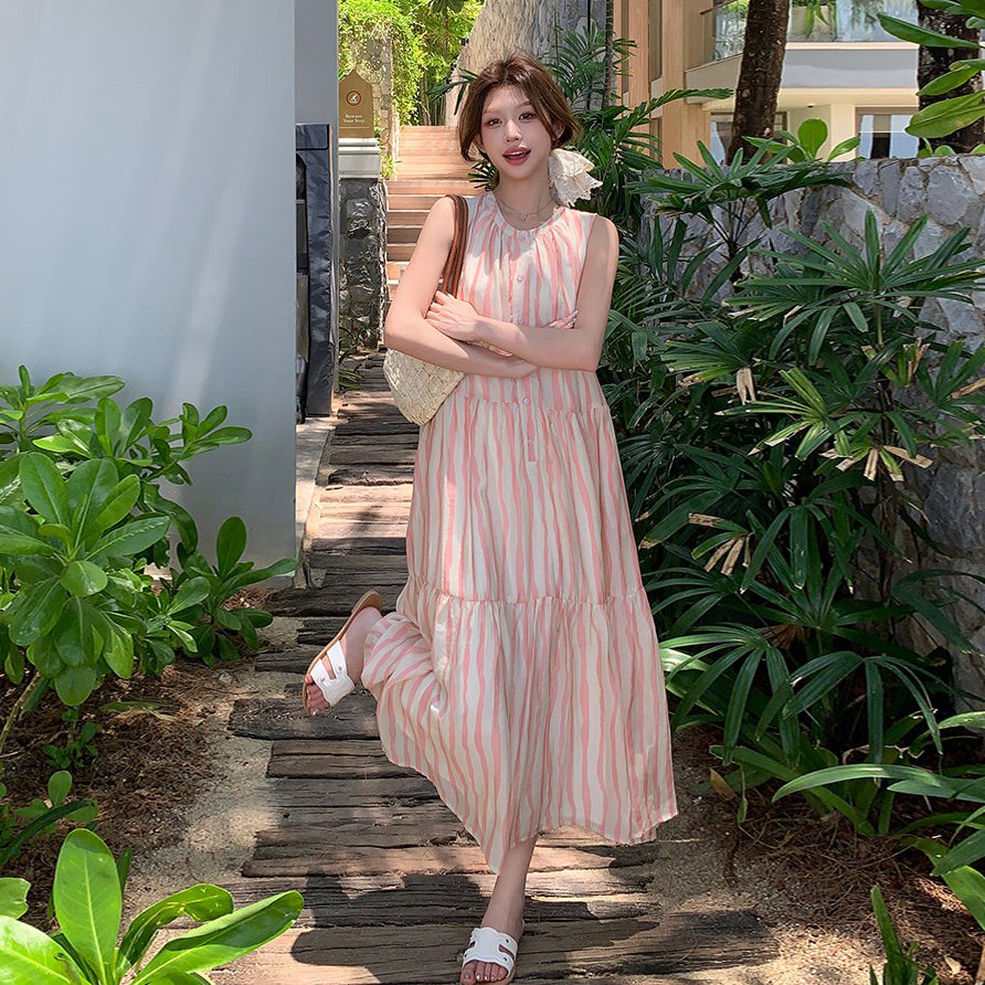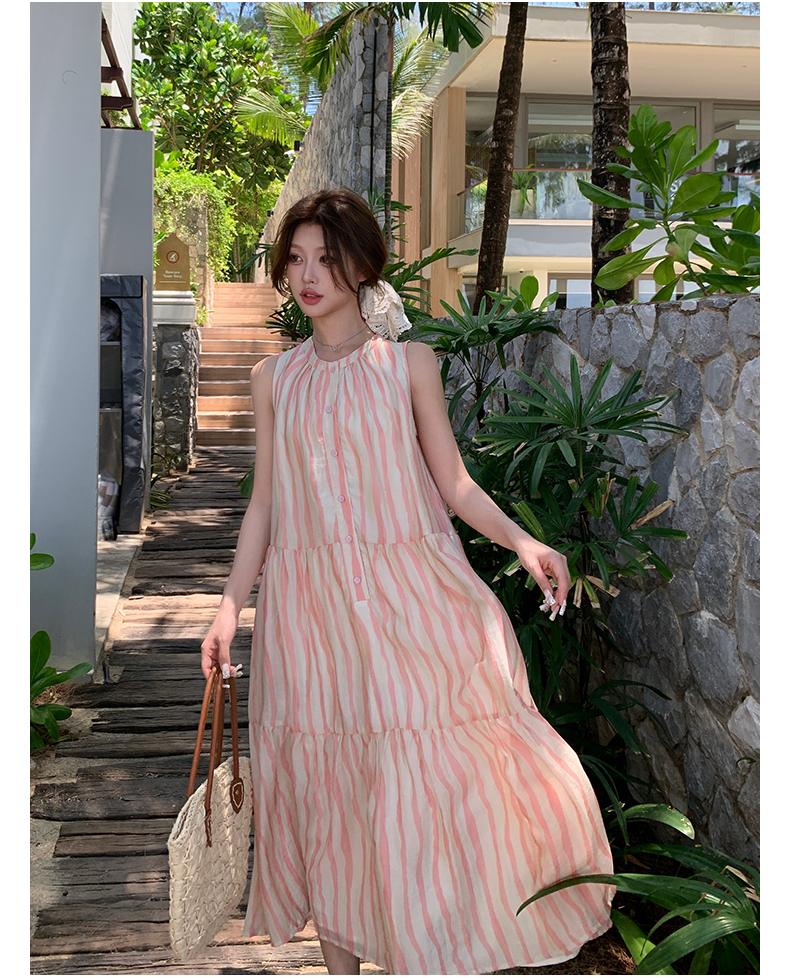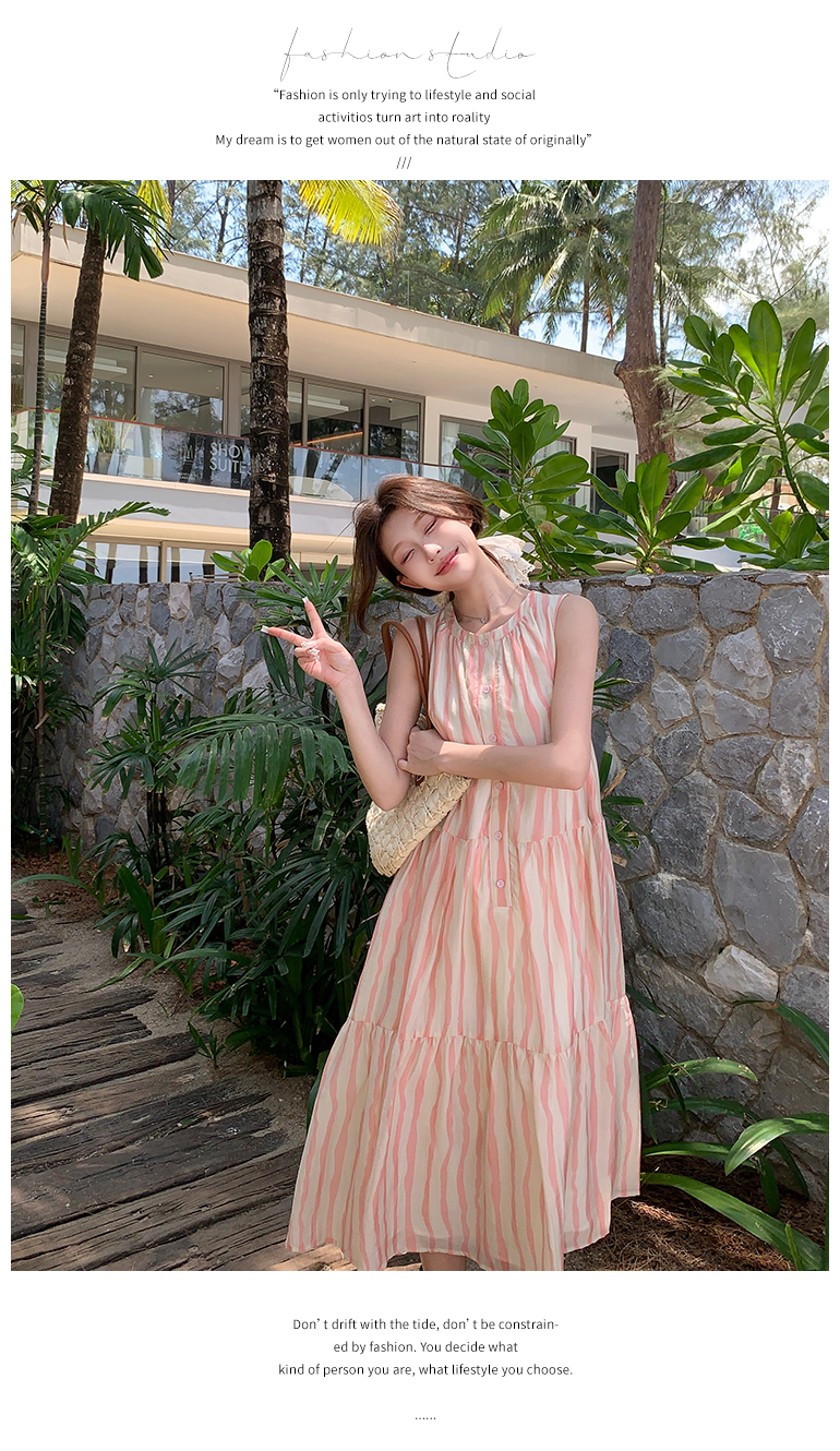 【商品名】【ワンピース】夏 アート感 都市リゾート風 ピンクストライプ ノースリーブワンピース【SHシリーズ】