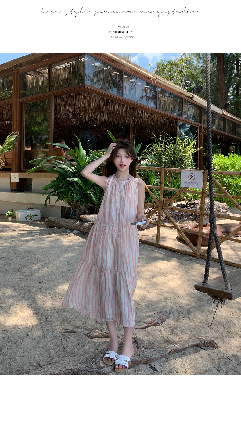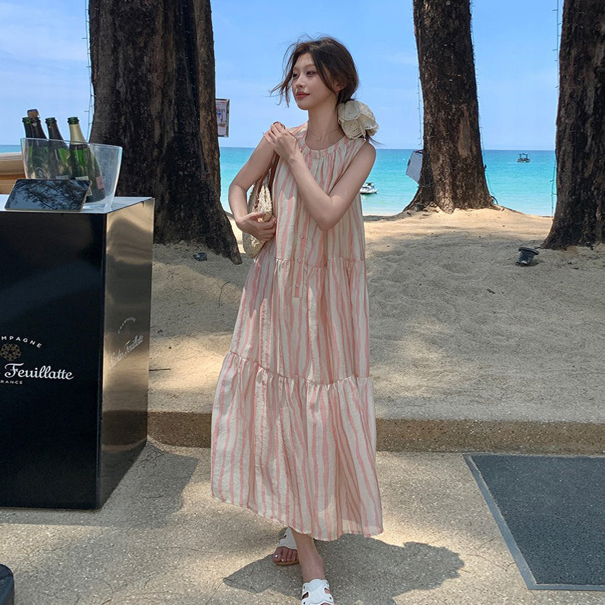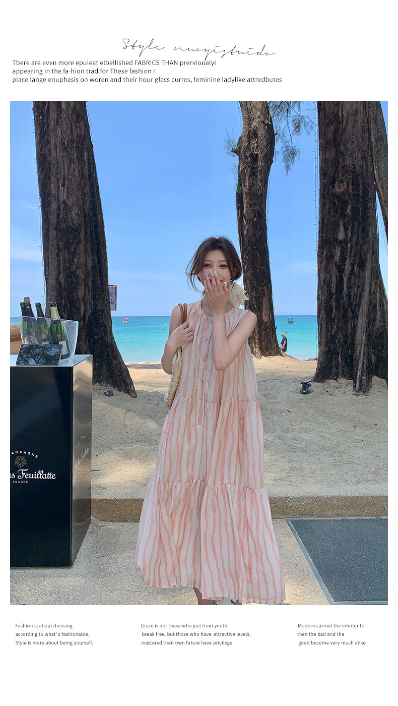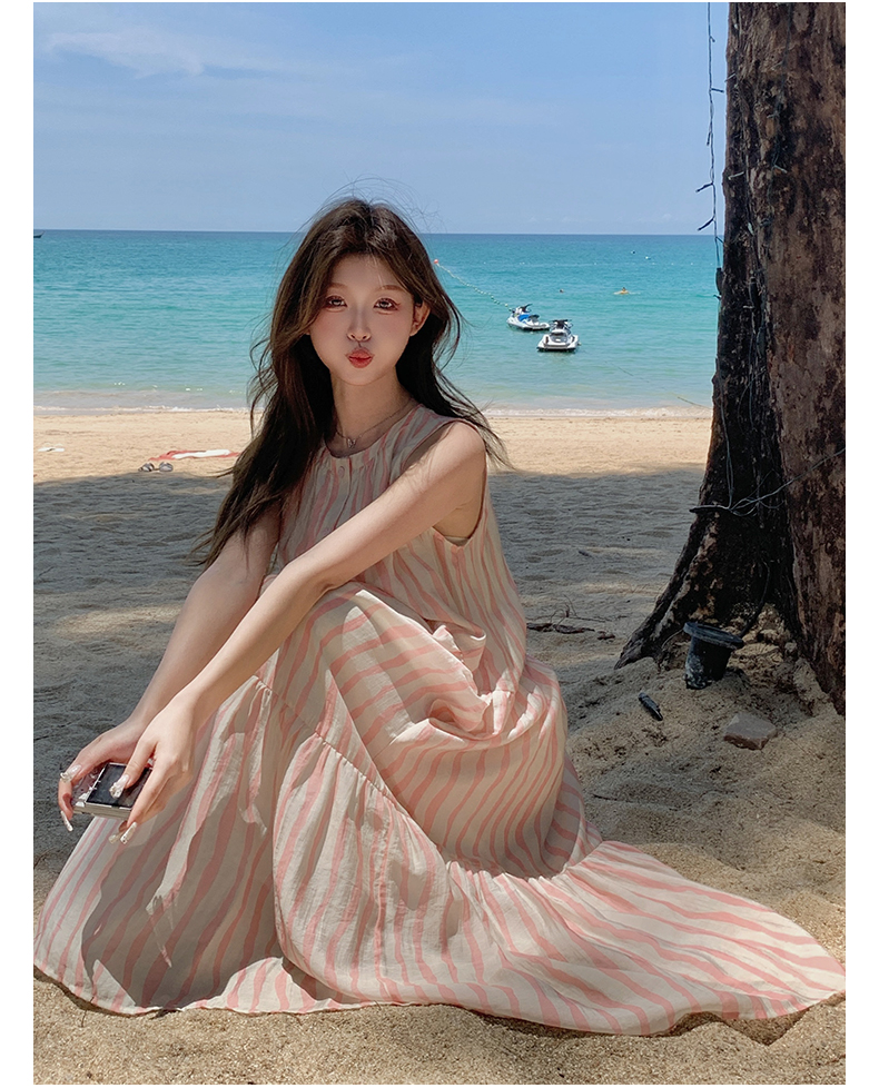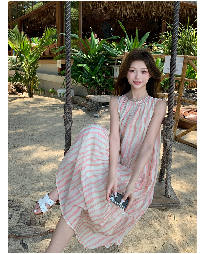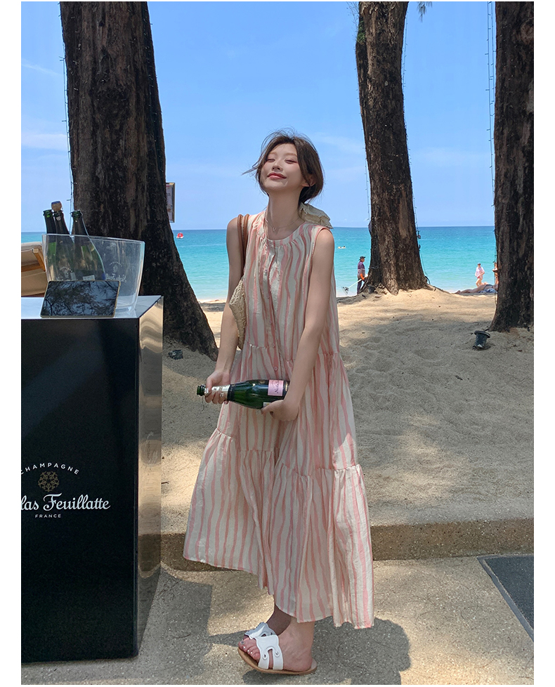 【商品名】【ワンピース】夏 アート感 都市リゾート風 ピンクストライプ ノースリーブワンピース【SHシリーズ】