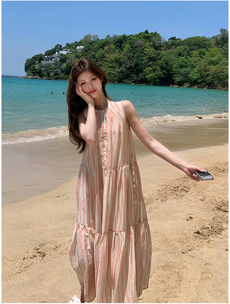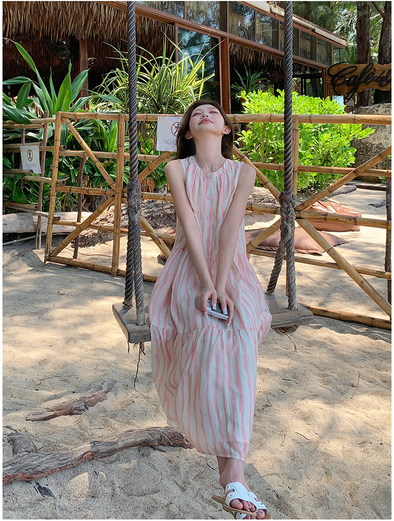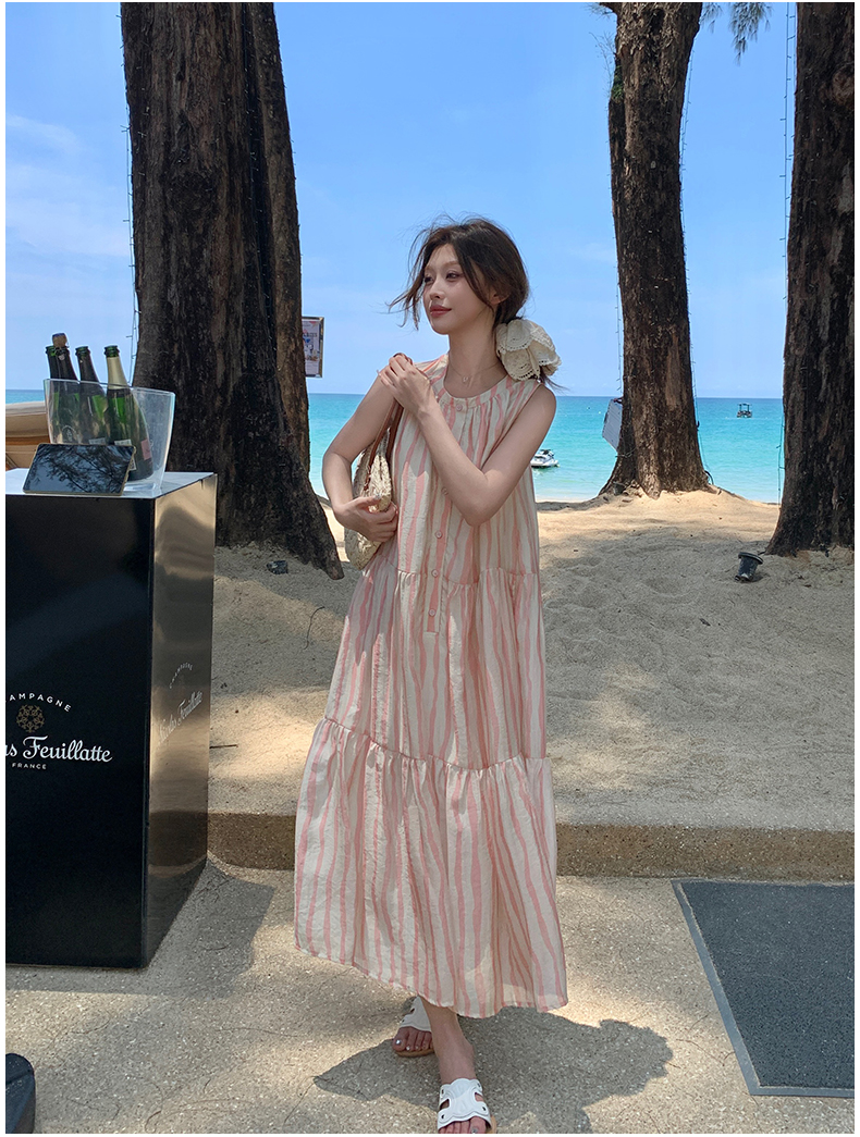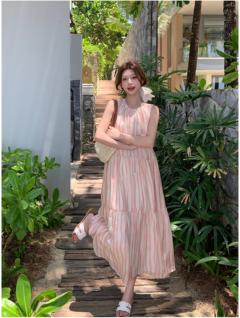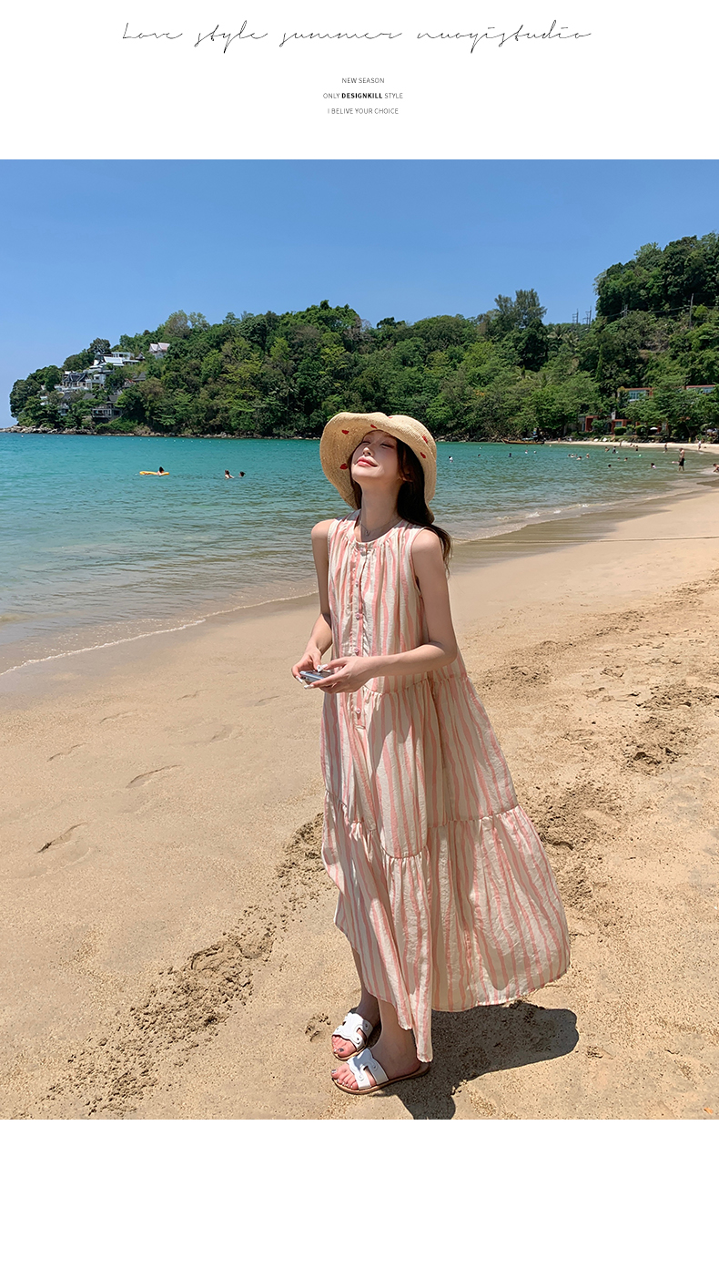 【商品名】【ワンピース】夏 アート感 都市リゾート風 ピンクストライプ ノースリーブワンピース【SHシリーズ】