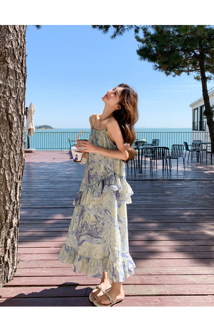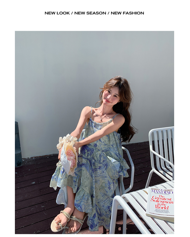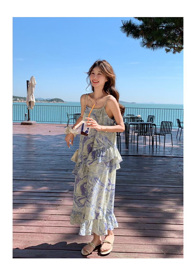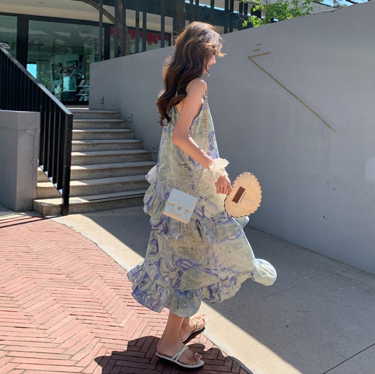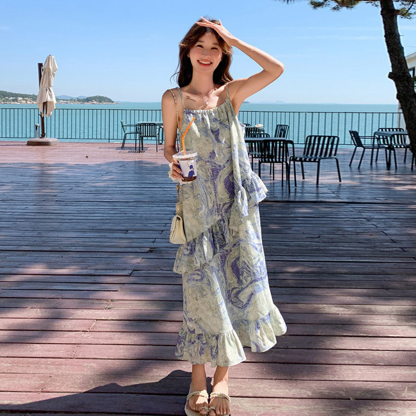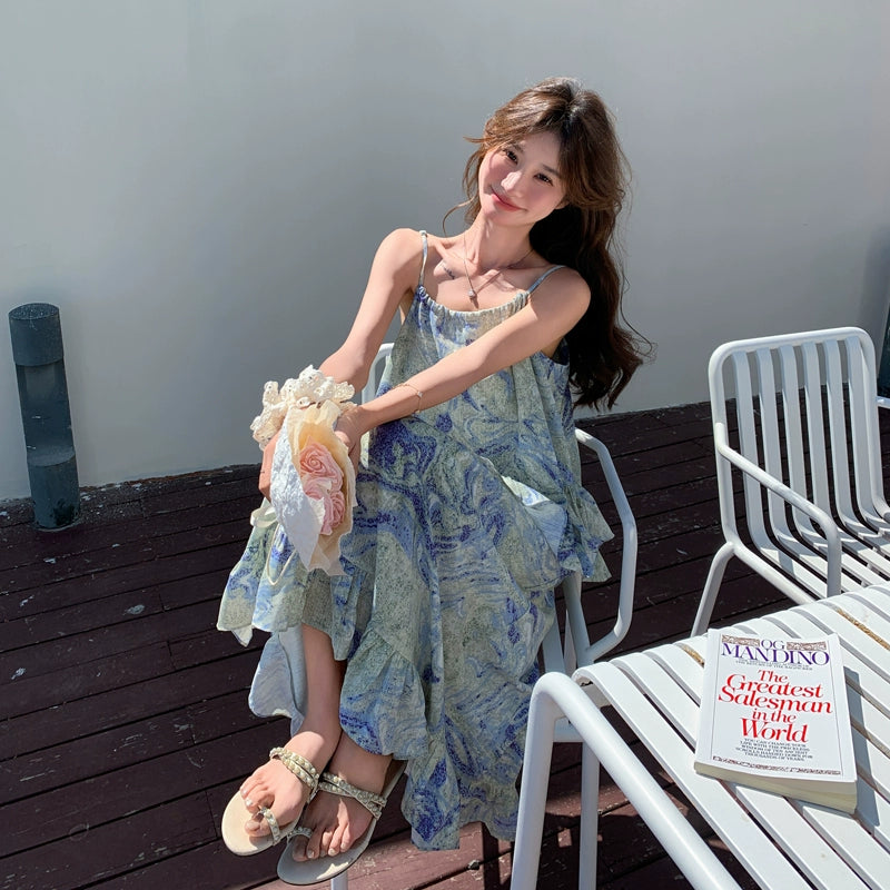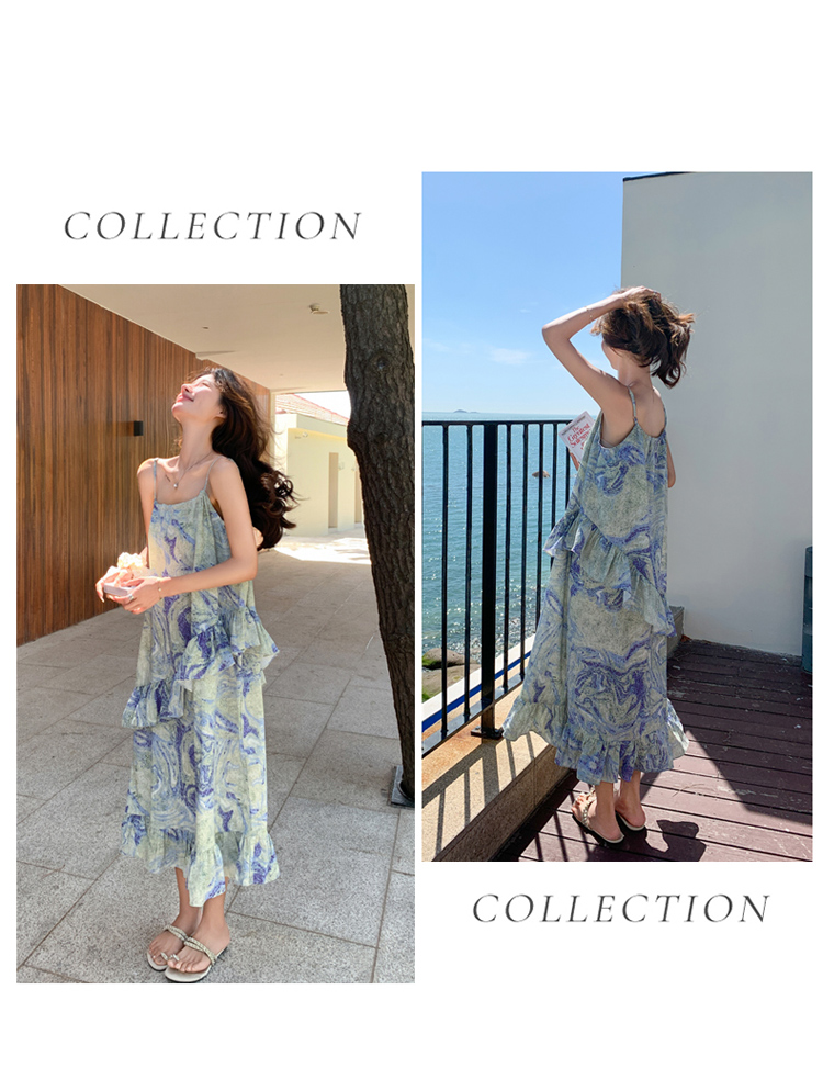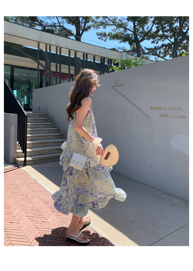 【ワンピース】フレンチロマンティック 油絵風 ノースリーブキャミワンピース 夏 ビーチリゾートドレス【SHシリーズ】