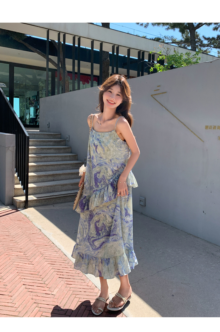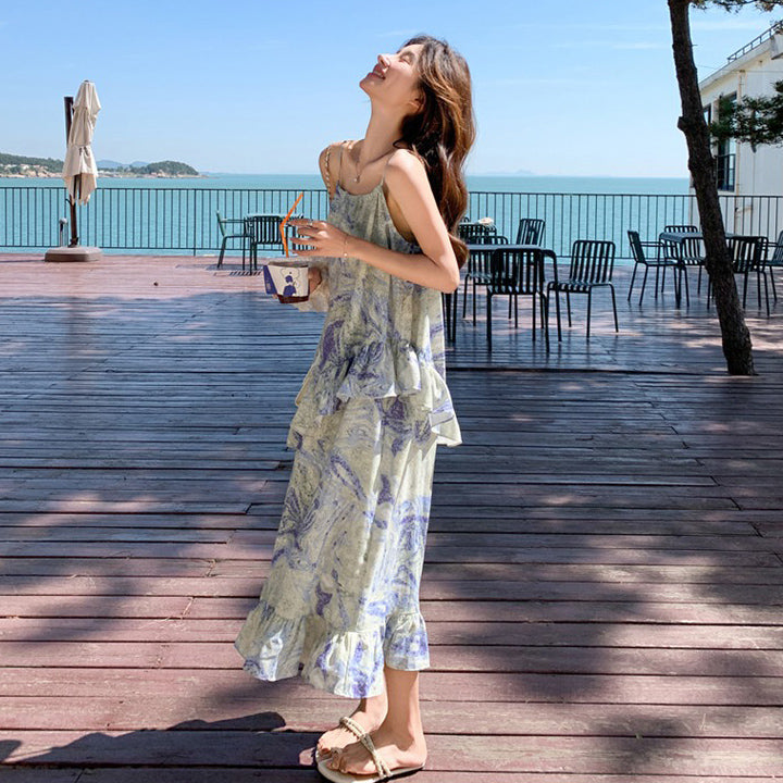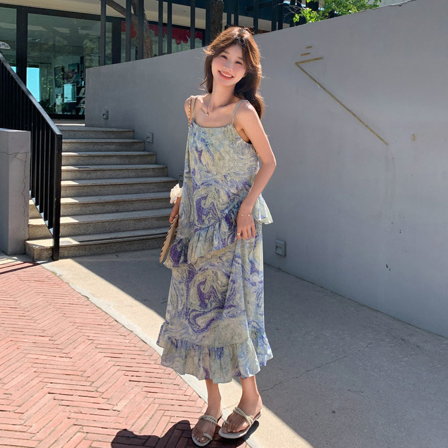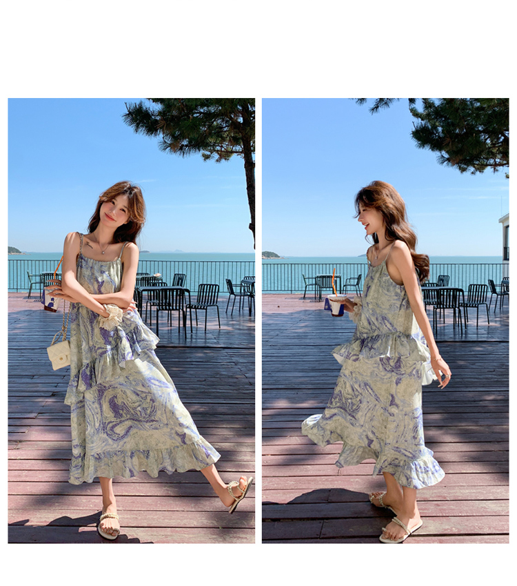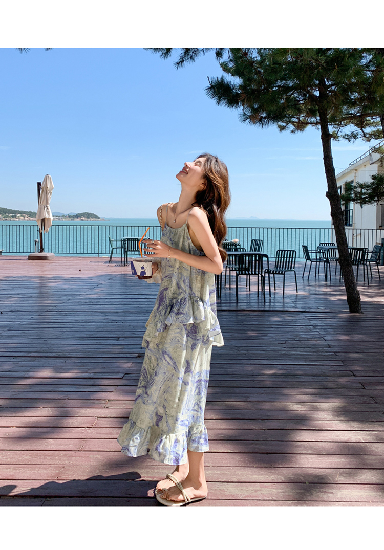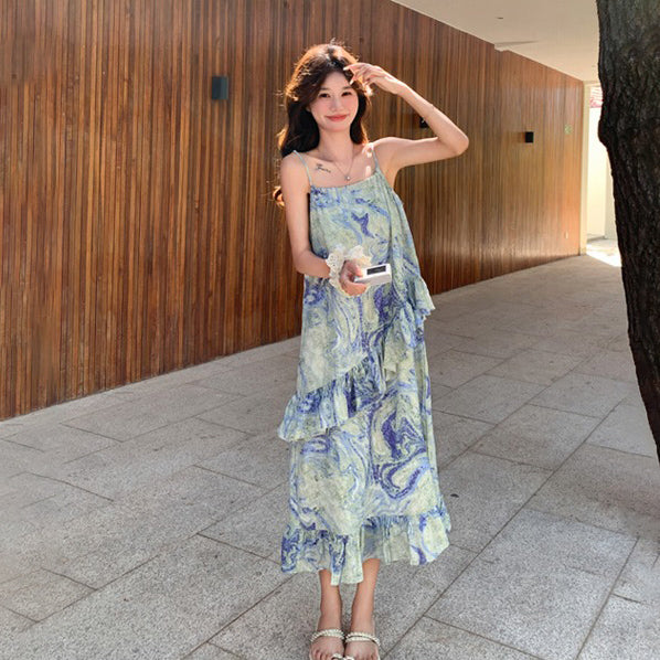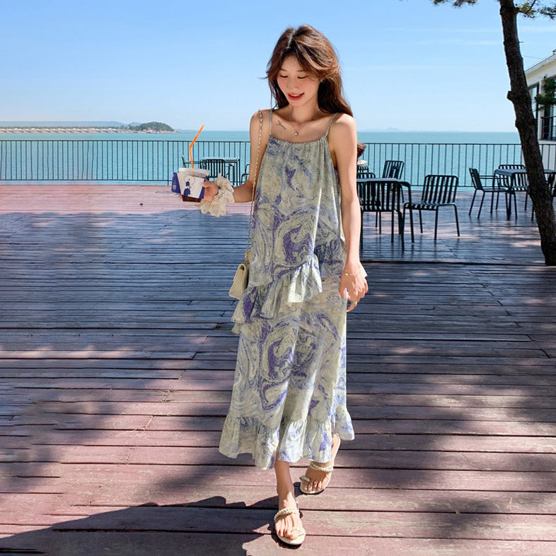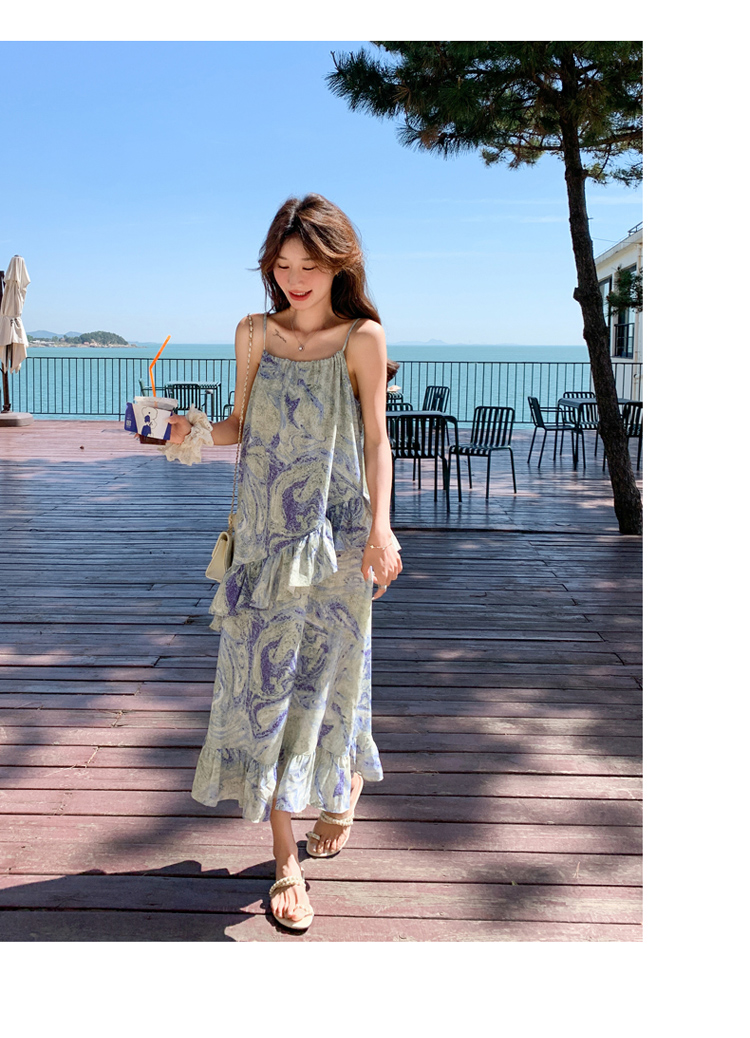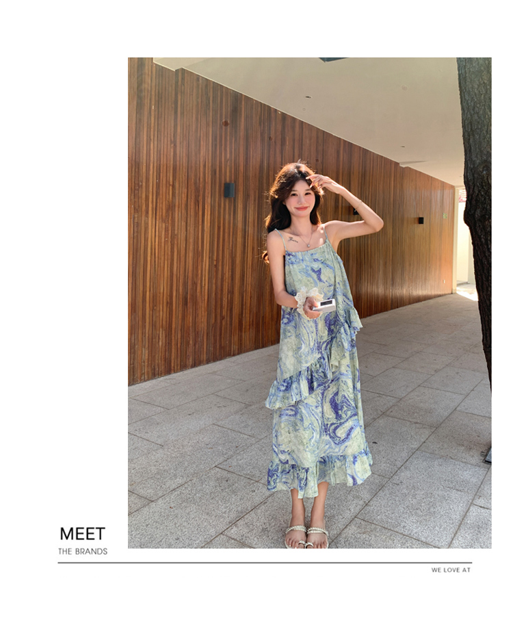 【ワンピース】フレンチロマンティック 油絵風 ノースリーブキャミワンピース 夏 ビーチリゾートドレス【SHシリーズ】