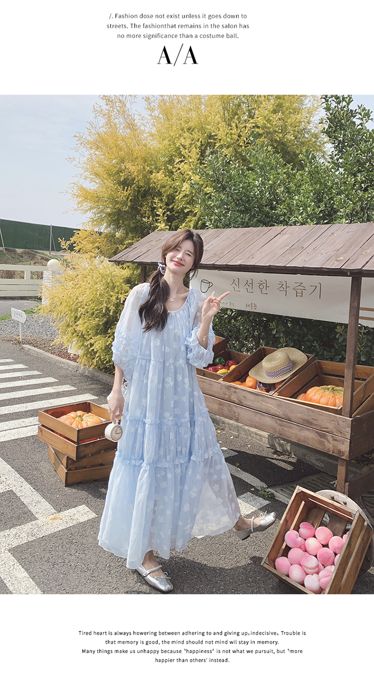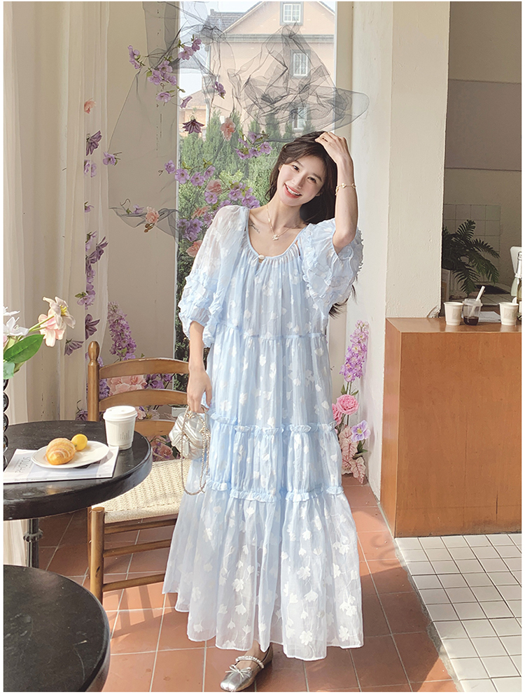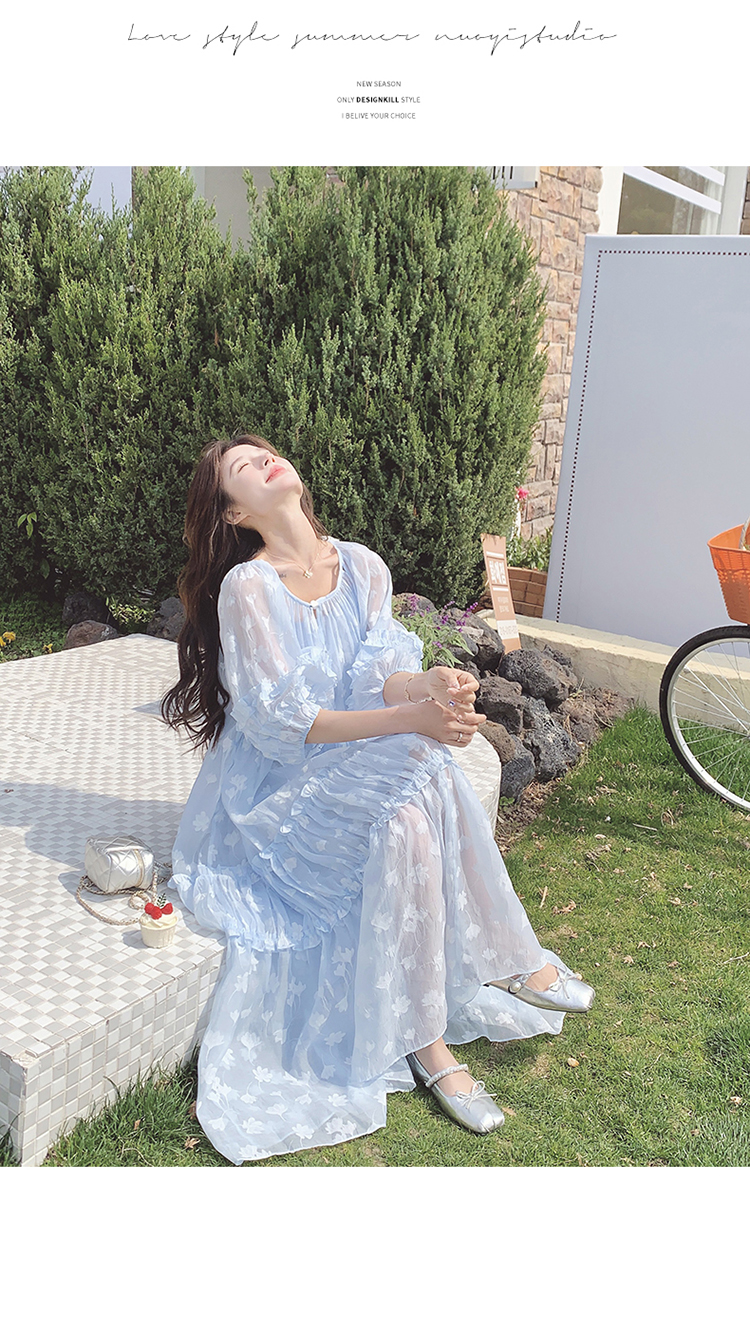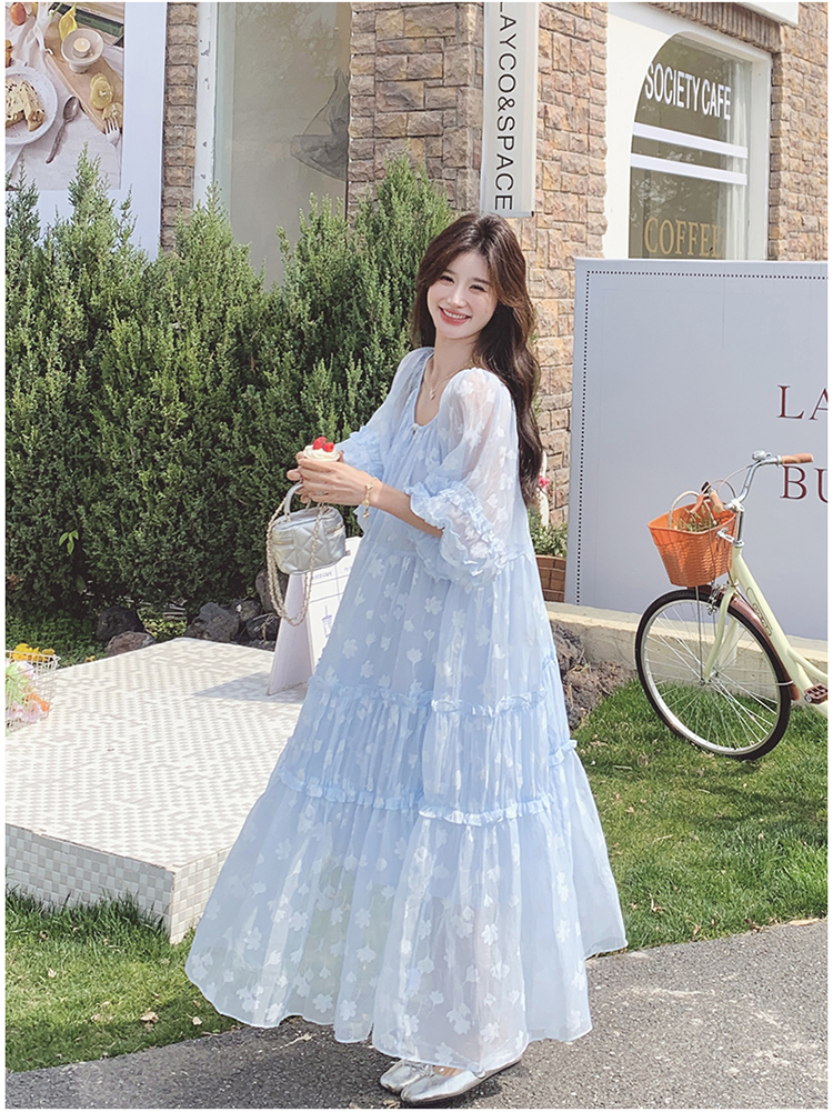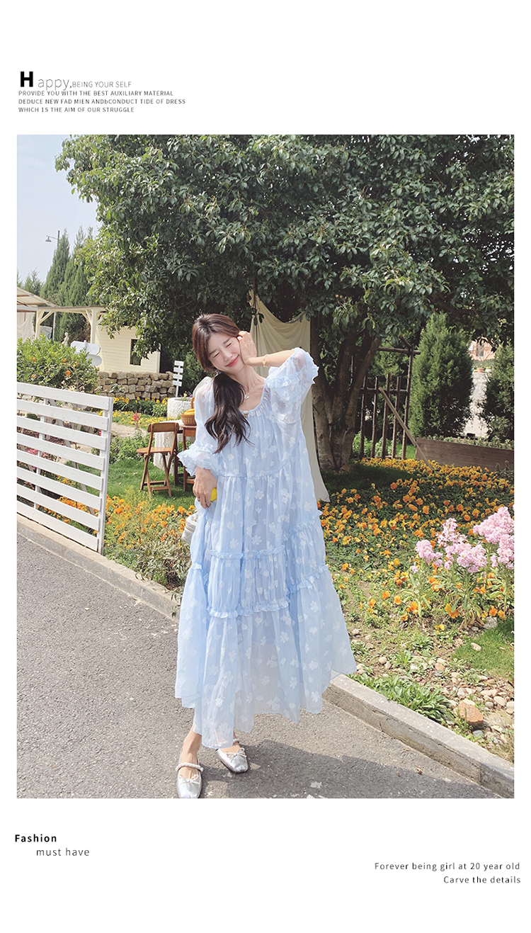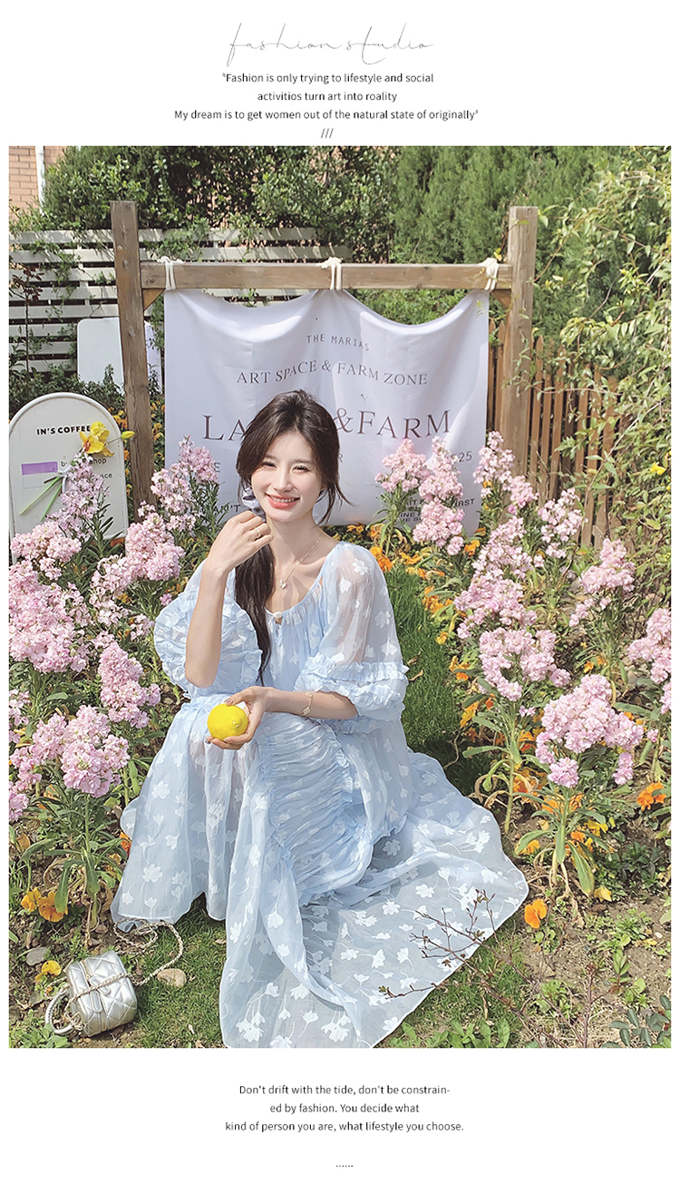 【ワンピース】ライトブルー 七分袖 小花柄 ワンピース レディース 夏 ロマンチック スイート系 フレアシルエット フェアリードレス【SHシリーズ】