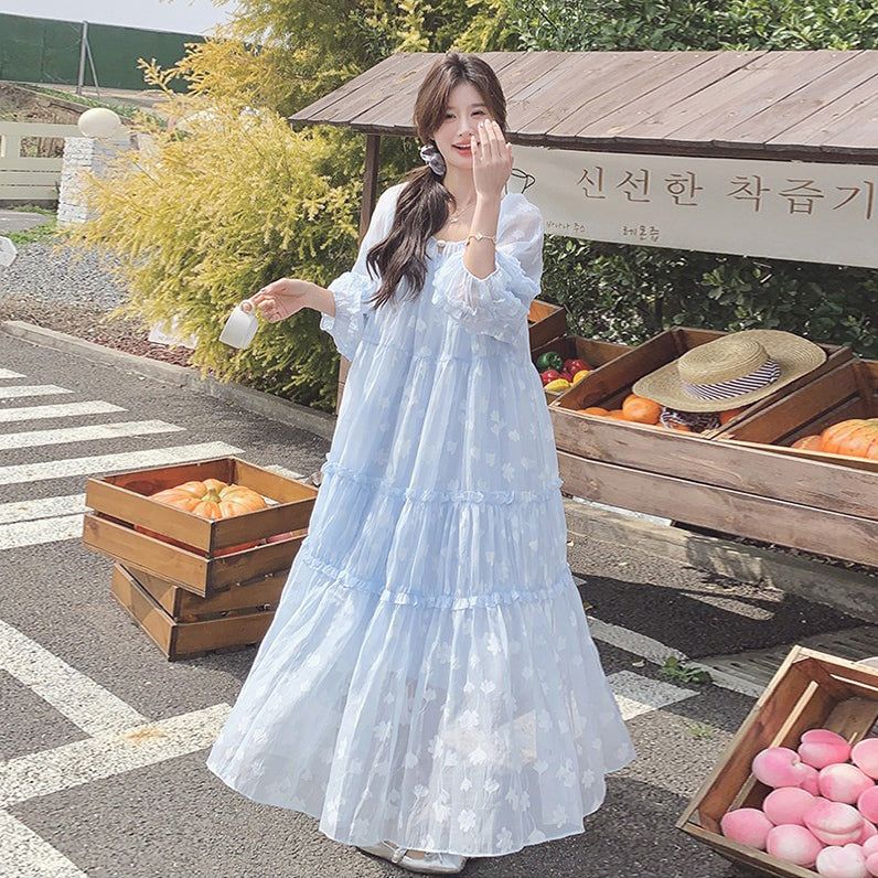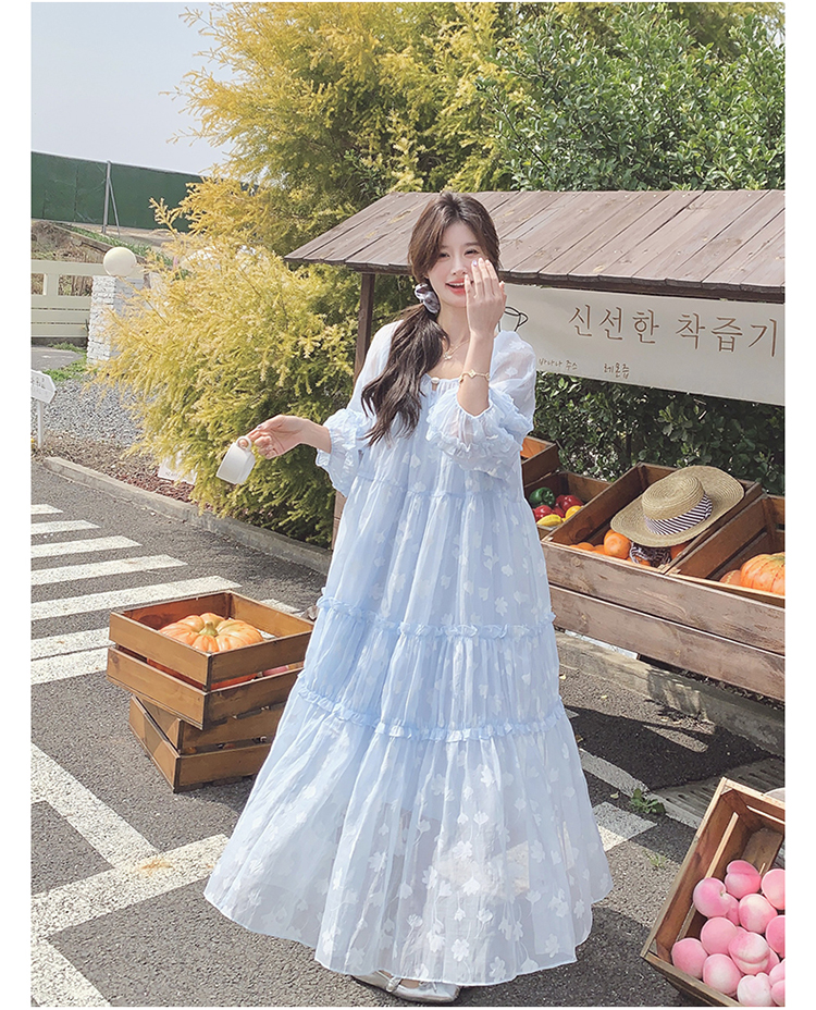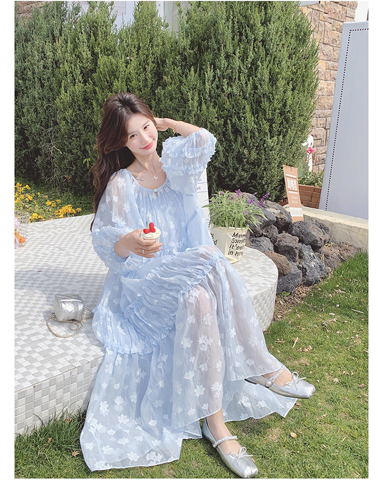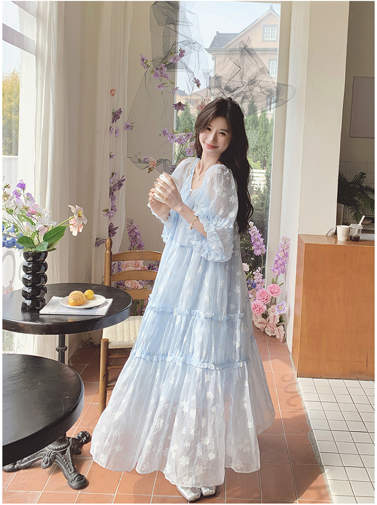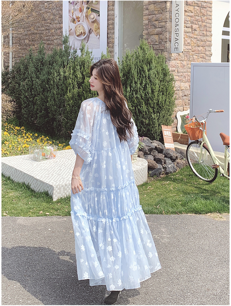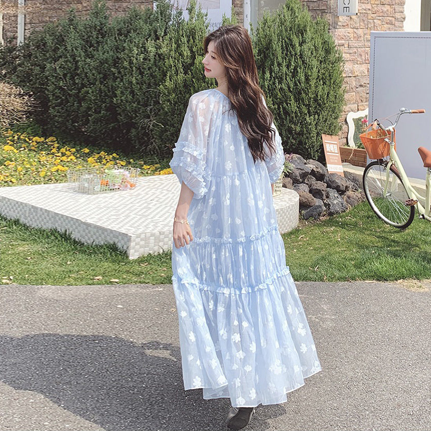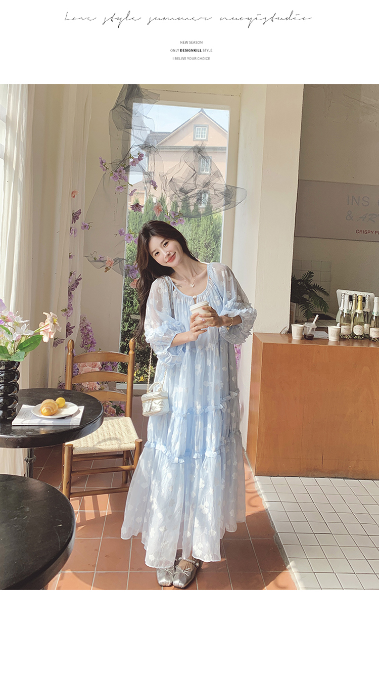 【ワンピース】ライトブルー 七分袖 小花柄 ワンピース レディース 夏 ロマンチック スイート系 フレアシルエット フェアリードレス【SHシリーズ】
