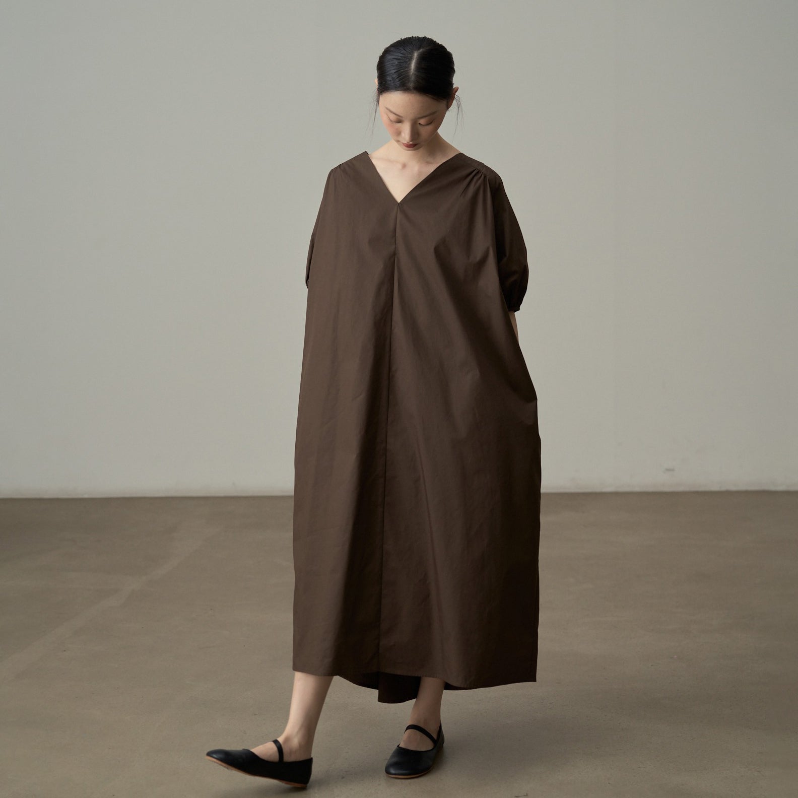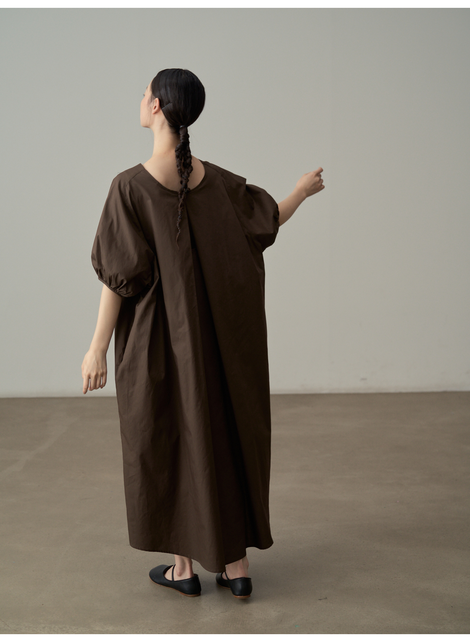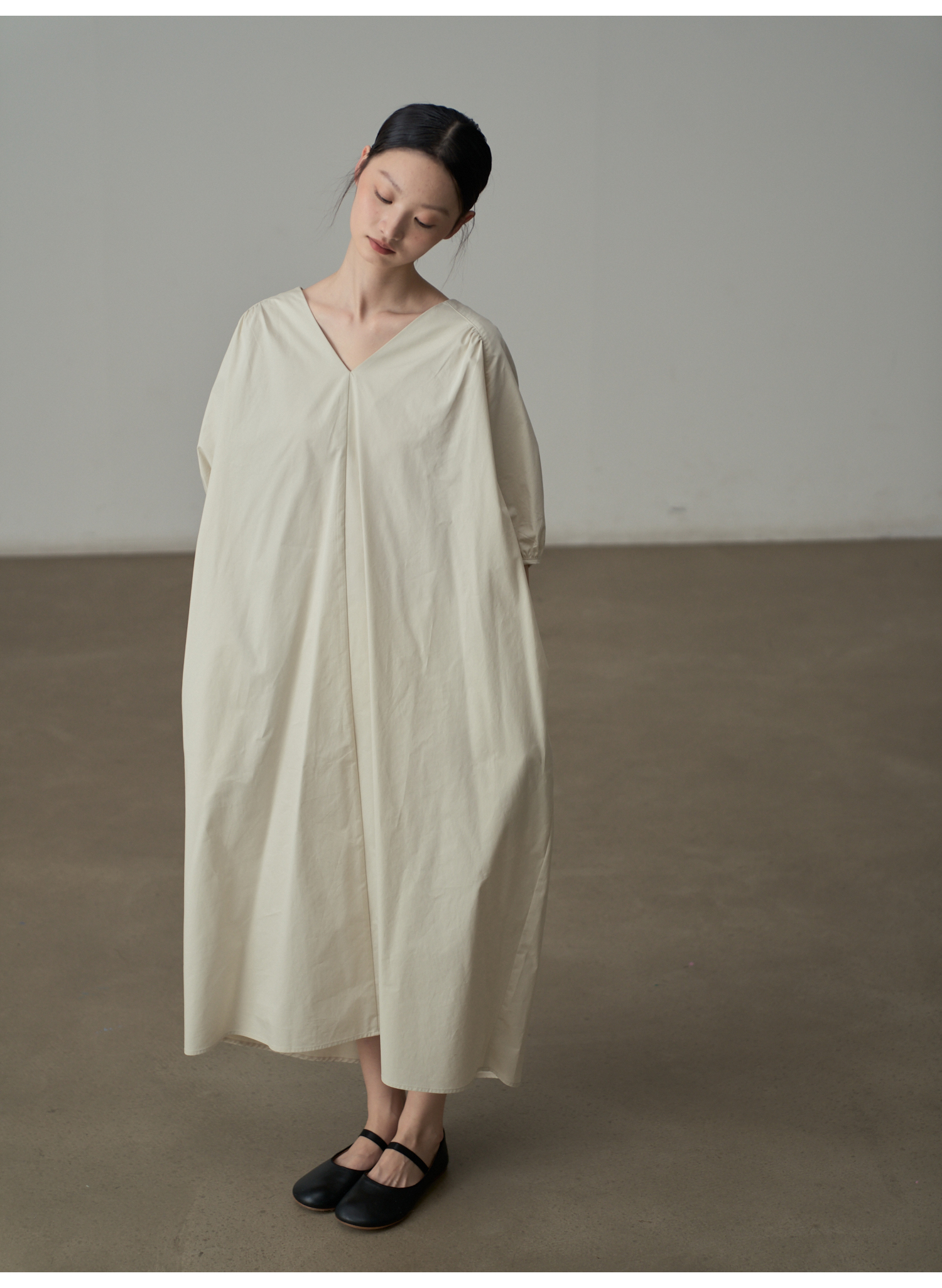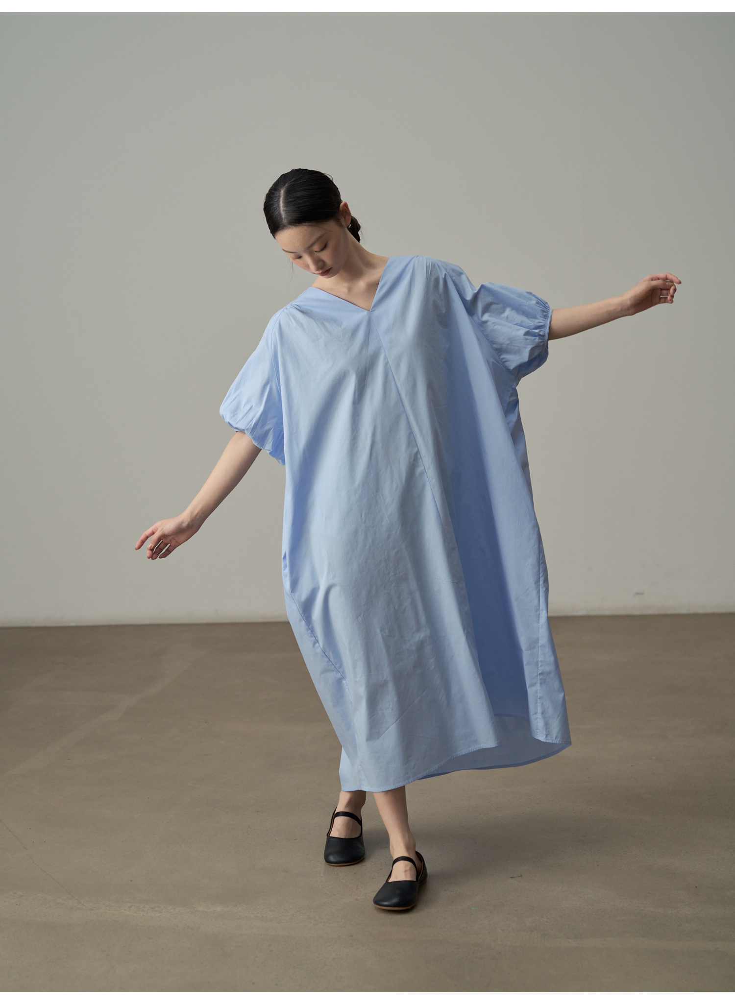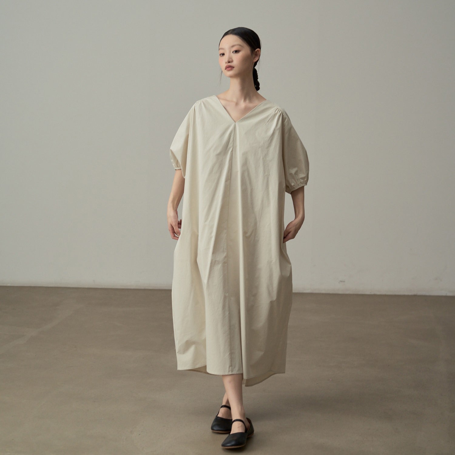 【ワンピース】夏新作 フランス風 Vネック パフ袖 無地ロングドレス 後ろ開き ゆったりシルエット 半袖ワンピース【JZシリーズ】