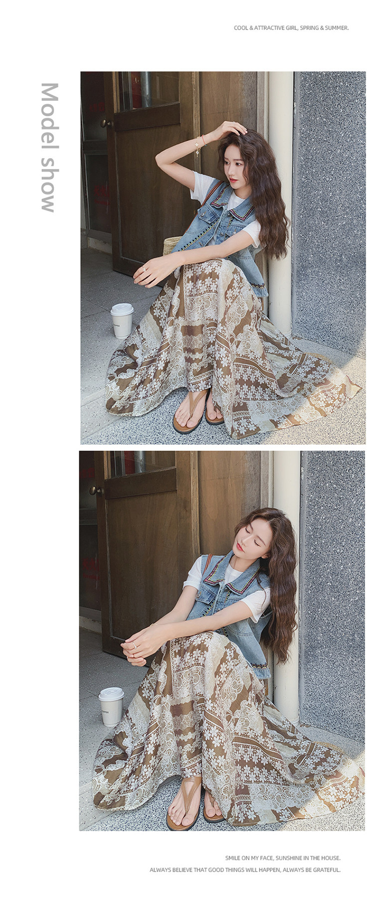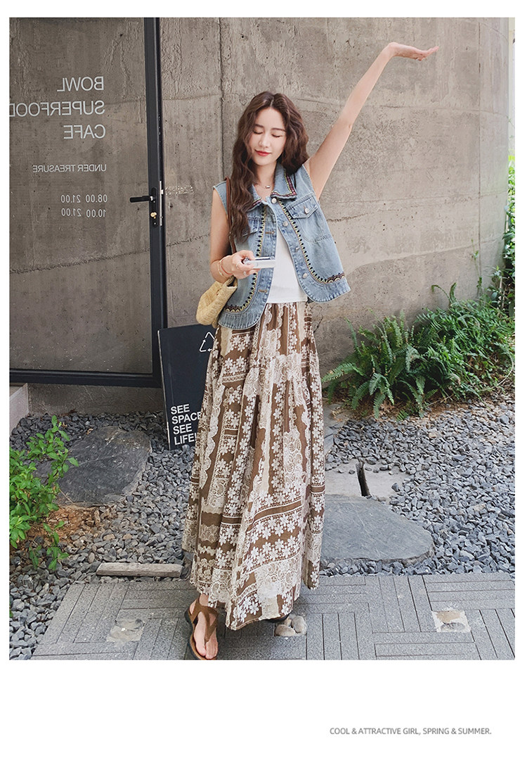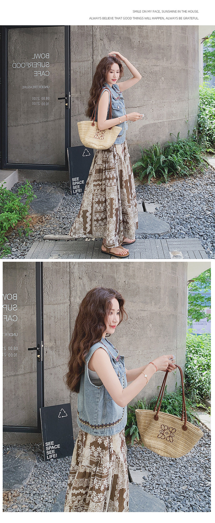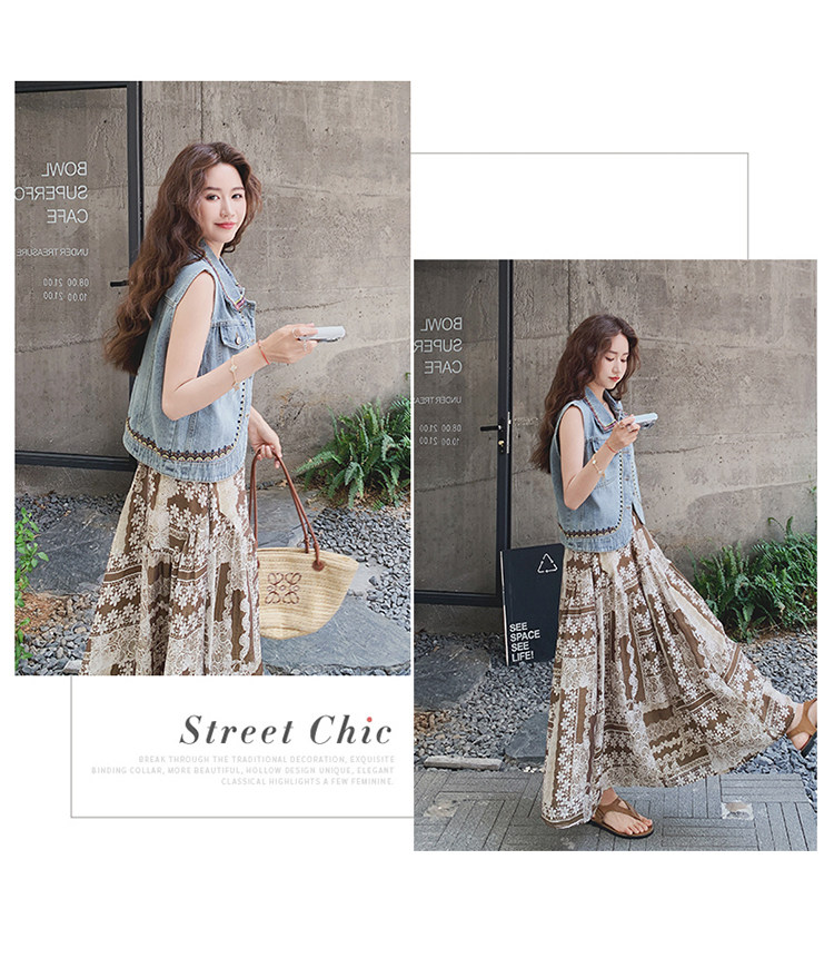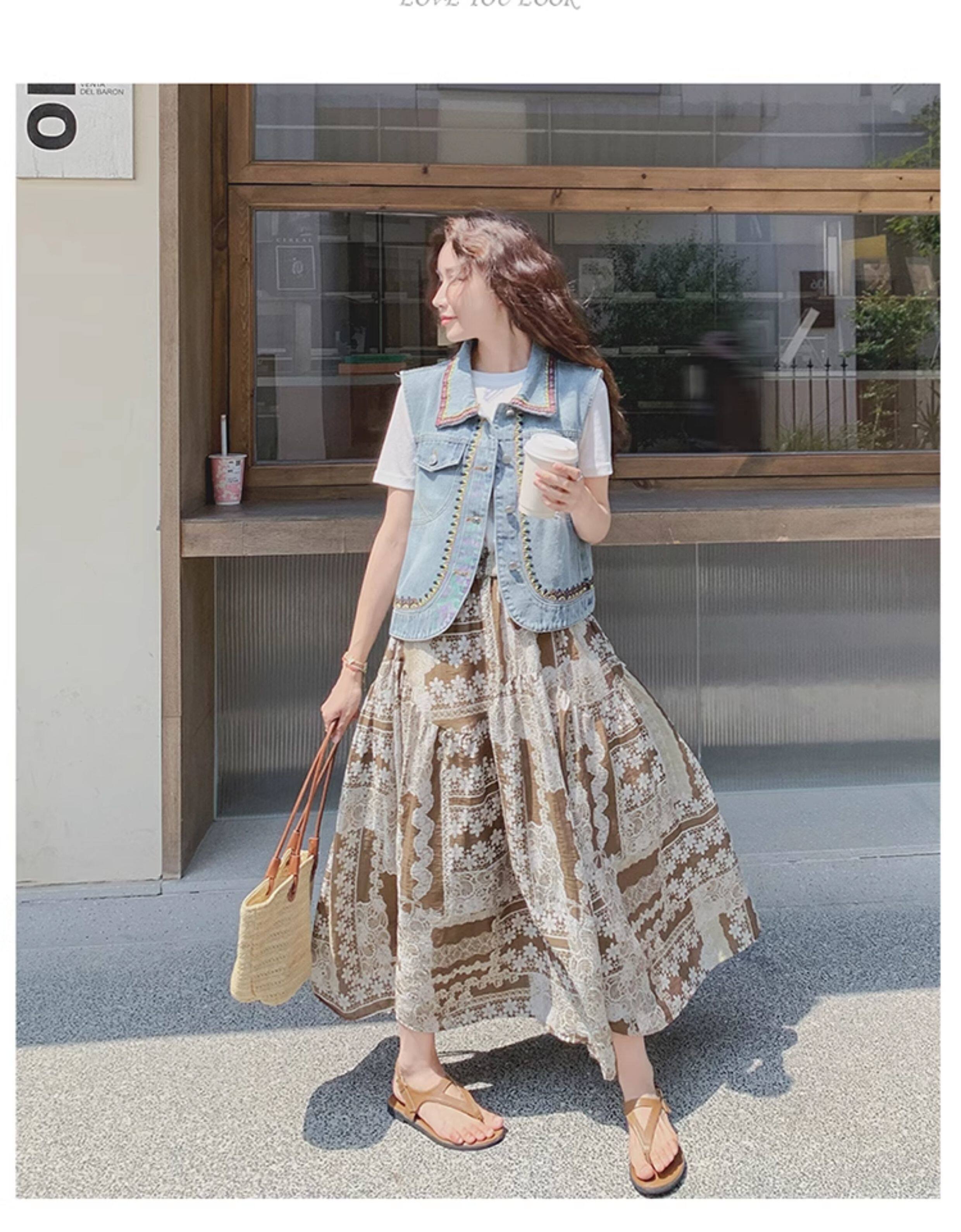 2点セット!【セットアップ】夏 ボヘミアン×塩系スタイル 刺繍デニムベスト + プリントスカート 2点上下セットアップ【SHシリーズ】