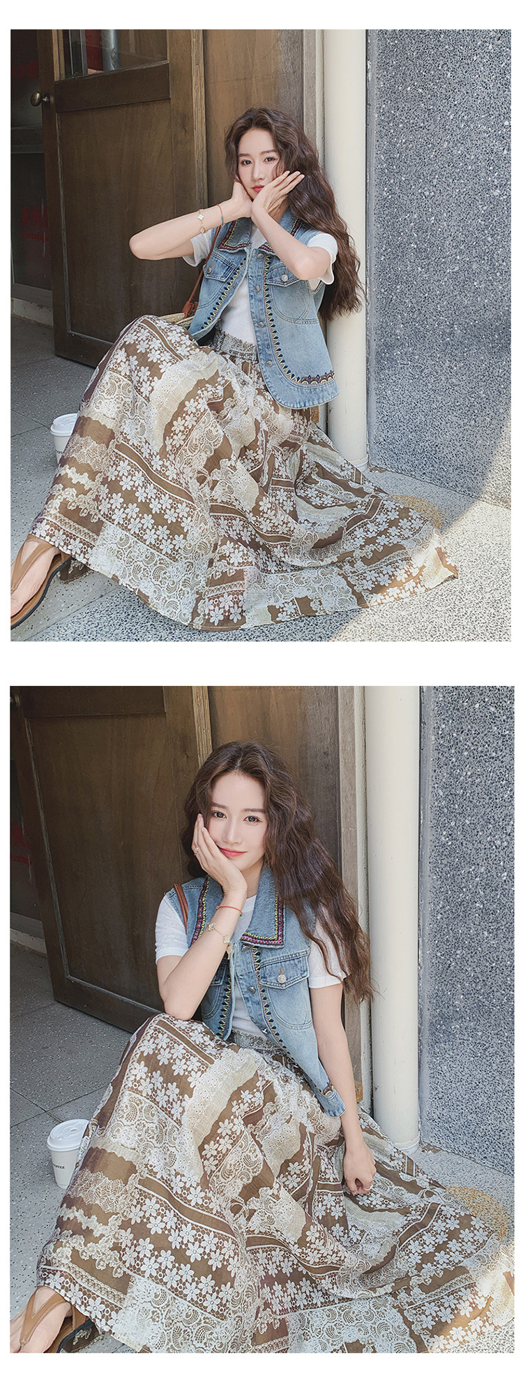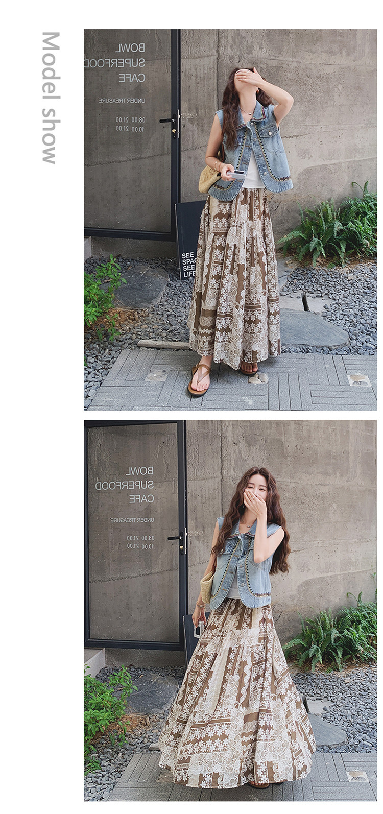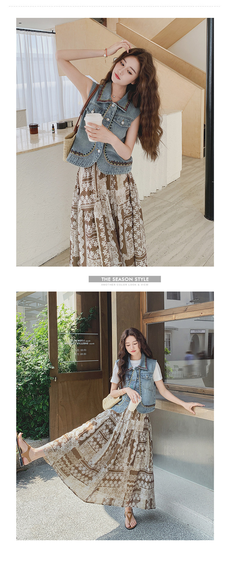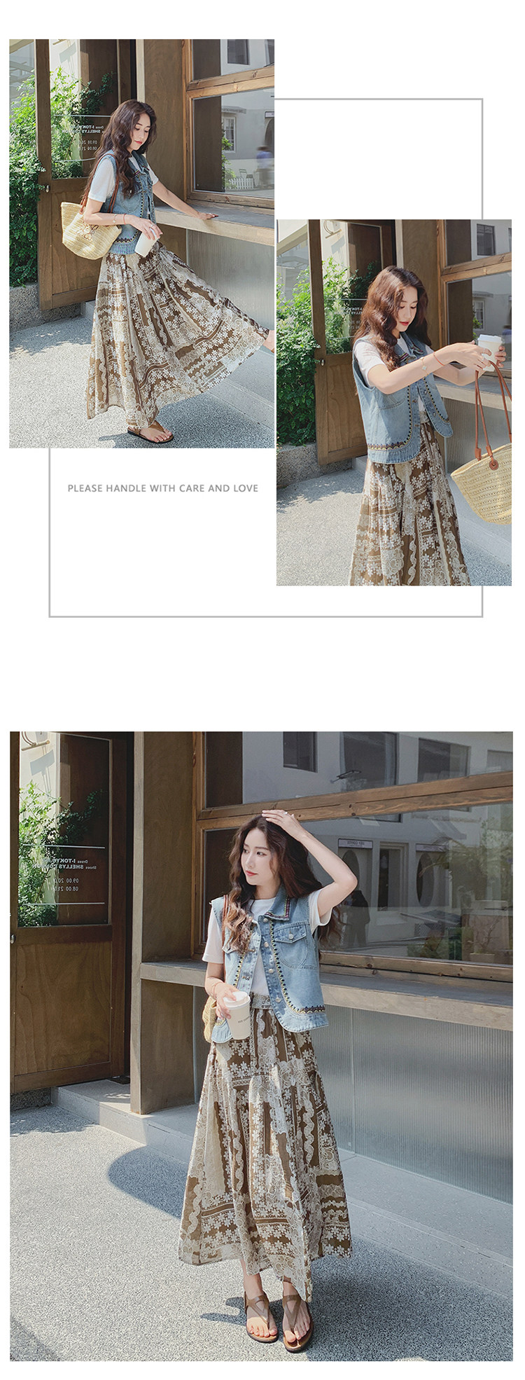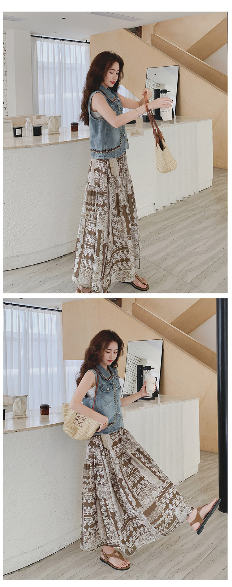 2点セット!【セットアップ】夏 ボヘミアン×塩系スタイル 刺繍デニムベスト + プリントスカート 2点上下セットアップ【SHシリーズ】
