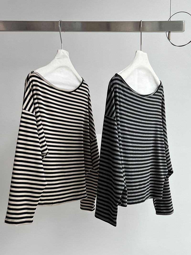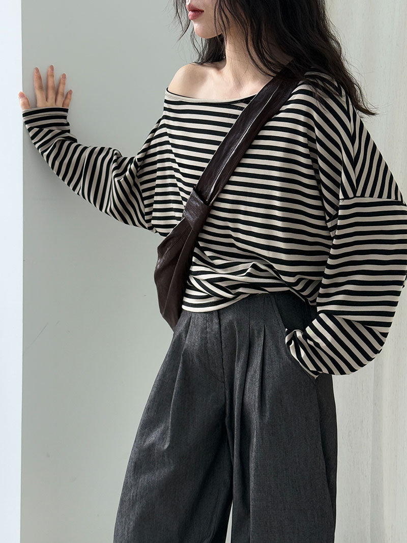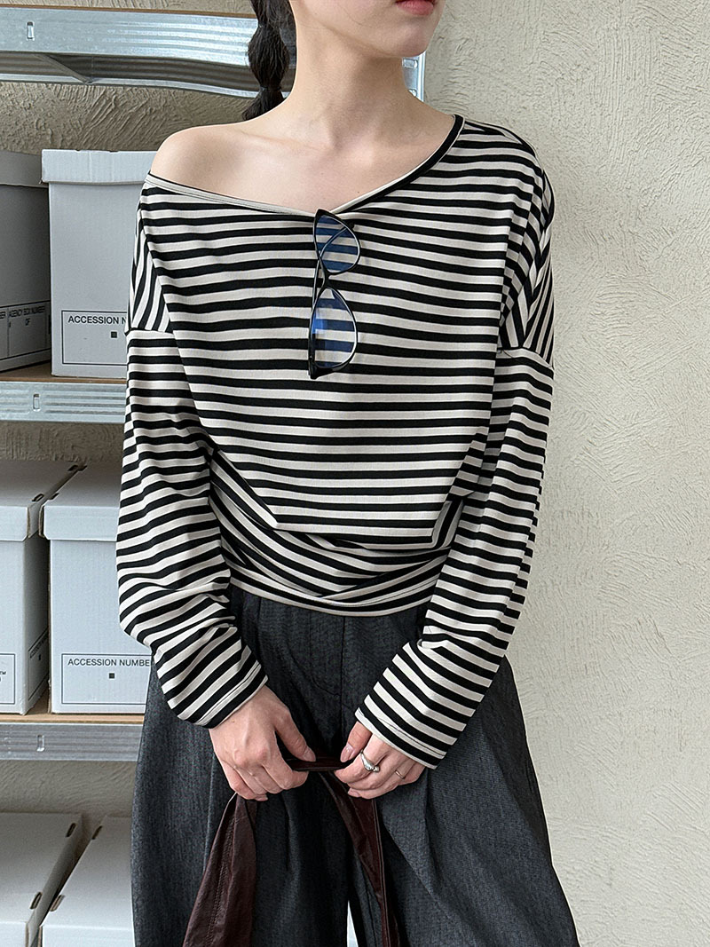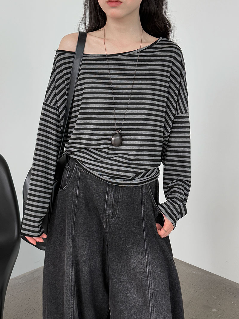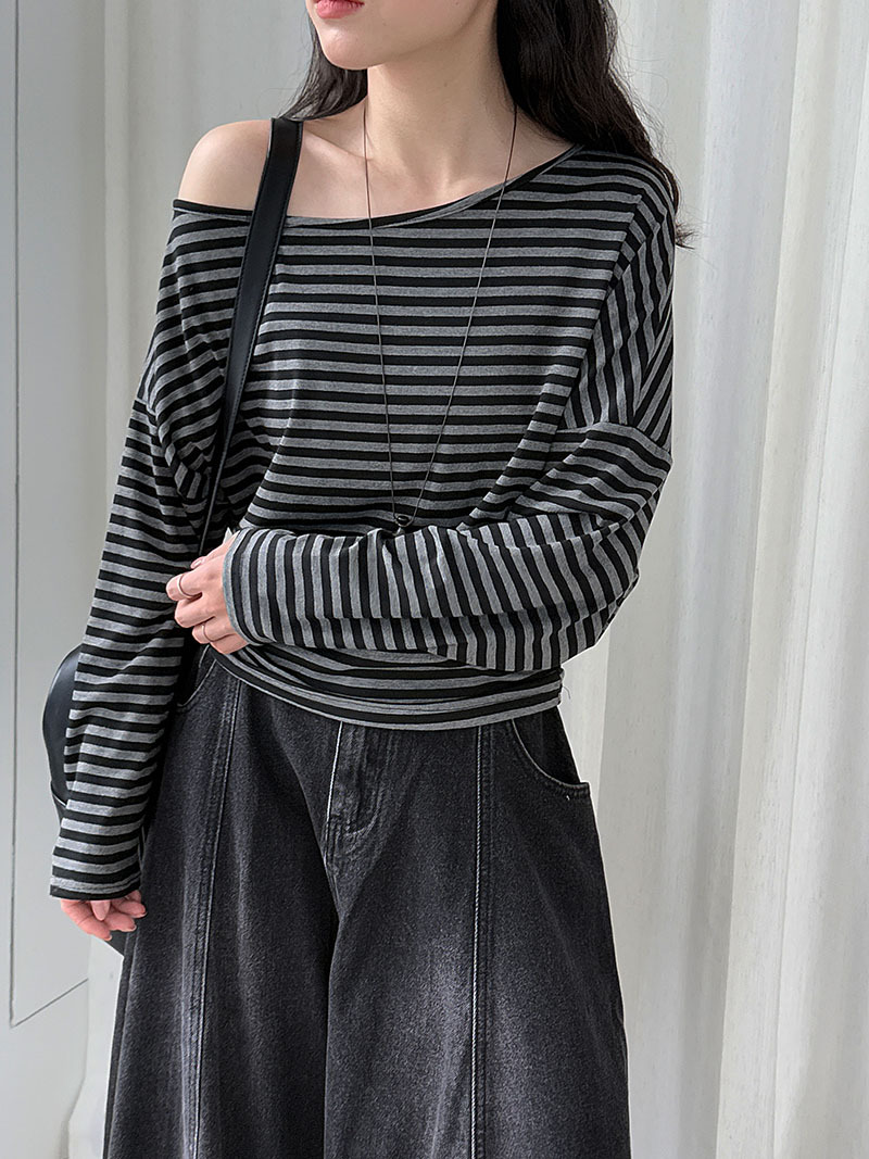 【トップス】韓国風ボーダー柄ワンショルダートップス|斜めオフショル×ゆるシルエットで抜け感&細見え【JZシリーズ】