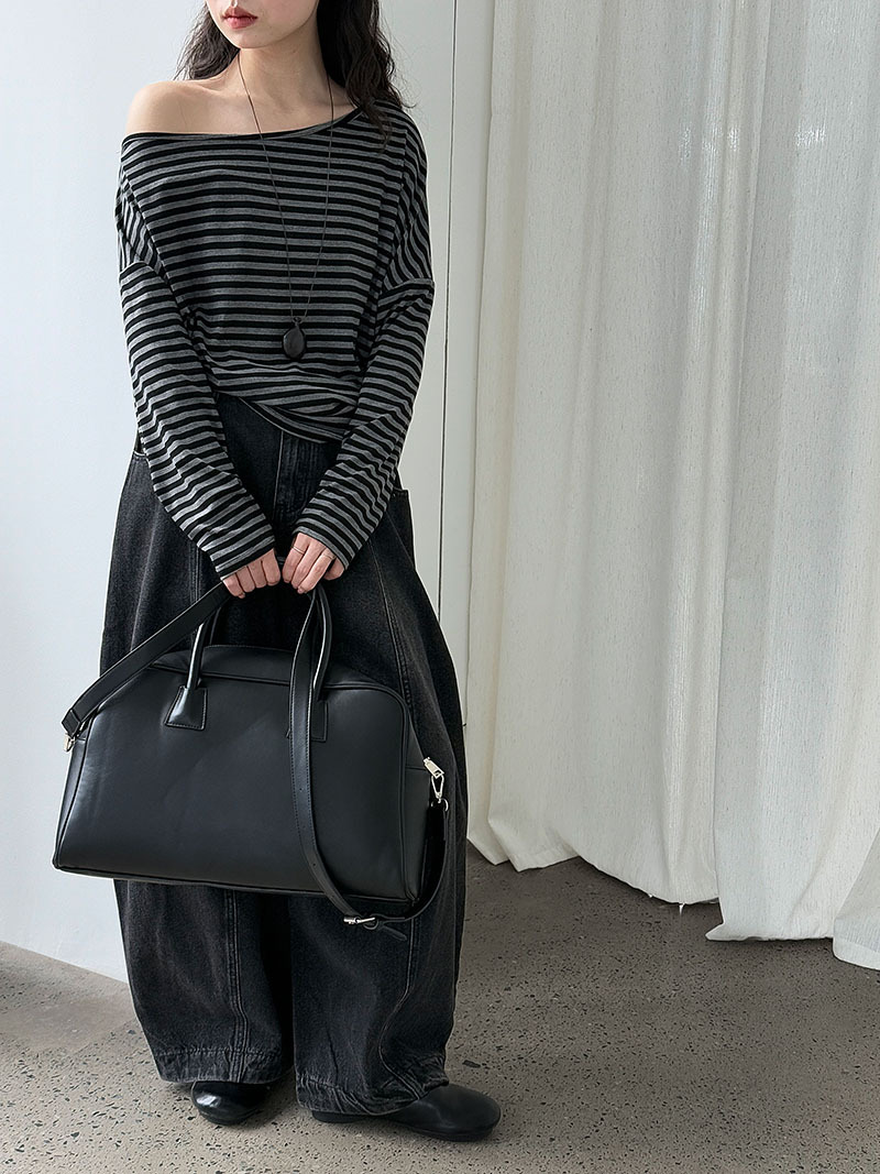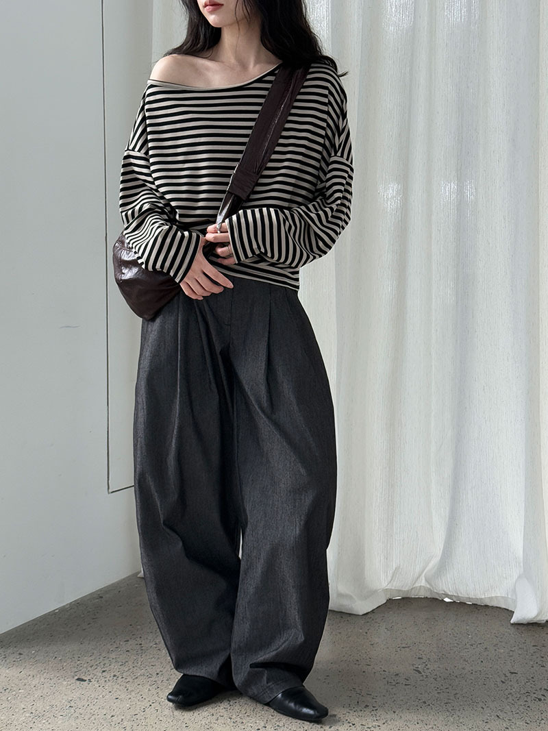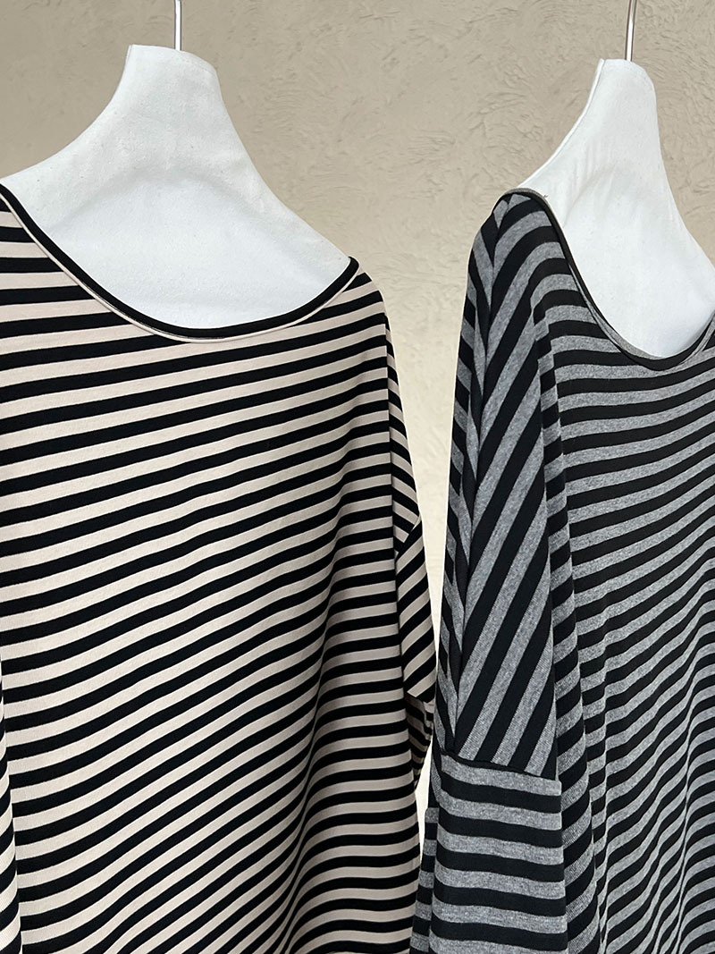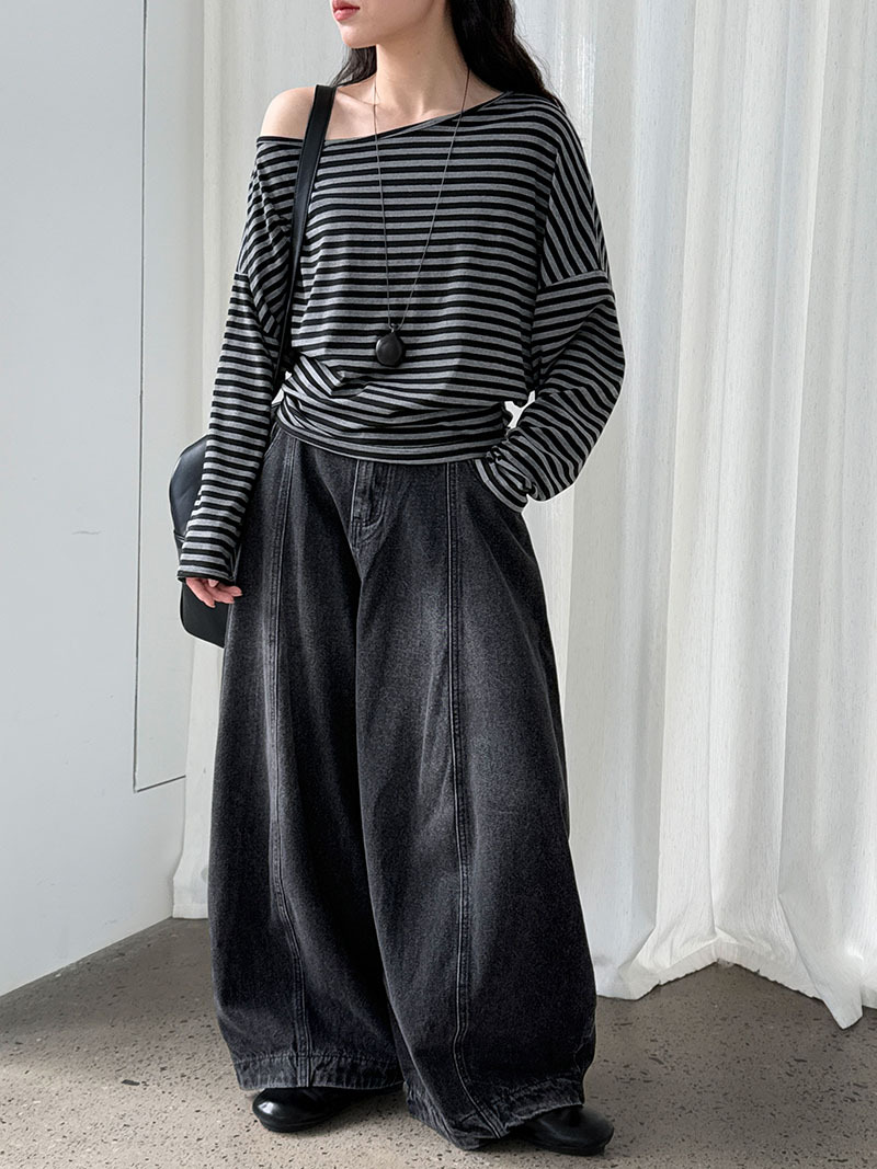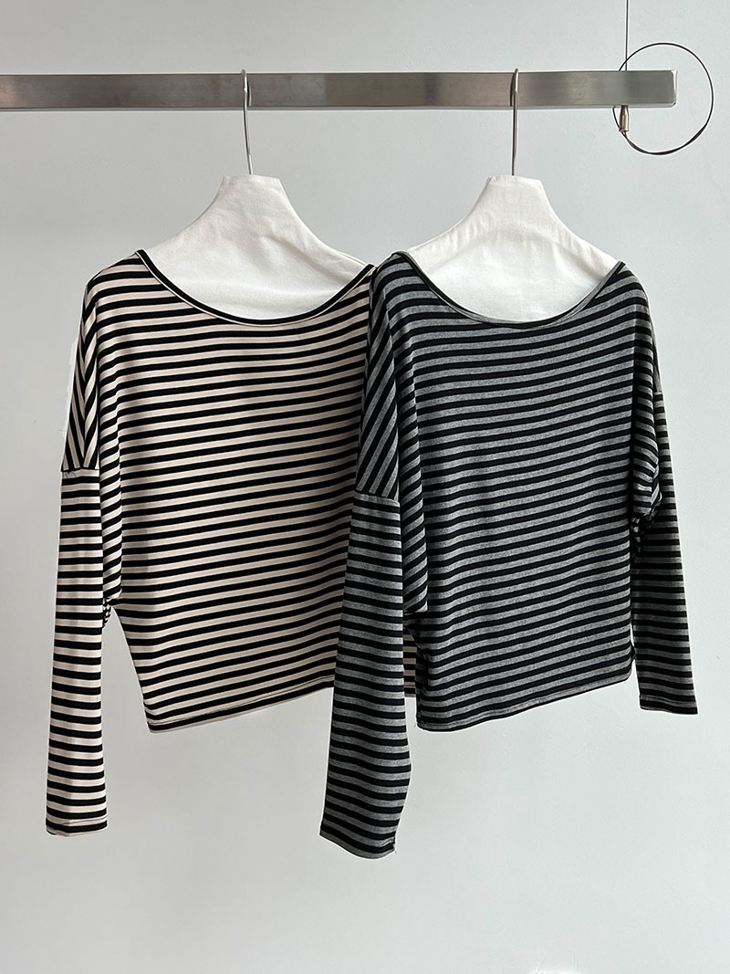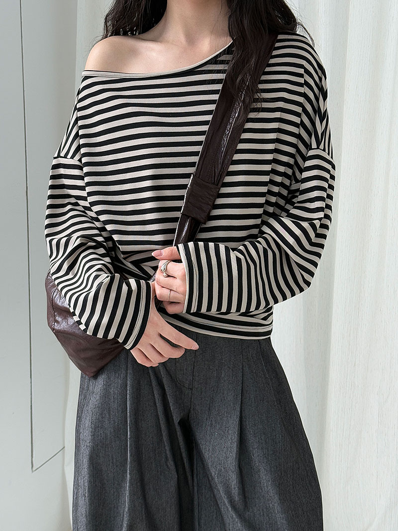 【トップス】韓国風ボーダー柄ワンショルダートップス|斜めオフショル×ゆるシルエットで抜け感&細見え【JZシリーズ】