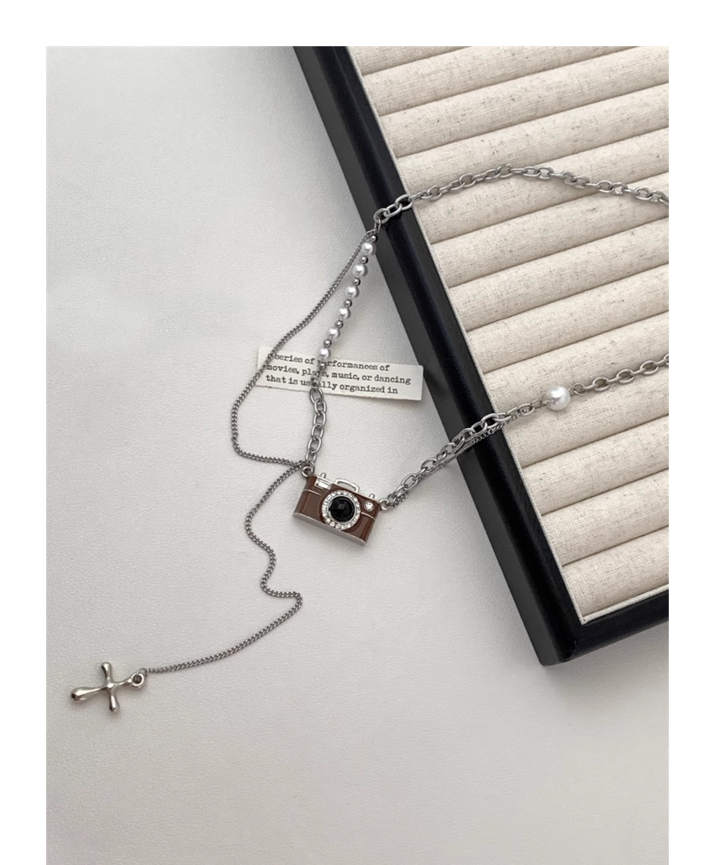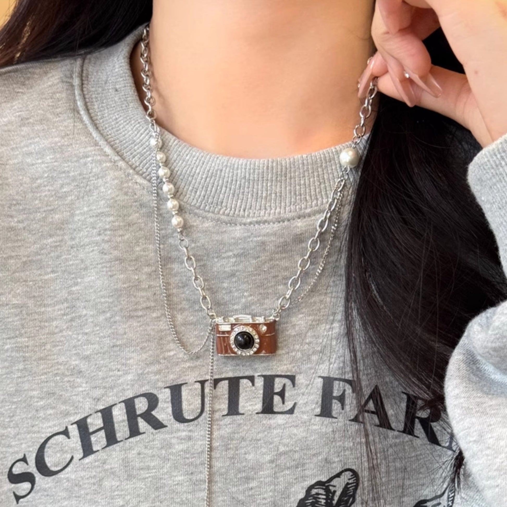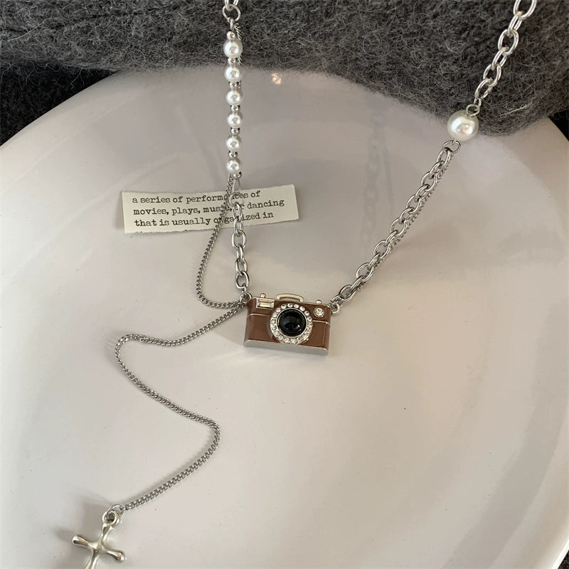 【🎁 B2G1|先行スタート!】【グッズ】ブラウン カメラモチーフ パールネックレス レディース個性的 ロングチェーン スウェットアクセサリー