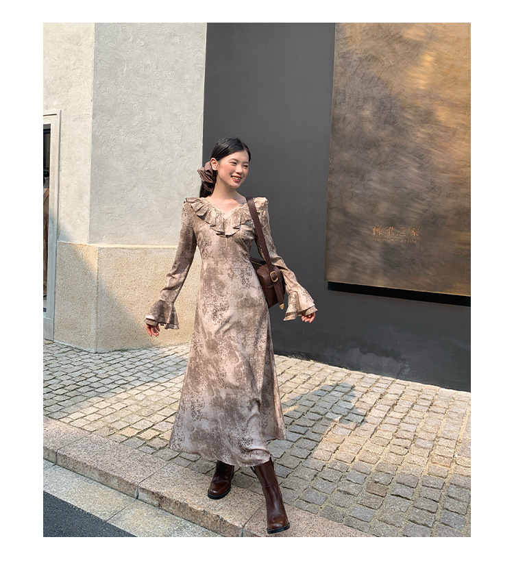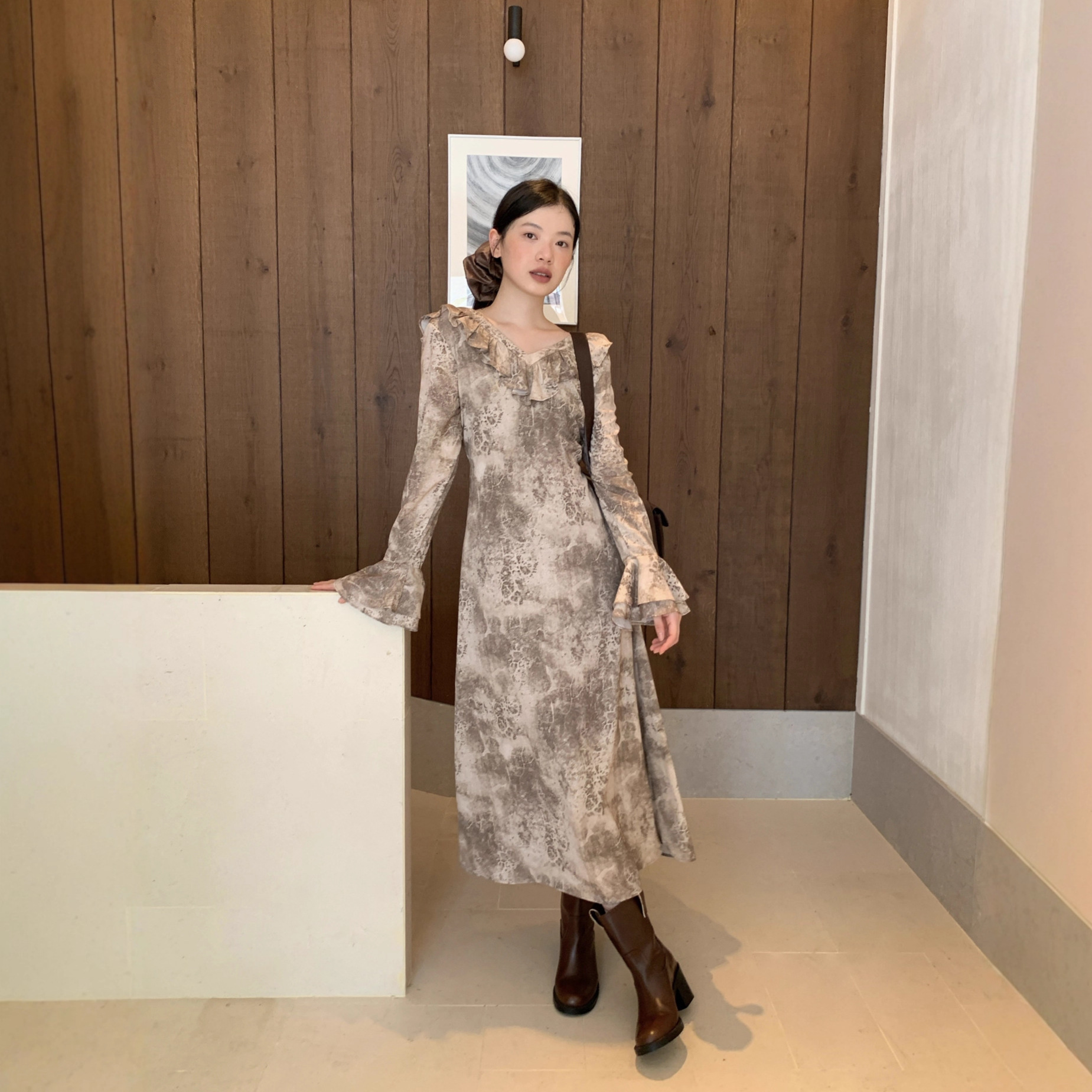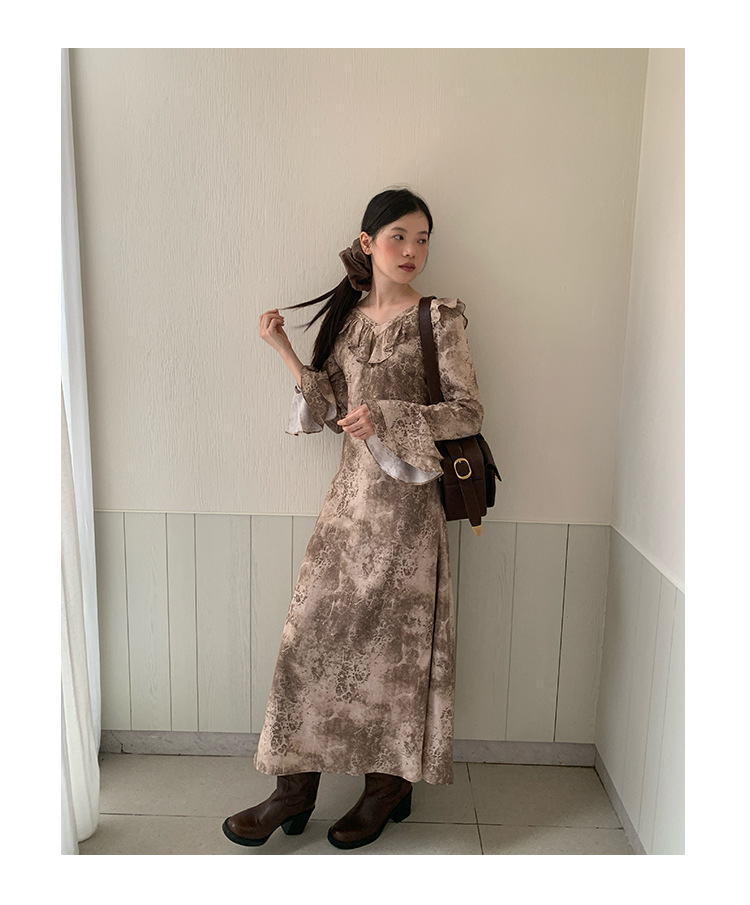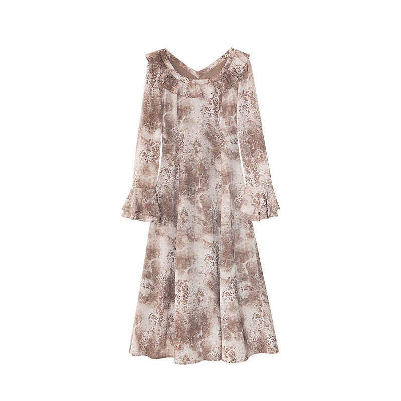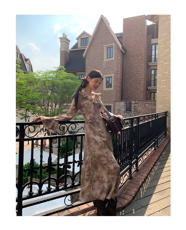 【ワンピース】韓国風 春秋新作 ゆったり大きめサイズ 体型カバー 花柄長袖ミディアムワンピース【SHシリーズ】