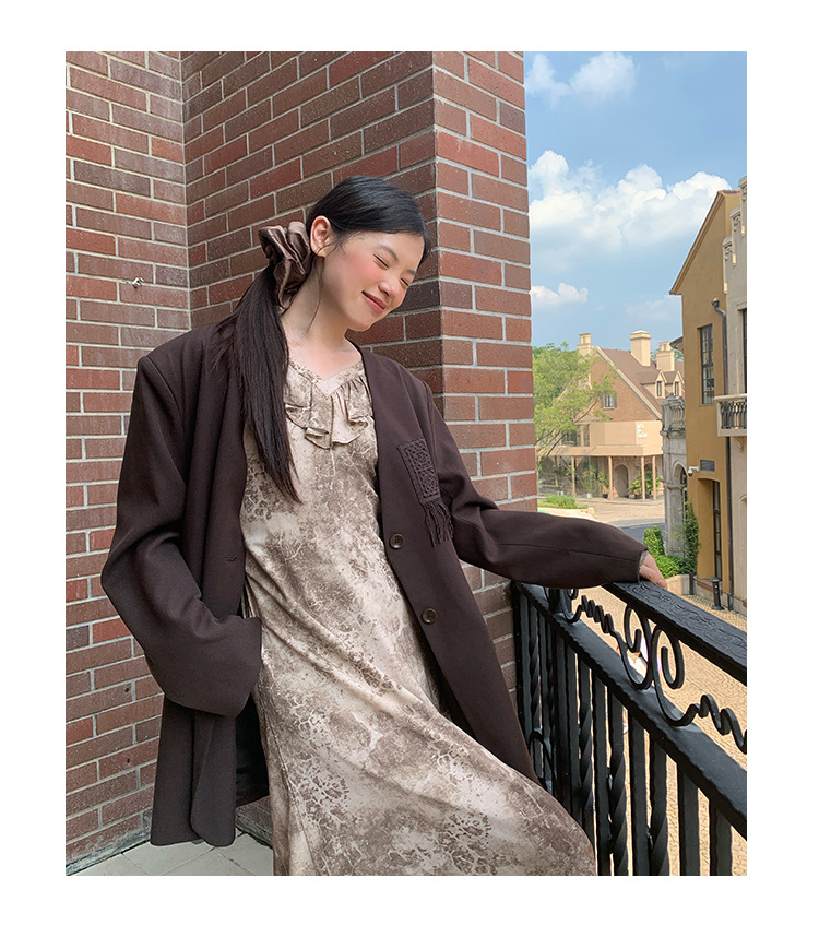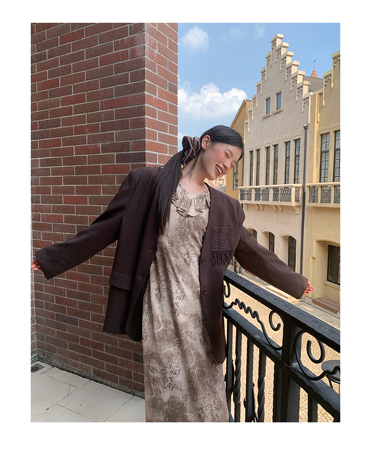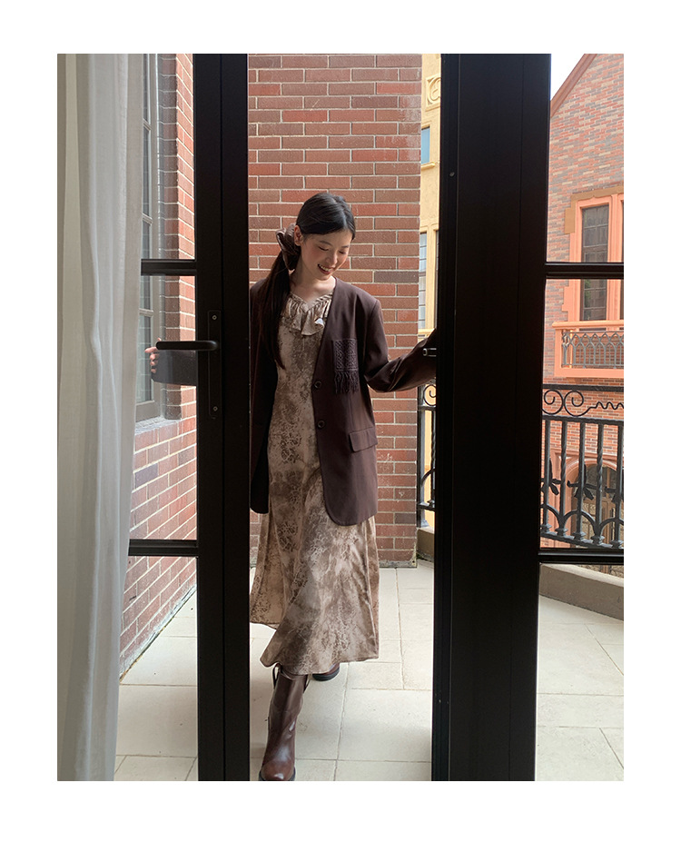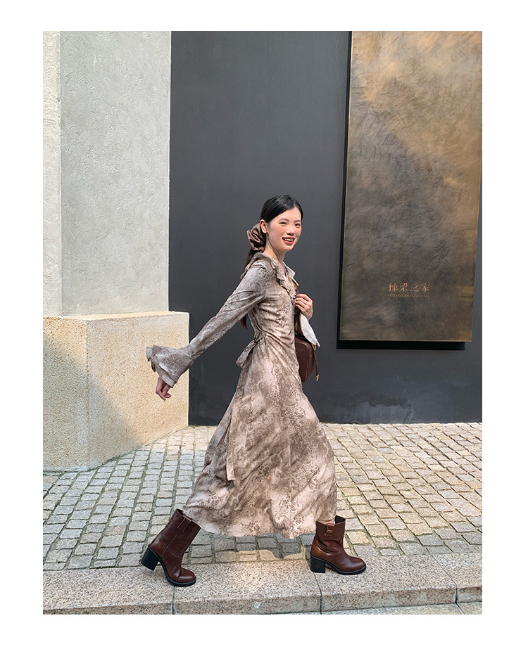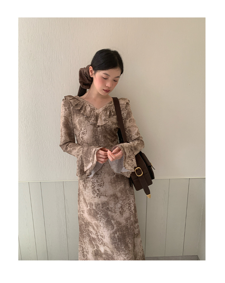 【ワンピース】韓国風 春秋新作 ゆったり大きめサイズ 体型カバー 花柄長袖ミディアムワンピース【SHシリーズ】