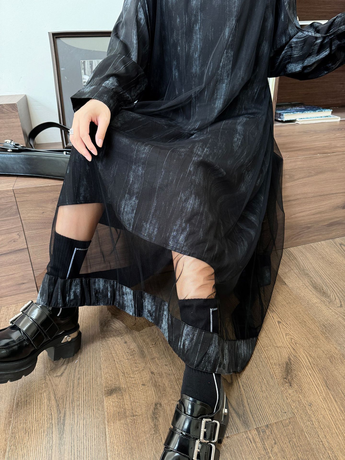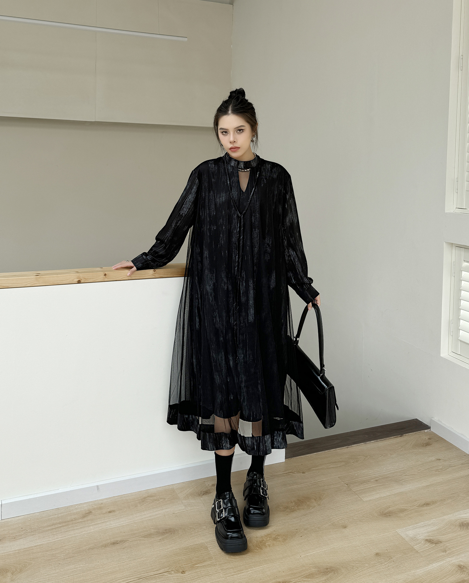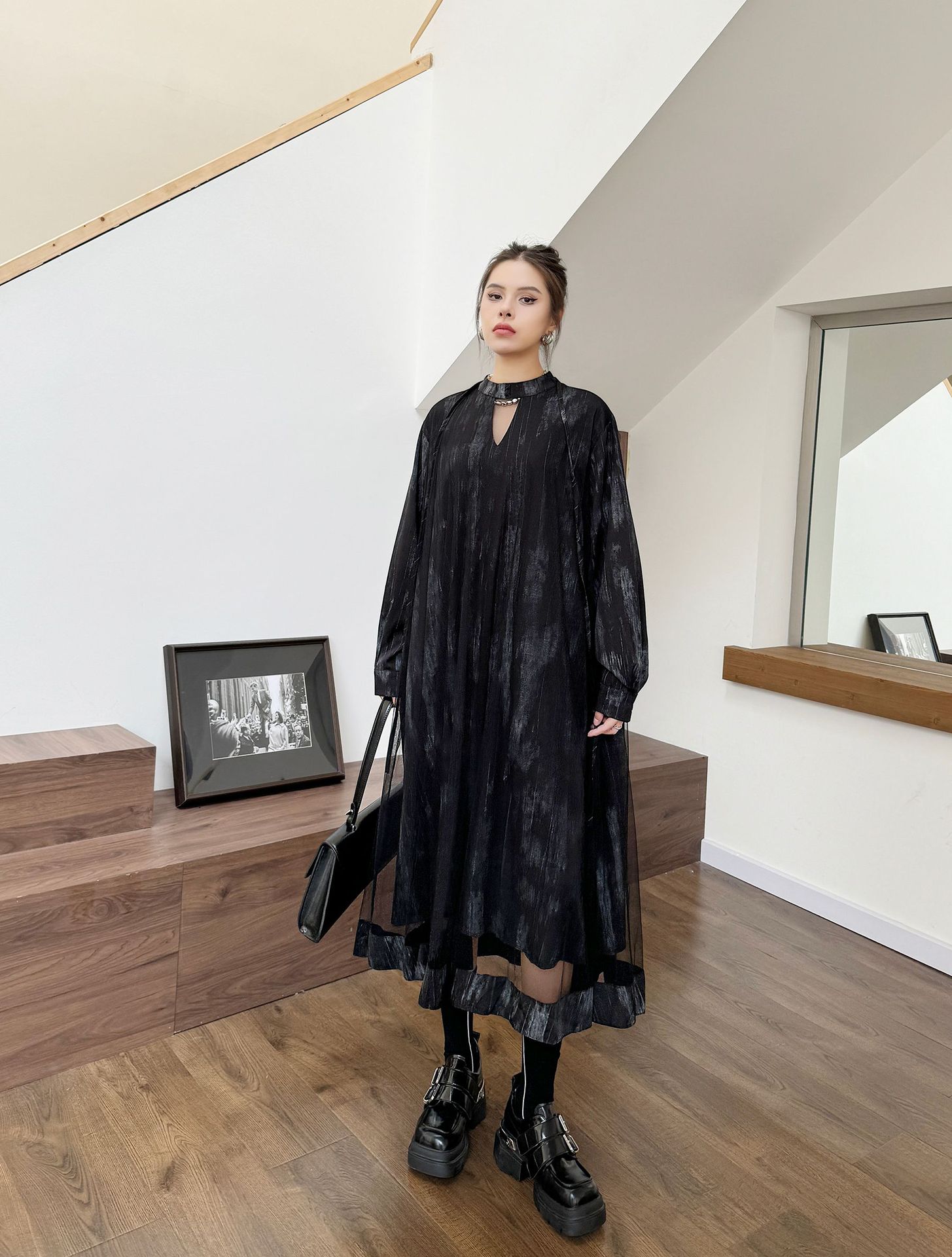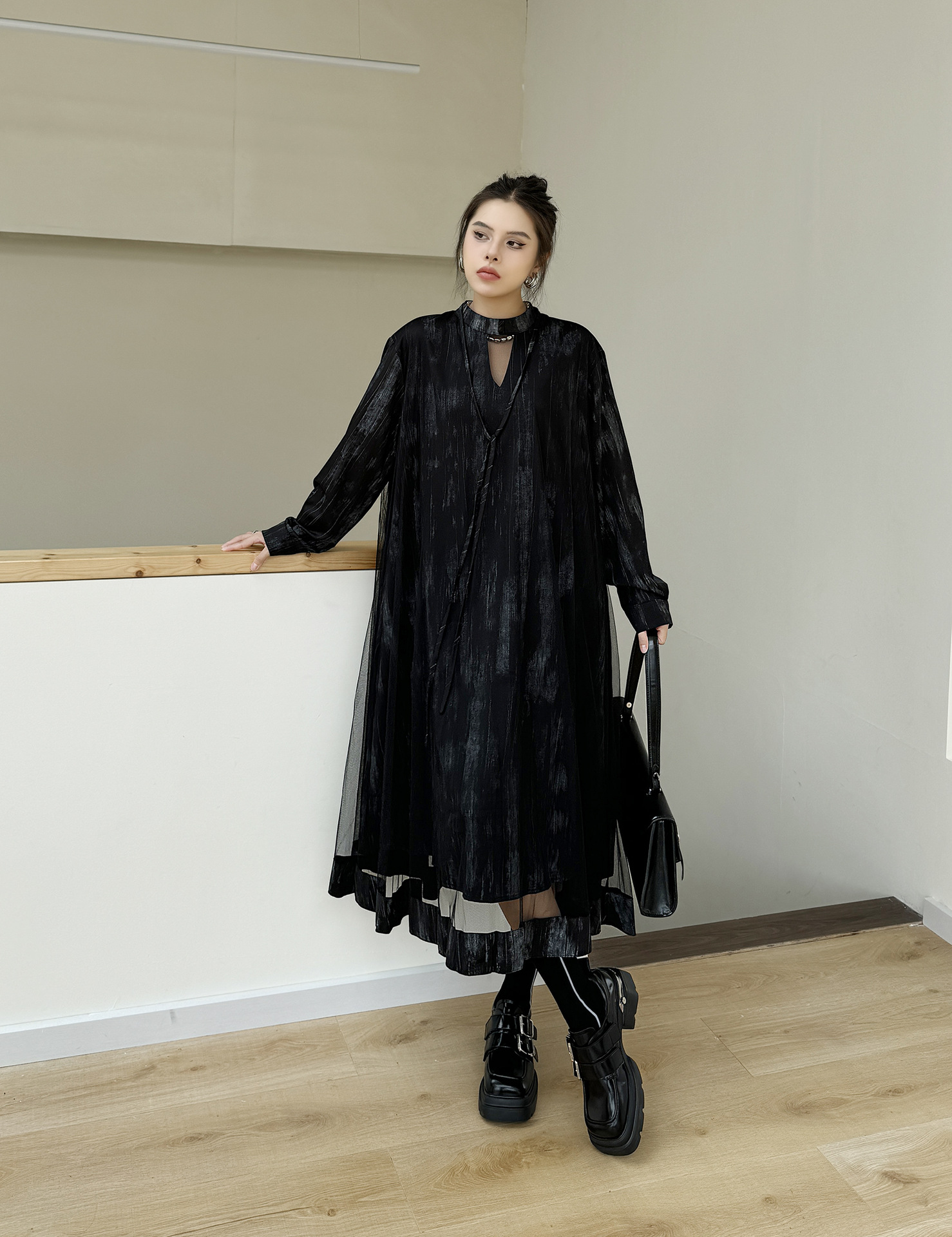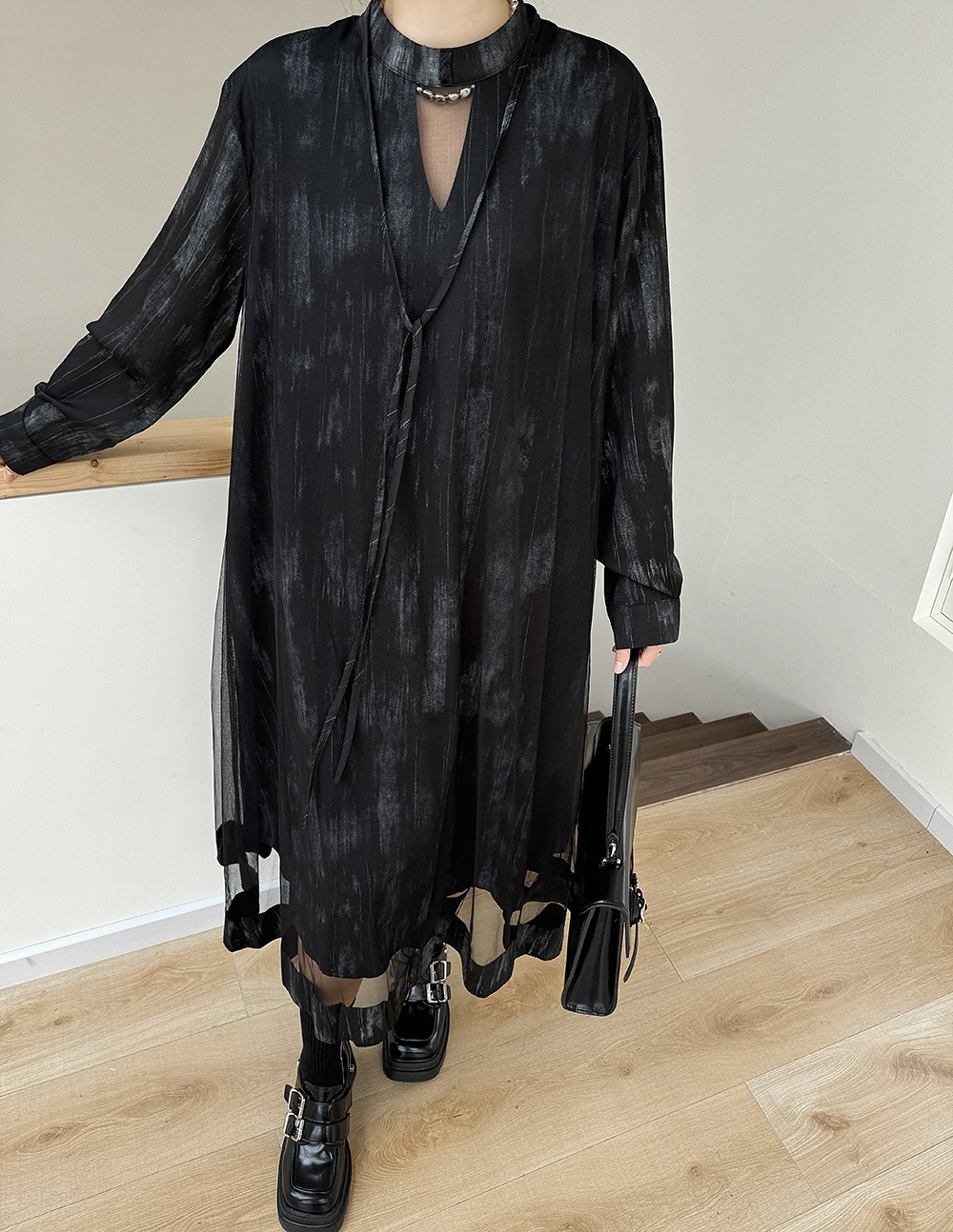 【商品名】【ワンピース】春 秋 冬 チュール切替 ドッキング風 ロング ワンピース 【AHシリーズ】