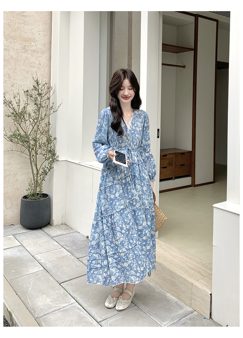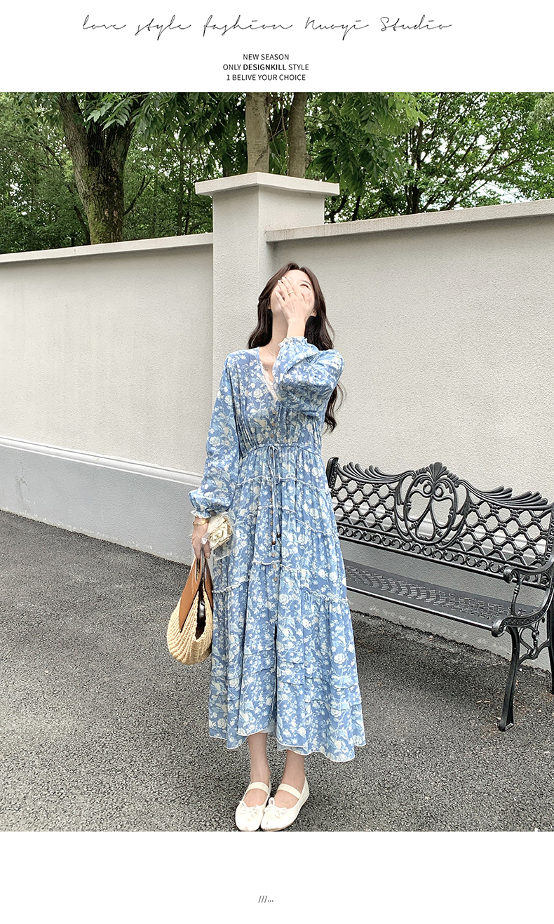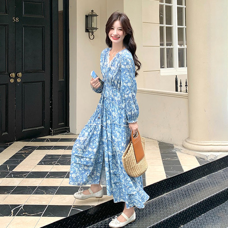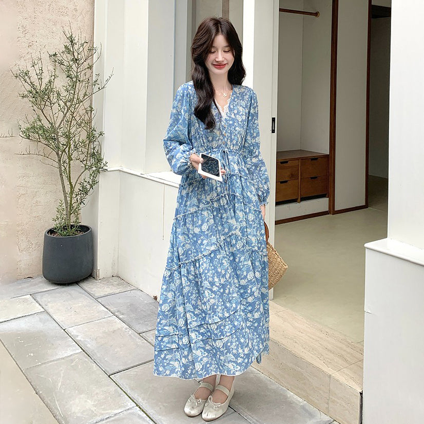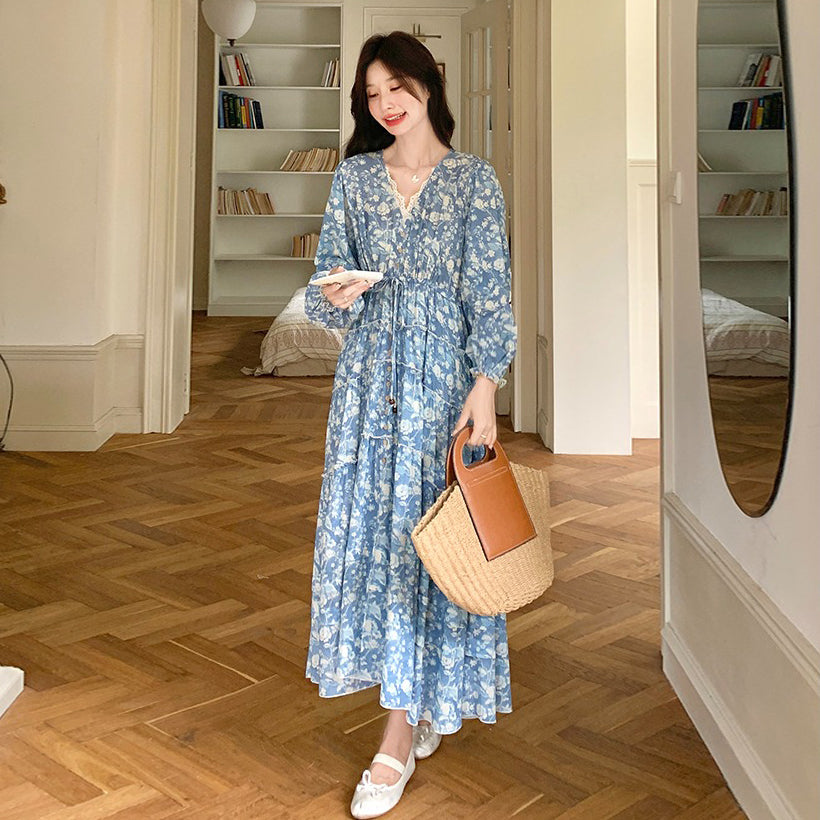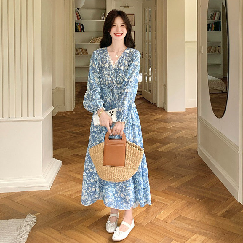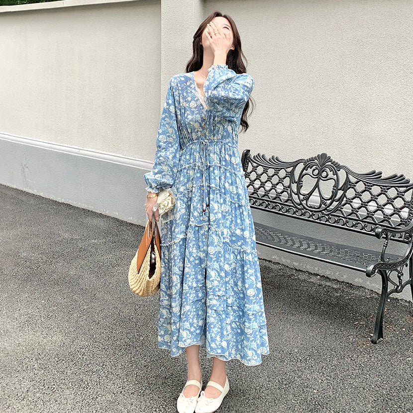 【ワンピース】韓国風 春秋新作 ゆったり大きめサイズ 体型カバー 花柄長袖ミディアムワンピース【SHシリーズ】