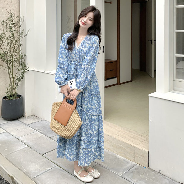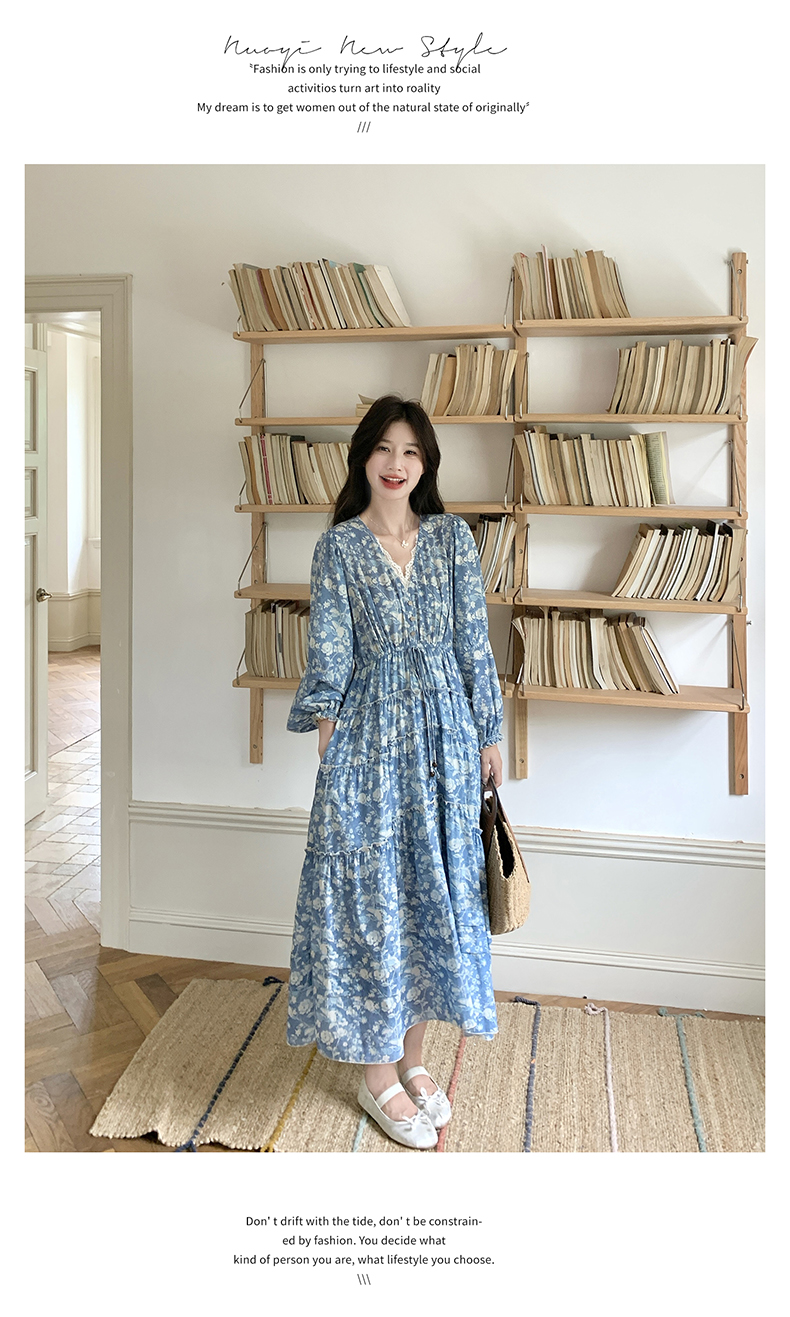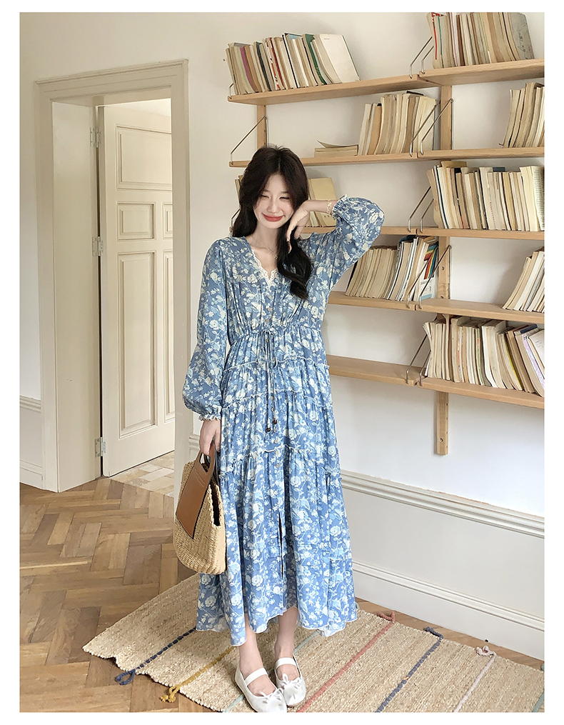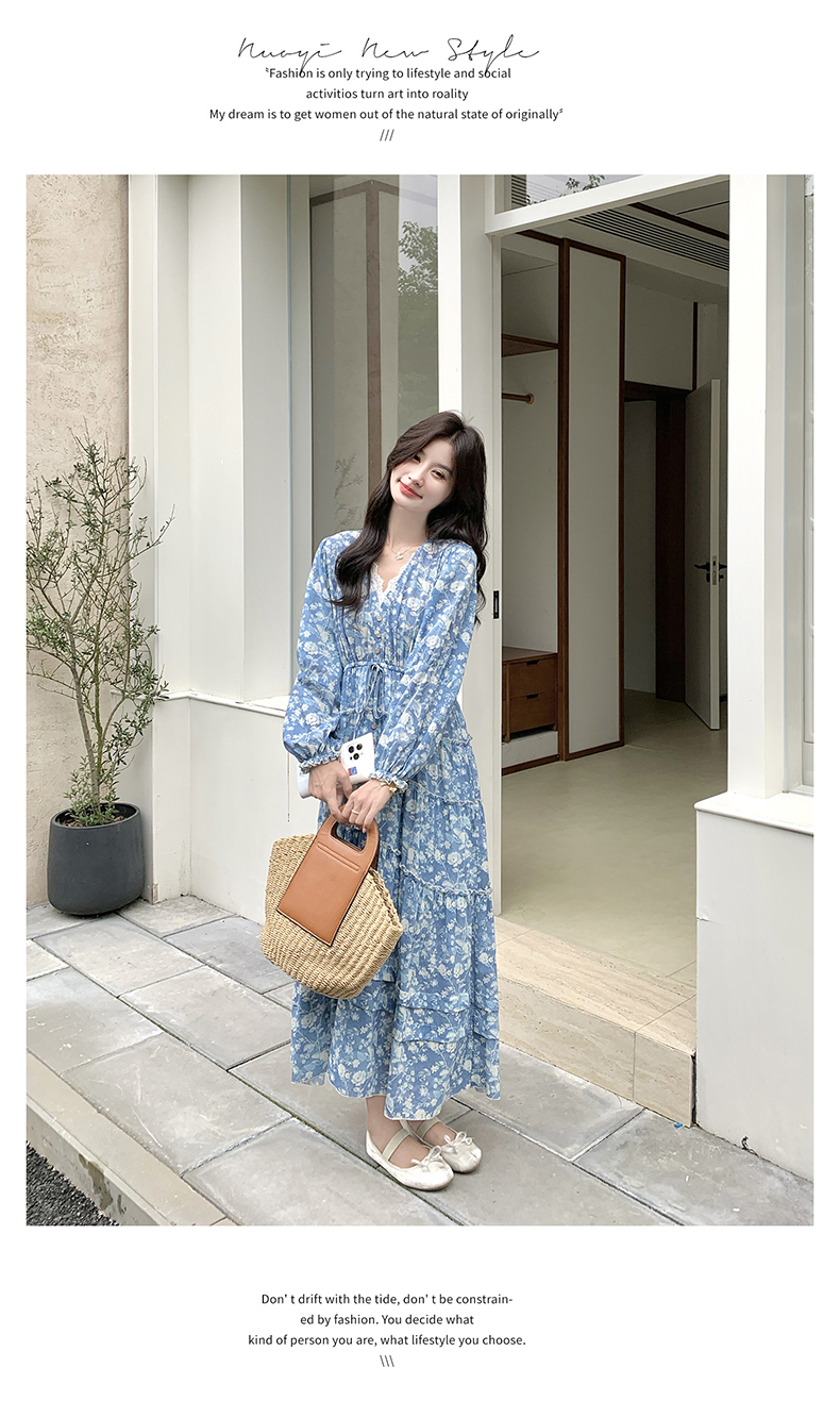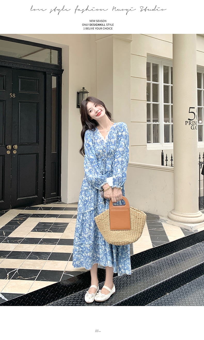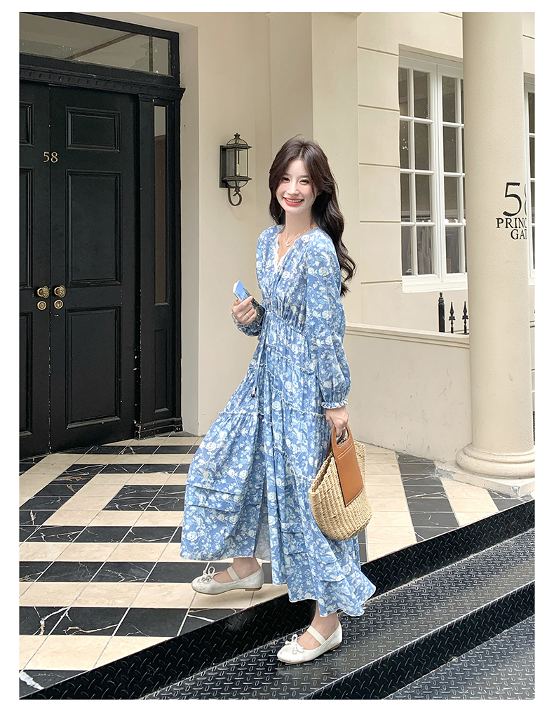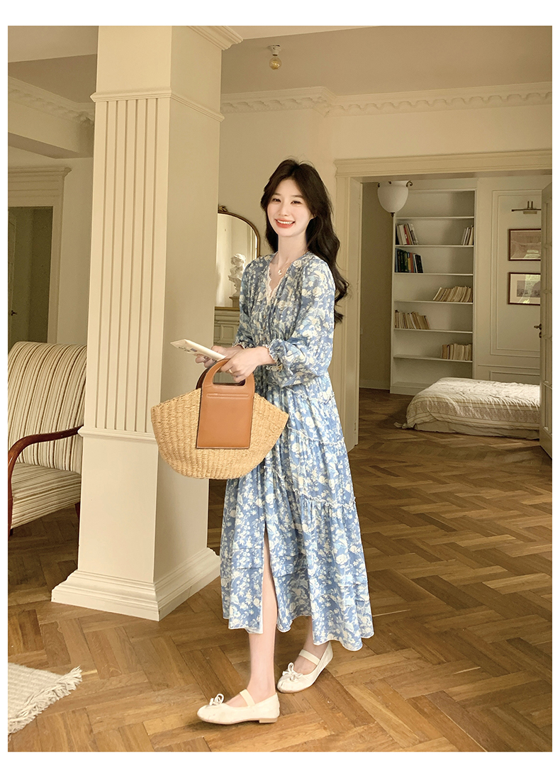 【ワンピース】韓国風 春秋新作 ゆったり大きめサイズ 体型カバー 花柄長袖ミディアムワンピース【SHシリーズ】