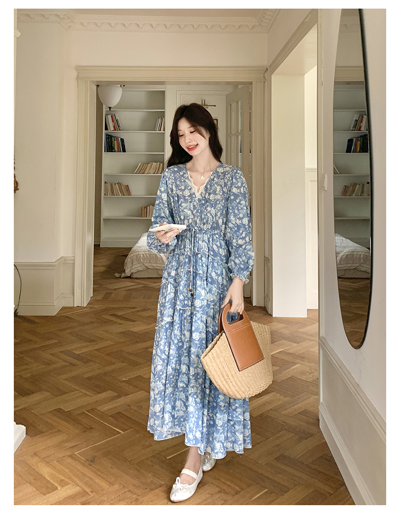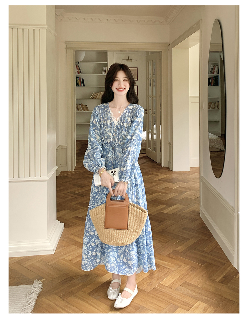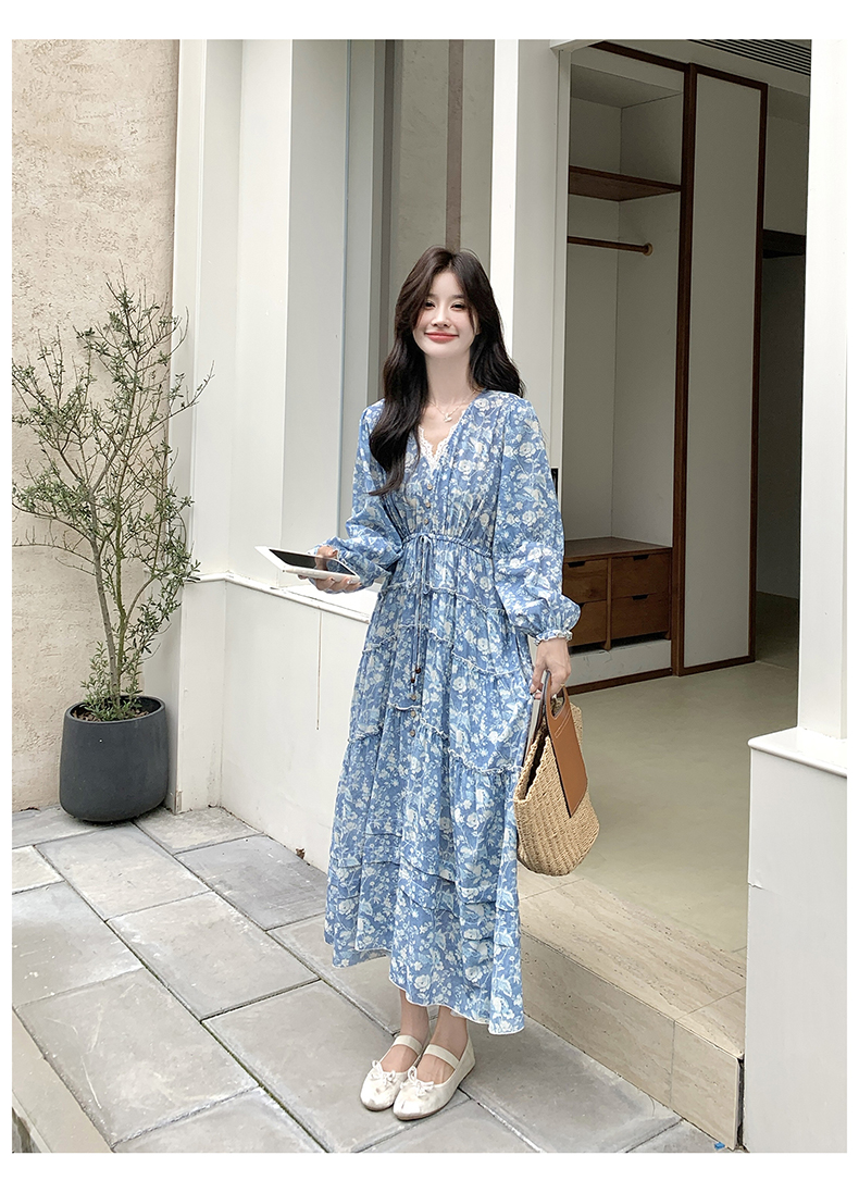 【ワンピース】フレンチエレガント レース Vネック 花柄長袖ワンピース 春秋 優しい雰囲気 超おしゃれ 若見え【SHシリーズ】