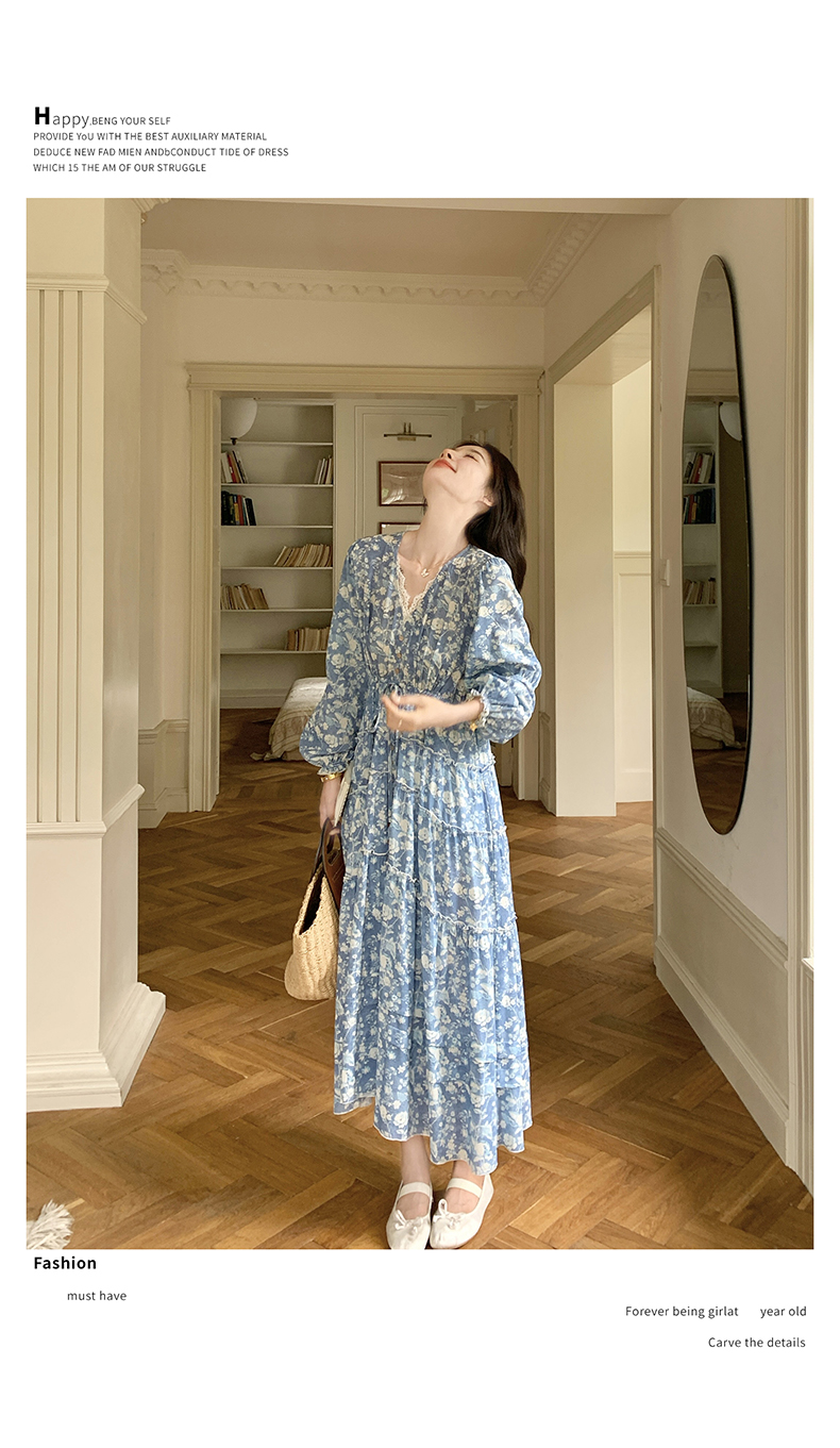 【商品名】【ワンピース】フレンチエレガント レース Vネック 花柄長袖ワンピース 春秋 優しい雰囲気 超おしゃれ 若見え【SHシリーズ】