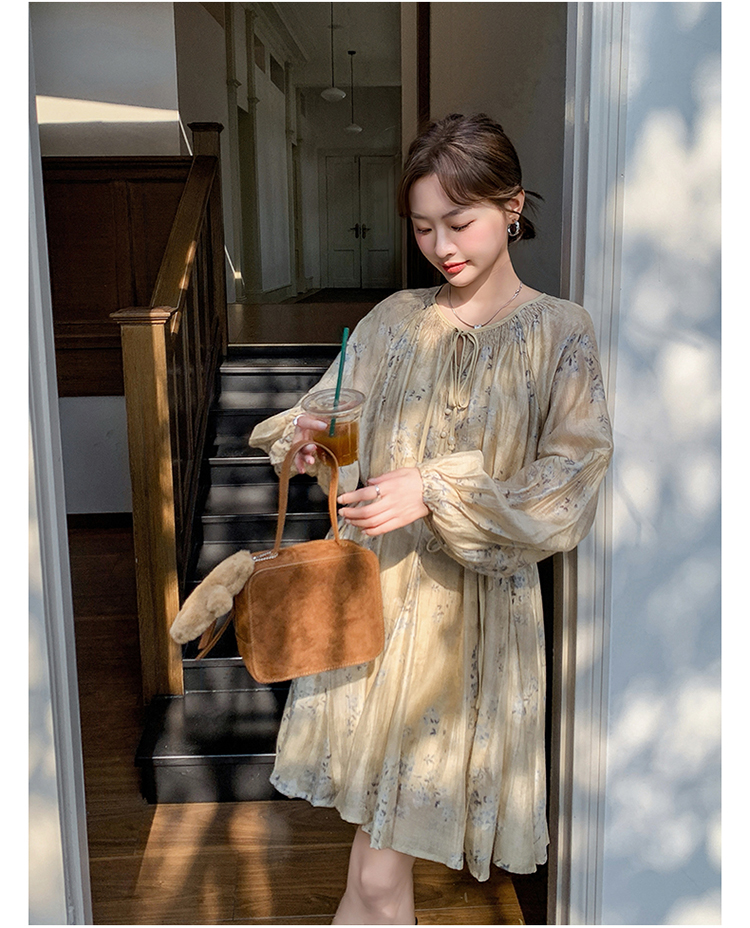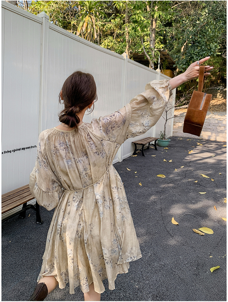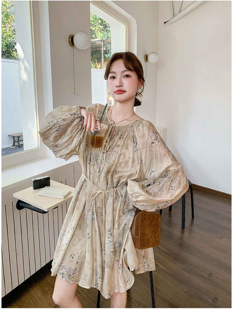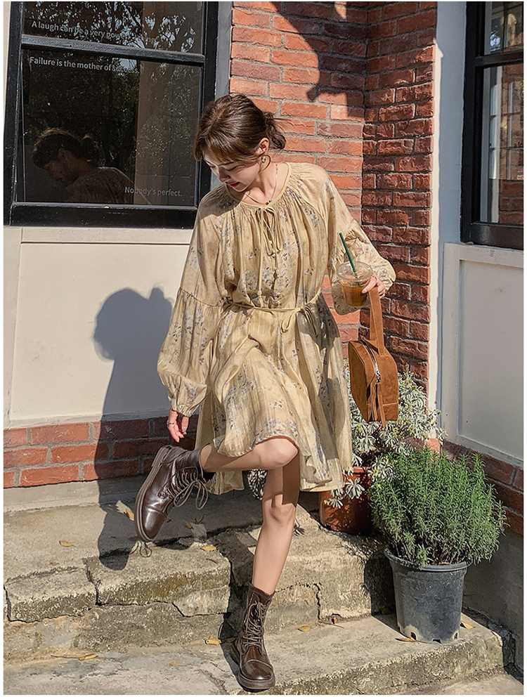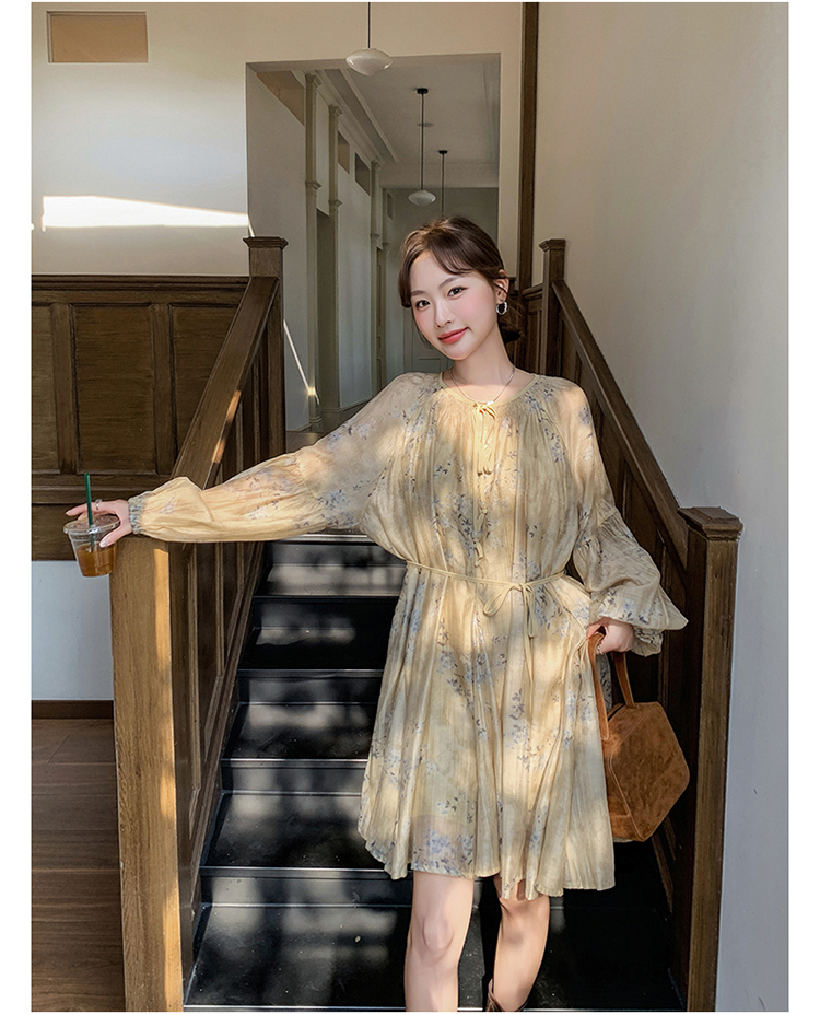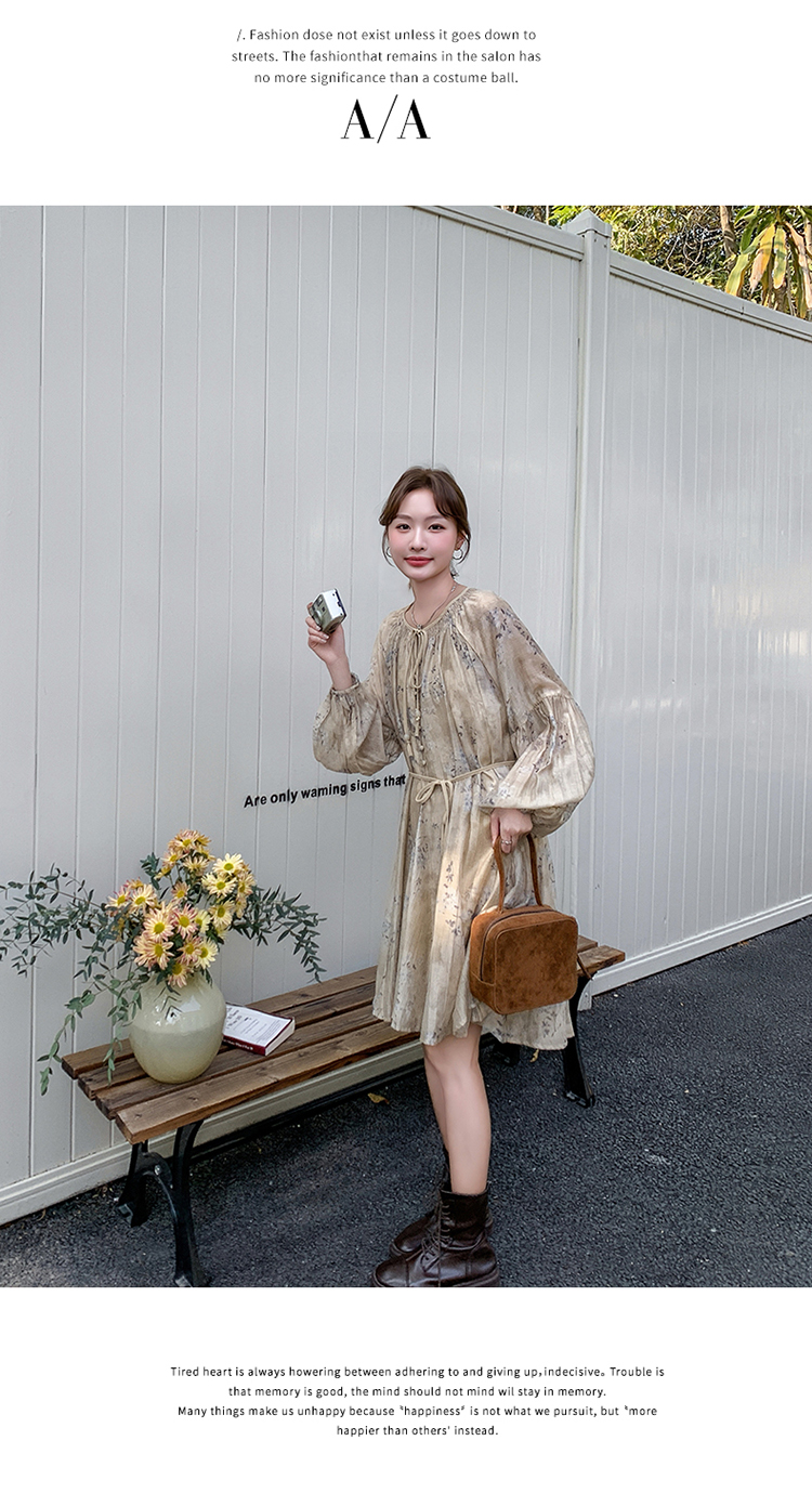 【ワンピース】韓国風 春秋新作 ゆったり大きめサイズ 体型カバー 花柄長袖ミディアムワンピース【SHシリーズ】