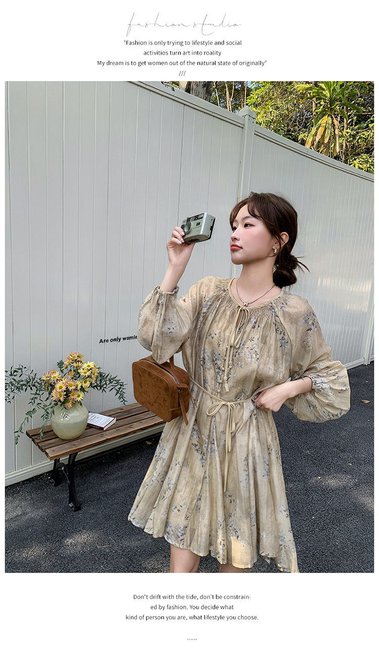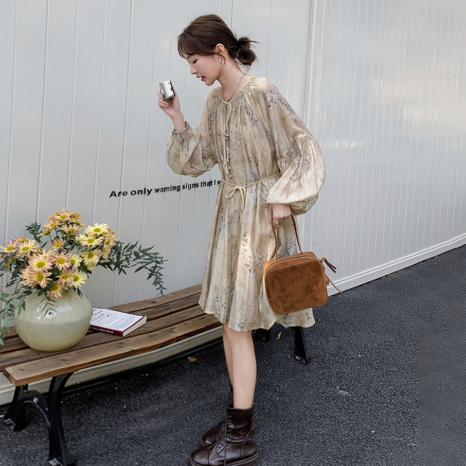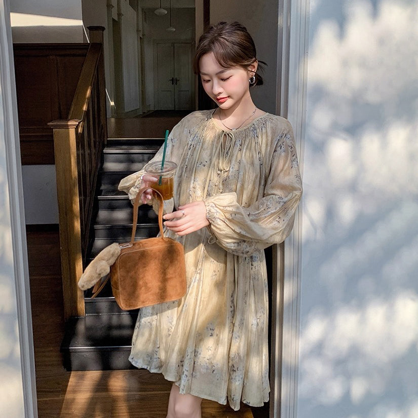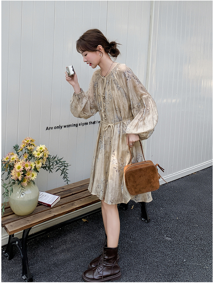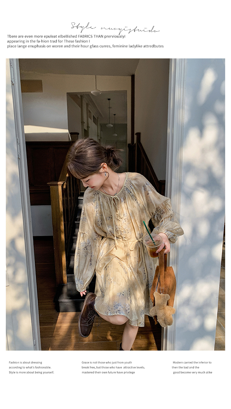 【ワンピース】韓国風 春秋新作 ゆったり大きめサイズ 体型カバー 花柄長袖ミディアムワンピース【SHシリーズ】