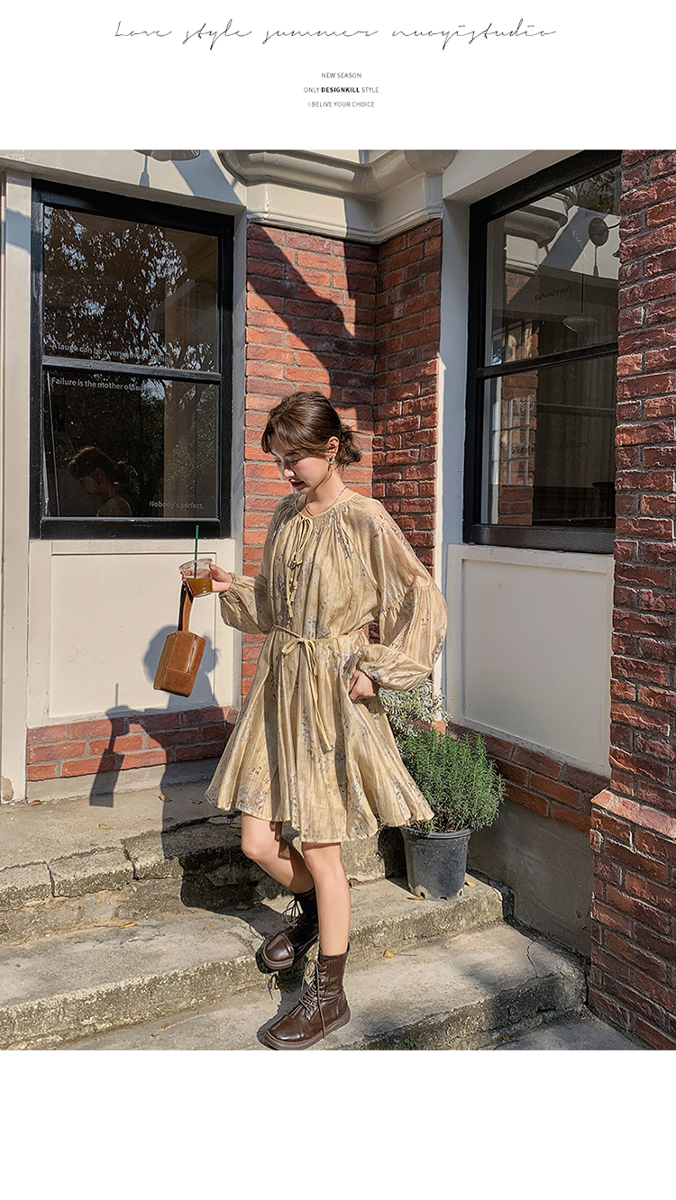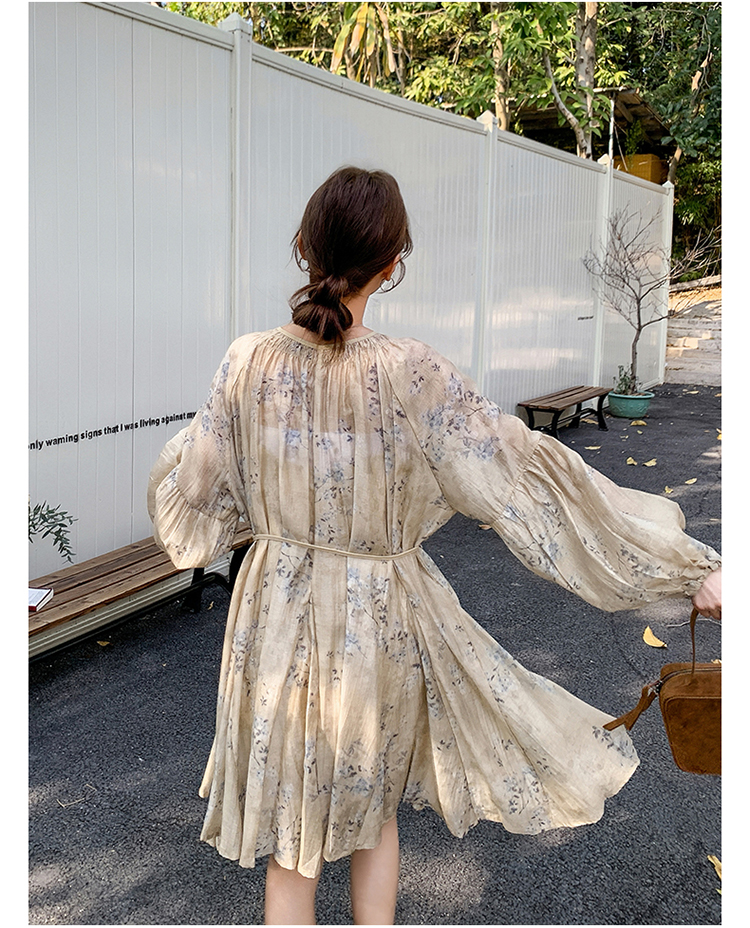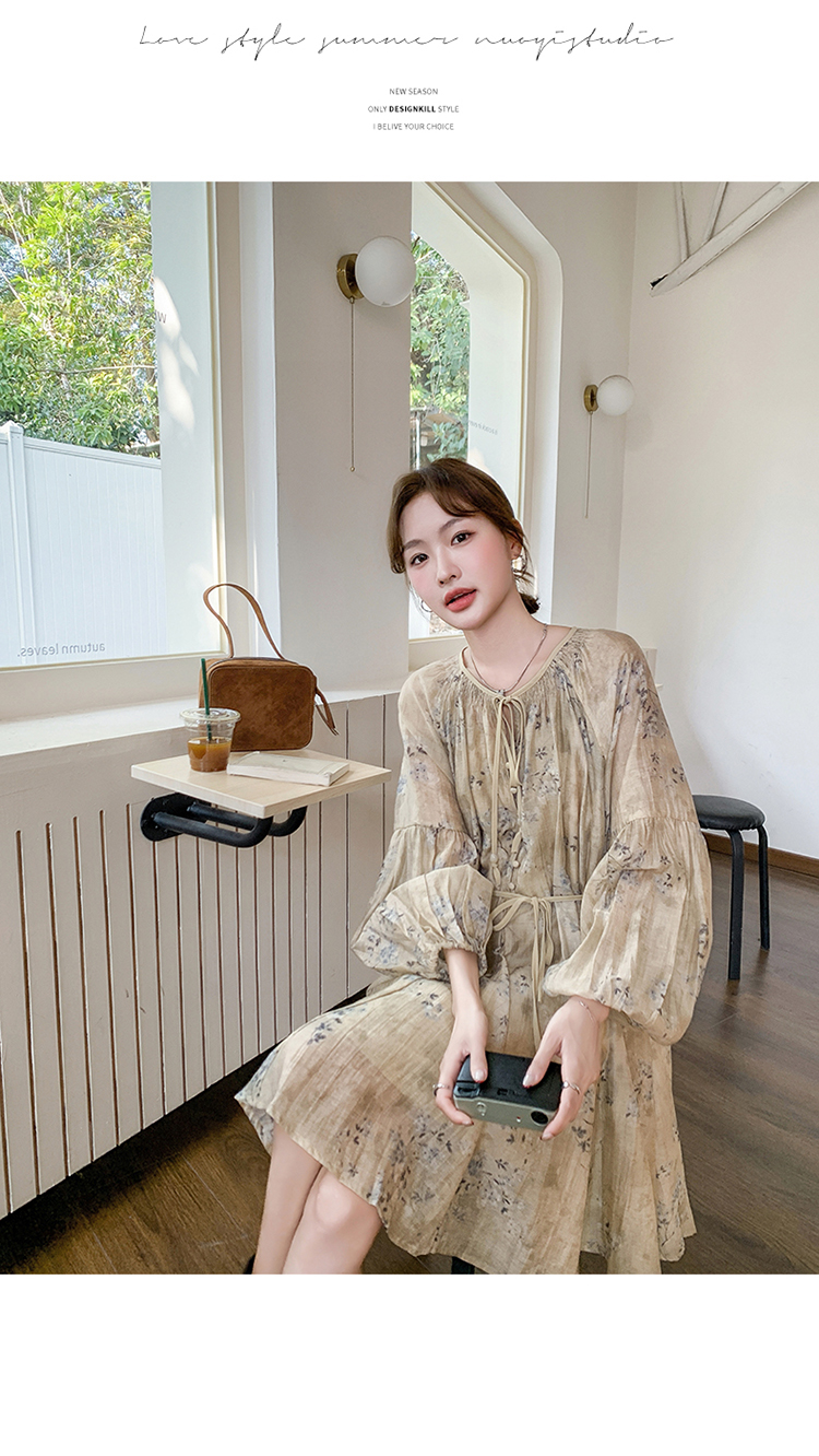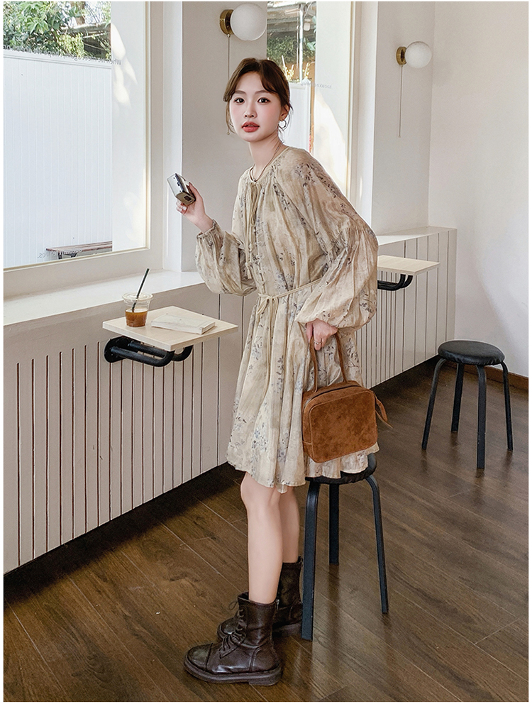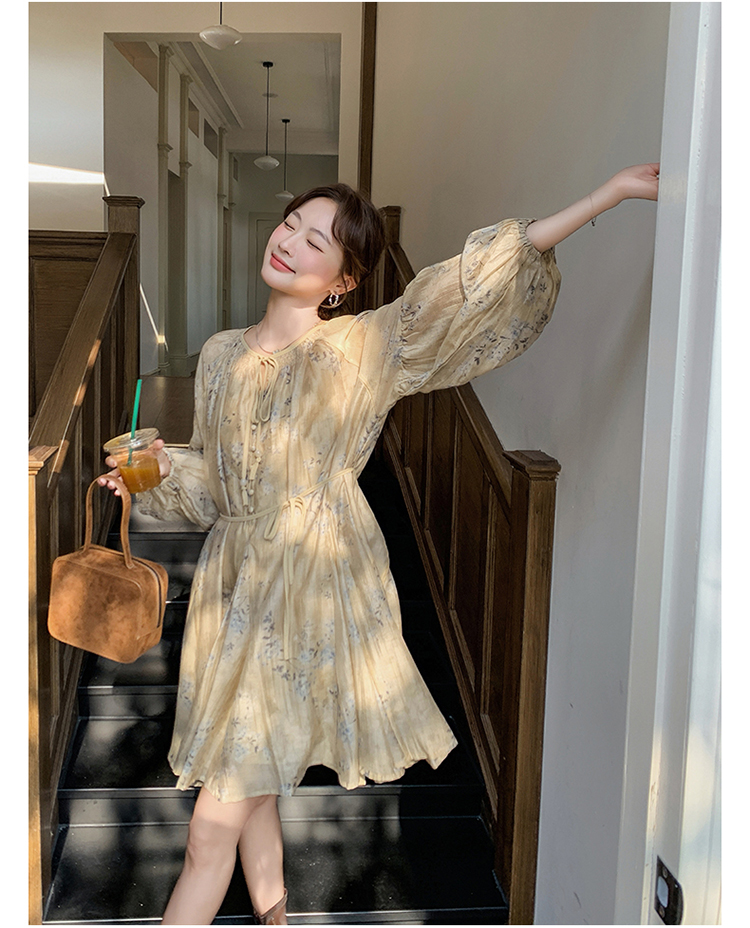 【ワンピース】韓国風 春秋新作 ゆったり大きめサイズ 体型カバー 花柄長袖ミディアムワンピース【SHシリーズ】