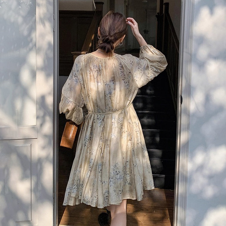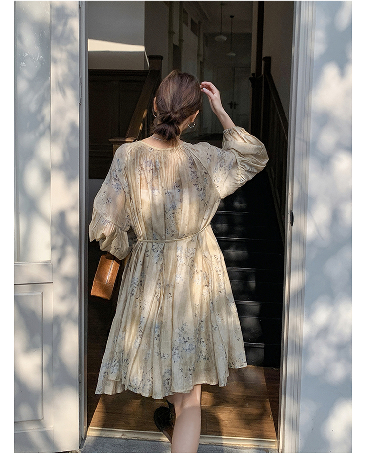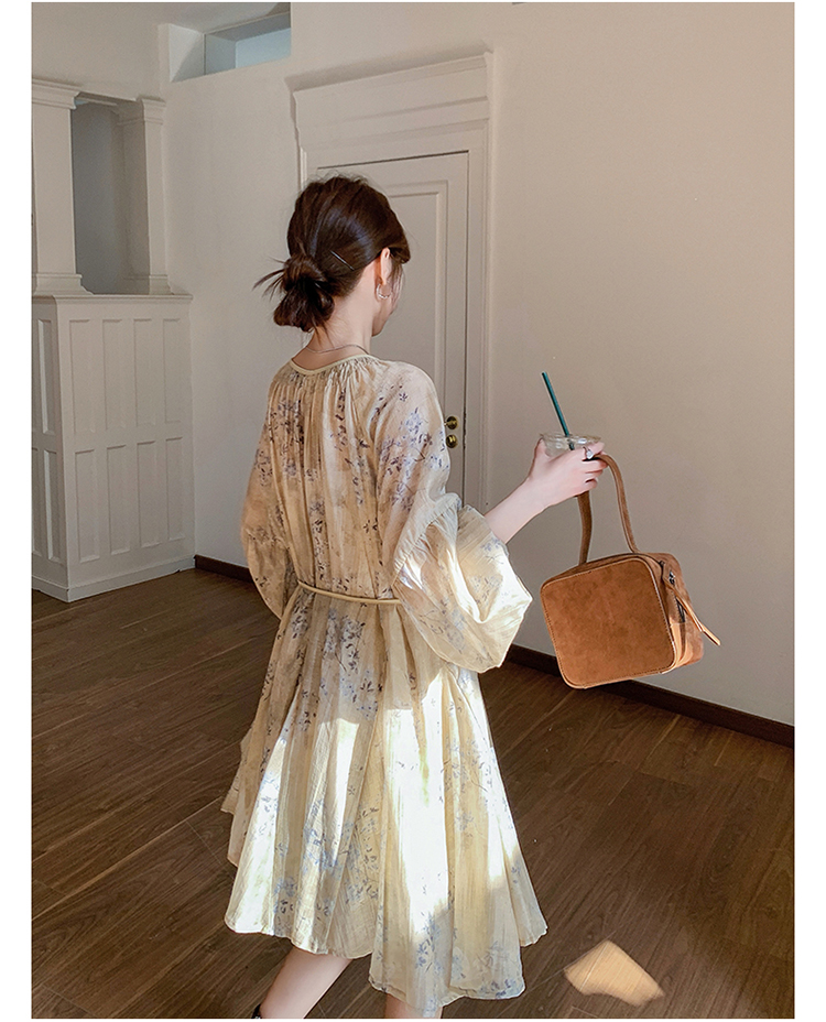 【商品名】【ワンピース】ぼかし花柄ウエストマーク 長袖ワンピース レディース 春秋 リゾート風 フレンチ 【SHシリーズ】