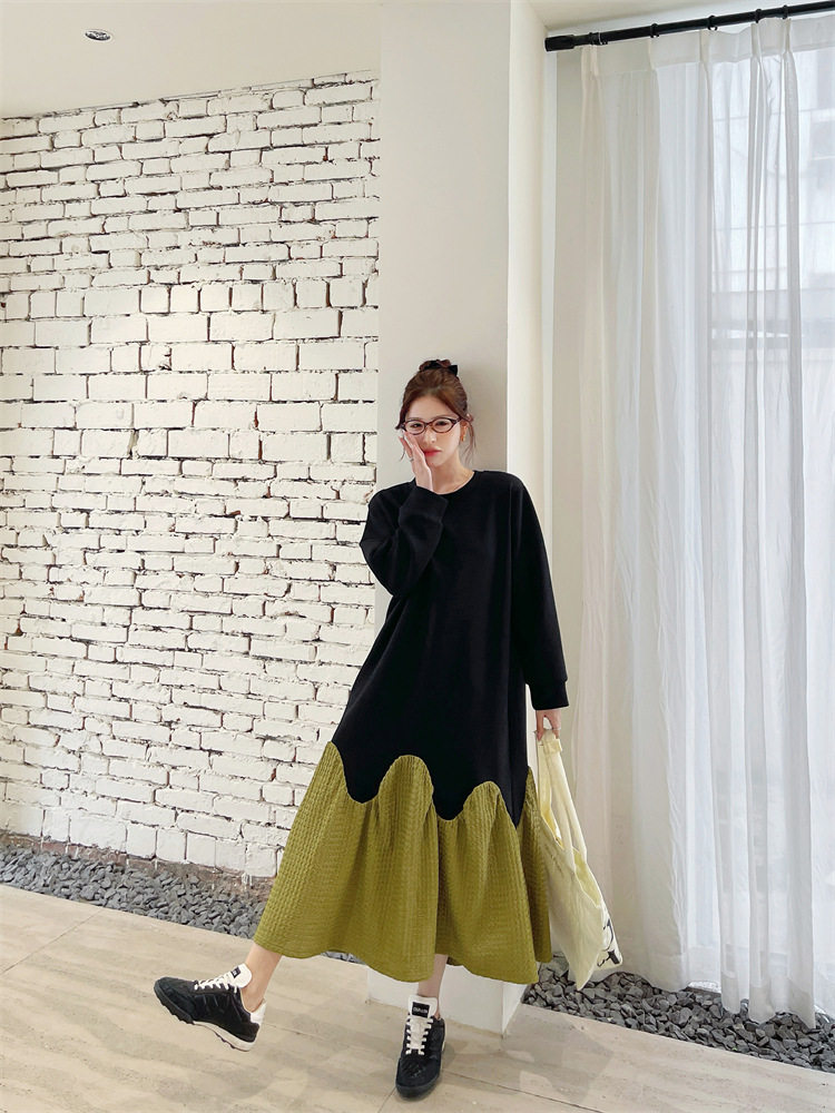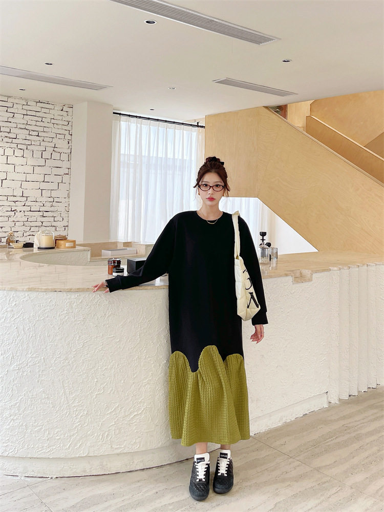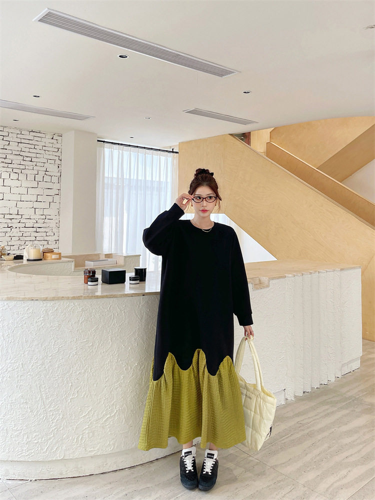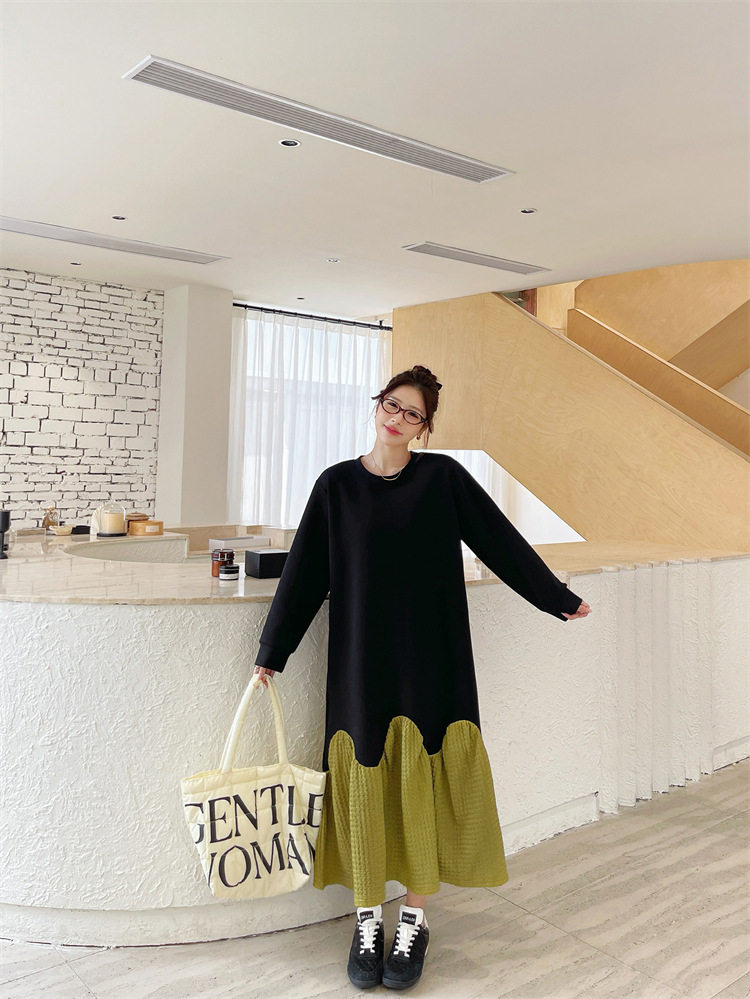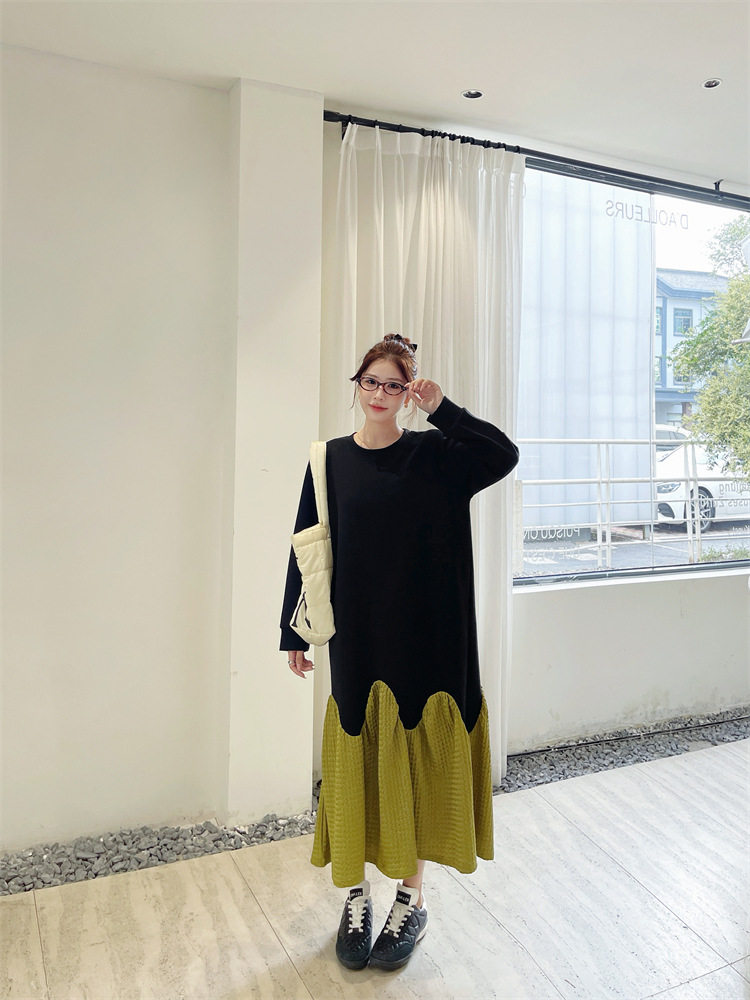 【ワンピース】秋冬切替Aライン 大きいサイズ 体型カバー フリル裾 厚手 長袖ワンピース【JZシリーズ】